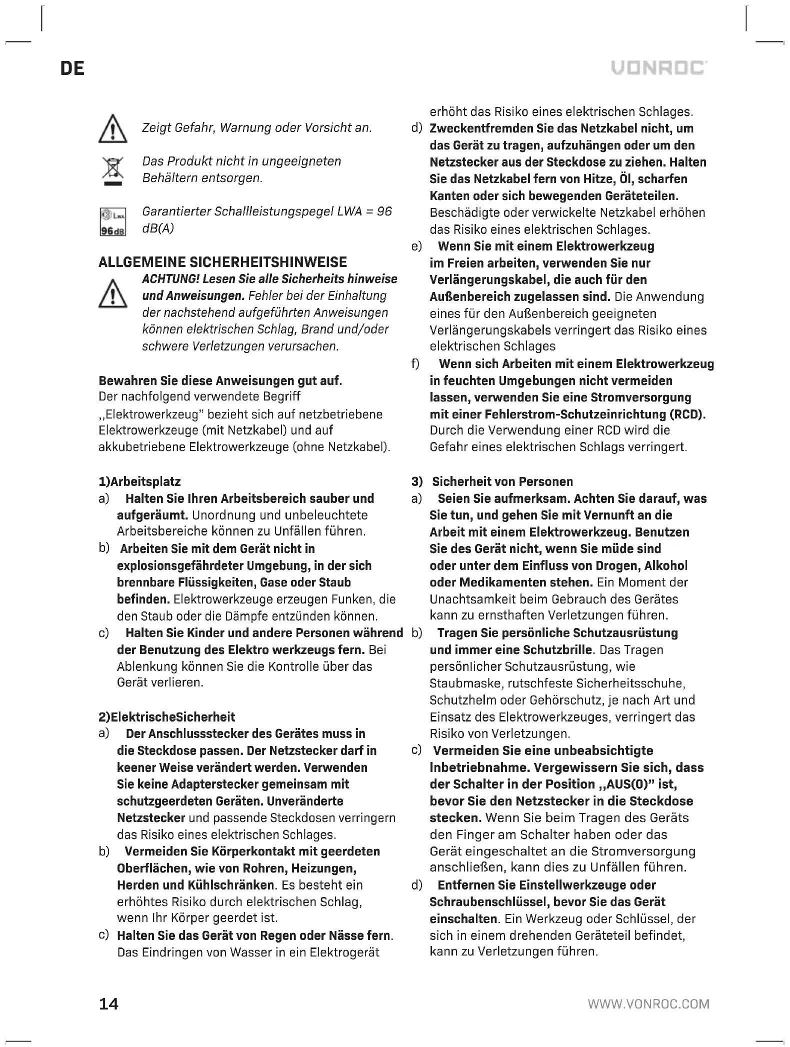Zeigt Gefahr, Warnung oder Vorsicht an. Das Produkt nicht in ungeeigneten Behältern entsorgen. Garantierter Schallleistungspegel LWA = 96 dB(A) ALLGEMEINE SICHERHEITSHINWEISE ACHTUNG! Lesen Sie alle Sicherheits hinweise und Anweisungen. Fehler bei der Einhaltung der nachstehend aufgeführten Anweisungen können elektrischen Schlag, Brand und/oder schwere Verletzungen verursachen. Bewahren Sie diese Anweisungen gut auf. Der nachfolgend verwendete Begriff ,,Elektrowerkzeug” bezieht sich auf netzbetriebene Elektrowerkzeuge (mit Netzkabel) und auf akkubetriebene Elektrowerkzeuge (ohne Netzkabel).