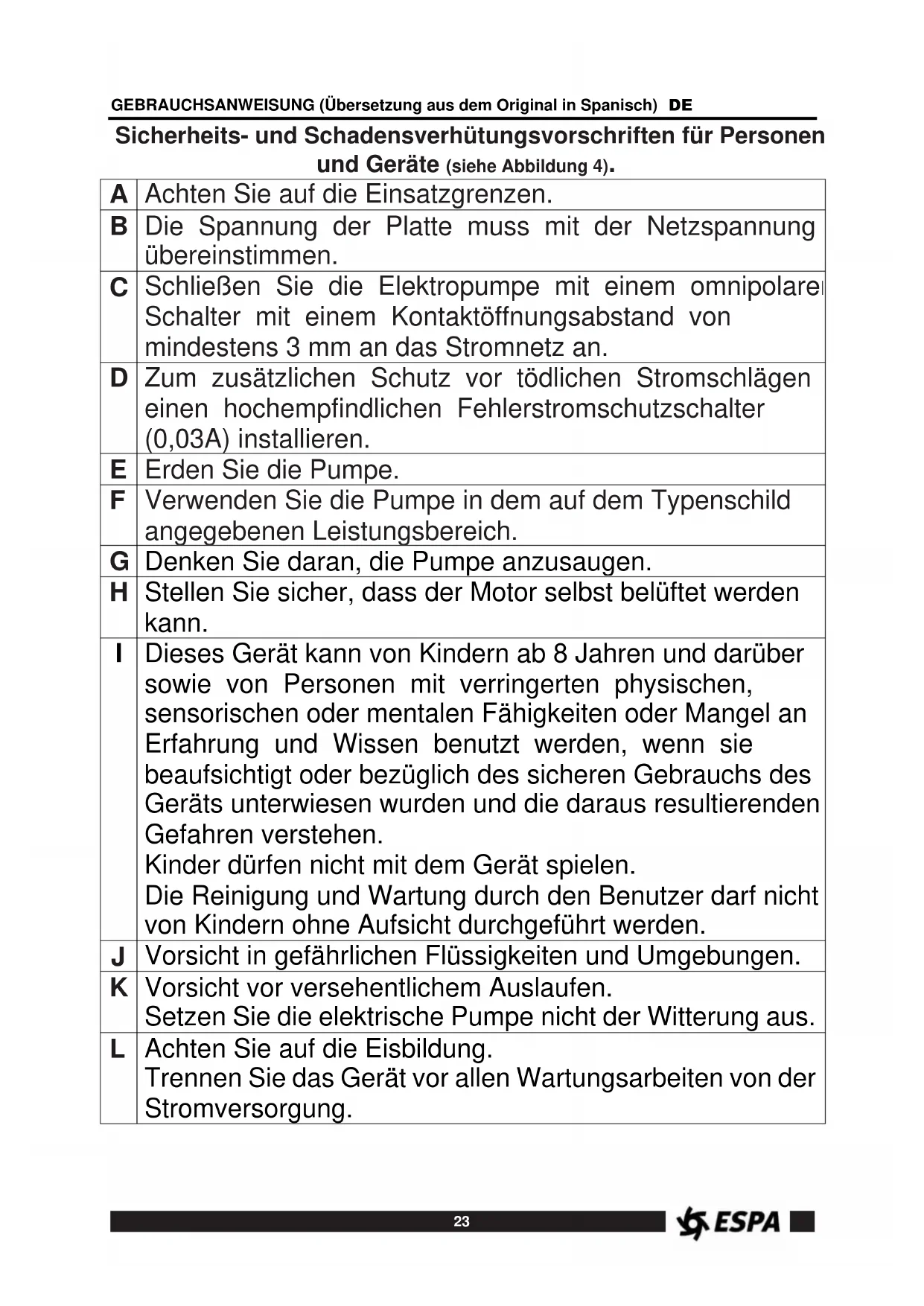 Unsere Pumpen sind wartungsfrei. Achten Sie bei Frost darauf, die Leitungen zu entleeren. Wenn die Pumpe über einen längeren Zeitraum nicht benutzt wird, empfiehlt es sich, sie zu zerlegen und an einem trockenen und belüfteten Ort zu lagern. WARNUNG: Im Falle einer Störung darf die Pumpe nur von einem autorisierten Servicetechniker bedient werden. Die Liste der amtlichen technischen Dienste finden Sie unter www. espa.com.27 GEBRAUCHSANWEISUNG (Übersetzung aus dem Original in Spanisch) DE
