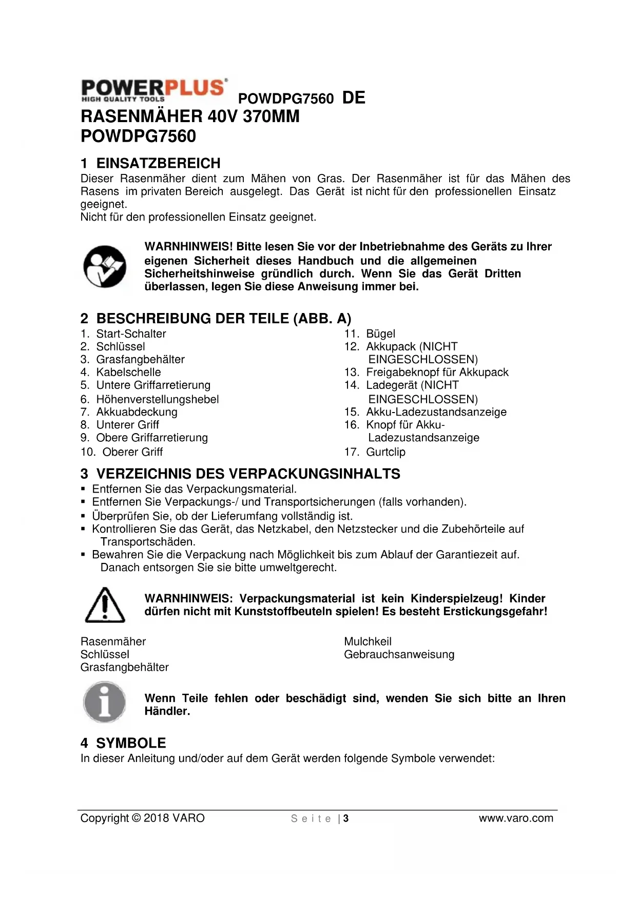 - Bewahren Sie die Verpackung nach Möglichkeit bis zum Ablauf der Garantiezeit auf. Danach entsorgen Sie sie bitte umweltgerecht. WARNHINWEIS: Verpackungsmaterial ist kein Kinderspielzeug! Kinder dürfen nicht mit Kunststoffbeuteln spielen! Es besteht Erstickungsgefahr! Rasenmäher Schlüssel Grasfangbehälter Mulchkeil Gebrauchsanweisung Wenn Teile fehlen oder beschädigt sind, wenden Sie sich bitte an Ihren Händler. 4 SYMBOLE In dieser Anleitung und/oder auf dem Gerät werden folgende Symbole verwendet:POWDPG7560 DE Copyright © 2018 VARO S e i t e | 4 www.varo.com