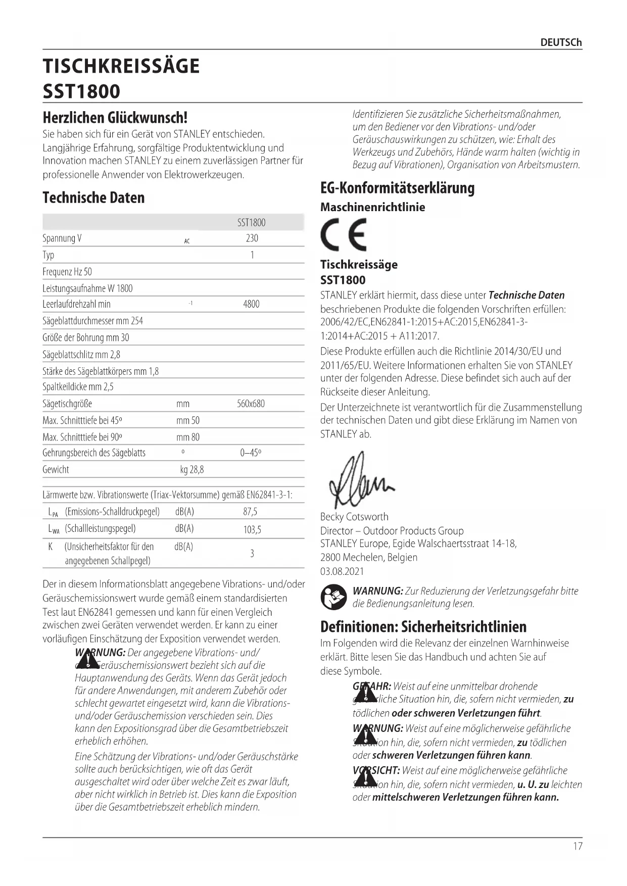 ADVARSEL: Da andet tilbehør end det, der tilbydes af STANLEY , ikke er blevet testet med dette produkt, kan det være farligt at bruge sådan tilbehør med dette værktøj. For at reducere risikoen for personskade bør kun tilbehør anbefalet af STANLEY anvendes med detteprodukt. Ret henvendelse til din forhandler vedr. yderligere informationer omkring det passendetilbehør. Hold ventilationshullerne rene og rengør med jævne mellemrum huset med en renklud. Rengør regelmæssigtstøvopsamlingssystemet.17 DEUTSCh WARNUNG: Zur Reduzierung der Verletzungsgefahr bitte die Bedienungsanleitunglesen. Definitionen: Sicherheitsrichtlinien Im Folgenden wird die Relevanz der einzelnen Warnhinweise erklärt. Bitte lesen Sie das Handbuch und achten Sie auf dieseSymbole. GEFAHR: Weist auf eine unmittelbar drohende gefährliche Situation hin, die, sofern nicht vermieden, zu tödlichen oder schweren Verletzungenführt. WARNUNG: Weist auf eine möglicherweise gefährliche Situation hin, die, sofern nicht vermieden, zu tödlichen oder schweren Verletzungen führenkann. VORSICHT: Weist auf eine möglicherweise gefährliche Situation hin, die, sofern nicht vermieden, u. U. zu leichten oder mittelschweren Verletzungen führenkann. EG‑Konformitätserklärung Maschinenrichtlinie Tischkreissäge SST1800 STANLEY erklärt hiermit, dass diese unter Technische Daten beschriebenen Produkte die folgenden Vorschriften erfüllen: 2006/42/EC, EN62841‑1:2015+AC:2015, EN62841‑3‑1:2014+AC:2015 + A11:2017.Diese Produkte erfüllen auch die Richtlinie 2014/30/EU und 2011/65/EU. Weitere Informationen erhalten Sie von STANLEY unter der folgenden Adresse. Diese befindet sich auch auf der Rückseite dieserAnleitung.Der Unterzeichnete ist verantwortlich für die Zusammenstellung der technischen Daten und gibt diese Erklärung im Namen von STANLEYab.Becky Cotsworth Director – Outdoor Products Group STANLEY Europe, Egide Walschaertsstraat 14‑18, 2800Mechelen, Belgien 03.08.2021Identifizieren Sie zusätzliche Sicherheitsmaßnahmen, um den Bediener vor den Vibrations- und/oder Geräuschauswirkungen zu schützen, wie: Erhalt des Werkzeugs und Zubehörs, Hände warm halten (wichtig in Bezug auf Vibrationen), Organisation vonArbeitsmustern.Der in diesem Informationsblatt angegebene Vibrations‑ und/oder Geräuschemissionswert wurde gemäß einem standardisierten Test laut EN62841 gemessen und kann für einen Vergleich zwischen zwei Geräten verwendet werden. Er kann zu einer vorläufigen Einschätzung der Exposition verwendetwerden. WARNUNG: Der angegebene Vibrations- und/oder Geräuschemissionswert bezieht sich auf die Hauptanwendung des Geräts. Wenn das Gerät jedoch für andere Anwendungen, mit anderem Zubehör oder schlecht gewartet eingesetzt wird, kann die Vibrations- und/oder Geräuschemission verschieden sein. Dies kann den Expositionsgrad über die Gesamtbetriebszeit erheblicherhöhen.Eine Schätzung der Vibrations- und/oder Geräuschstärke sollte auch berücksichtigen, wie oft das Gerät ausgeschaltet wird oder über welche Zeit es zwar läuft, aber nicht wirklich in Betrieb ist. Dies kann die Exposition über die Gesamtbetriebszeit erheblichmindern.SST1800Spannung V