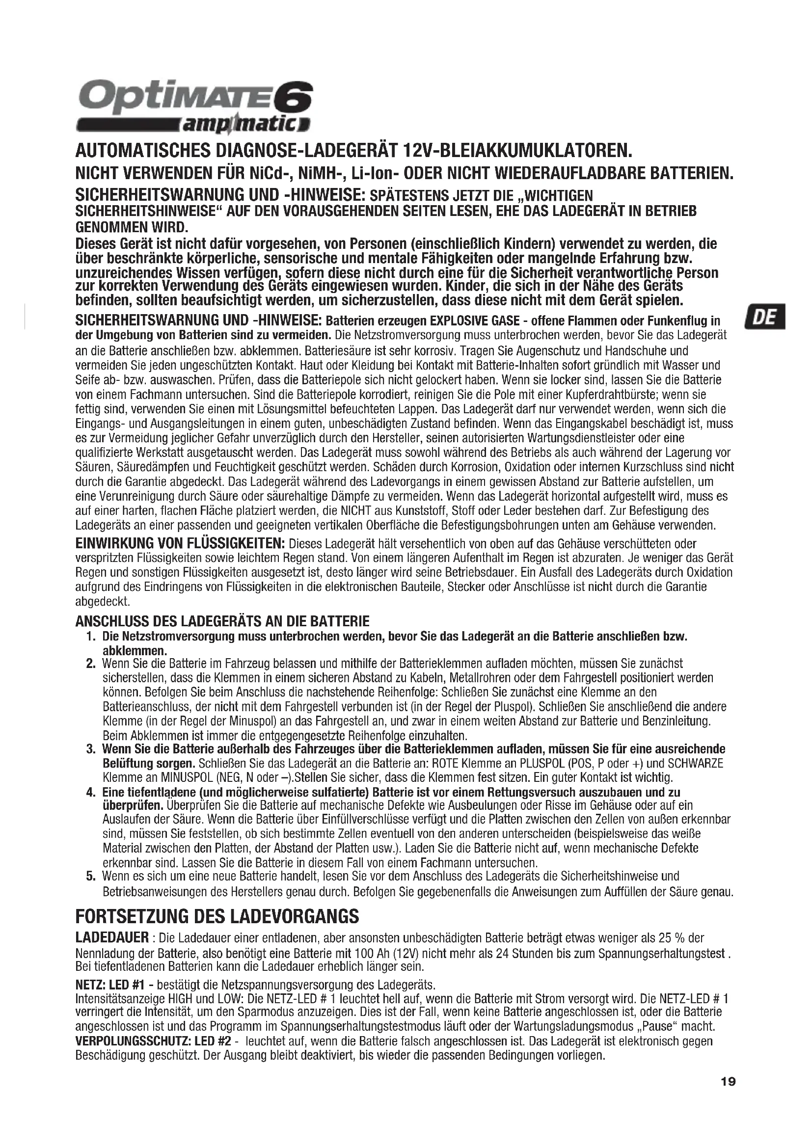 TecMate (International) SA, Sint-Truidensesteenweg 252, B-3300 Tienen, Bélgica, establece esta garantía limitada en favor del primer propietario que utilice este aparato. Esta garantía limitada no es transferible. TecMate (International) garantiza este aparato durante los tres años siguientes a la fecha de compra por su primer usuario contra las fallos de materiales y de montaje. En este caso y a discreción del fabricante el aparato podrá ser reparado ó reemplazado. La gestión y los costes relativos al transporte del aparato acompañado por una prueba de compra (véase "NOTA") al fabricante ó a uno de sus representantes autorizados serán por cuenta del cliente. Esta garantía limitada se anula en caso de uso ó tratamiento inadecuado, ó de reparación hecha por toda persona o organización otra diferente al fabricante ó uno de sus representantes autorizados. El fabricante no cumple con otra garantía que esta garantía limitada y expresamente excluye toda forma de garantía contra otros daños que los que sufra el aparato por sí mismo. ESTO CONSTITUYE LA UNICA GARANTÍA LIMITADA VALIDA. El FABRICANTE NO RECONOCE A QUIENQUIERA EL DERECHO DE EJERCER Ó DE TRANSMITIR NINGUN DERECHO RELATIVO AL PRODUCTO VENDIDO QUE SEA OTRO QUE EL QUE SE DERIVA DE ESTA GARANTÍA LIMITADA EXPRESA. LAS SUS DERECHAS ESTATUTARIAS NO SON AFECTADAS. NOTA: Véase www.tecmate.com/warranty ó contacte warranty@tecmate.com Se puede encontrar más información sobre los productos de TecMate en www.tecmate.com. GARANTÍA en Canadá, EE. UU., América Central y América del Sur: TecMate North America (Oakville, ON, Canadá), en calidad de subsidiaria en propiedad absoluta de TecMate International, asume la responsabilidad relativa a la garantía del producto en dichas regiones. Se puede encontrar más información sobre los productos de TecMate en www.tecmate.com.19 AUTOMATISCHES DIAGNOSE-LADEGERÄT 12V-BLEIAKKUMUKLATOREN. NICHT VERWENDEN FÜR NiCd-, NiMH-, Li-Ion- ODER NICHT WIEDERAUFLADBARE BATTERIEN. SICHERHEITSWARNUNG UND -HINWEISE: SPÄTESTENS JETZT DIE „WICHTIGEN SICHERHEITSHINWEISE“ AUF DEN VORAUSGEHENDEN SEITEN LESEN, EHE DAS LADEGERÄT IN BETRIEB GENOMMEN WIRD. Dieses Gerät ist nicht dafür vorgesehen, von Personen (einschließlich Kindern) verwendet zu werden, die über beschränkte körperliche, sensorische und mentale Fähigkeiten oder mangelnde Erfahrung bzw. unzureichendes Wissen verfügen, sofern diese nicht durch eine für die Sicherheit verantwortliche Person zur korrekten Verwendung des Geräts eingewiesen wurden. Kinder, die sich in der Nähe des Geräts befinden, sollten beaufsichtigt werden, um sicherzustellen, dass diese nicht mit dem Gerät spielen. SICHERHEITSWARNUNG UND -HINWEISE: Batterien erzeugen EXPLOSIVE GASE - offene Flammen oder Funkenflug in der Umgebung von Batterien sind zu vermeiden. Die Netzstromversorgung muss unterbrochen werden, bevor Sie das Ladegerät an die Batterie anschließen bzw. abklemmen. Batteriesäure ist sehr korrosiv. Tragen Sie Augenschutz und Handschuhe und vermeiden Sie jeden ungeschützten Kontakt. Haut oder Kleidung bei Kontakt mit Batterie-Inhalten sofort gründlich mit Wasser und Seife ab- bzw. auswaschen. Prüfen, dass die Batteriepole sich nicht gelockert haben. Wenn sie locker sind, lassen Sie die Batterie von einem Fachmann untersuchen. Sind die Batteriepole korrodiert, reinigen Sie die Pole mit einer Kupferdrahtbürste; wenn sie fettig sind, verwenden Sie einen mit Lösungsmittel befeuchteten Lappen. Das Ladegerät darf nur verwendet werden, wenn sich die Eingangs- und Ausgangsleitungen in einem guten, unbeschädigten Zustand befinden. Wenn das Eingangskabel beschädigt ist, muss es zur Vermeidung jeglicher Gefahr unverzüglich durch den Hersteller, seinen autorisierten Wartungsdienstleister oder eine qualifizierte Werkstatt ausgetauscht werden. Das Ladegerät muss sowohl während des Betriebs als auch während der Lagerung vor Säuren, Säuredämpfen und Feuchtigkeit geschützt werden. Schäden durch Korrosion, Oxidation oder internen Kurzschluss sind nicht durch die Garantie abgedeckt. Das Ladegerät während des Ladevorgangs in einem gewissen Abstand zur Batterie aufstellen, um eine Verunreinigung durch Säure oder säurehaltige Dämpfe zu vermeiden. Wenn das Ladegerät horizontal aufgestellt wird, muss es auf einer harten, flachen Fläche platziert werden, die NICHT aus Kunststoff, Stoff oder Leder bestehen darf. Zur Befestigung des Ladegeräts an einer passenden und geeigneten vertikalen Oberfläche die Befestigungsbohrungen unten am Gehäuse verwenden. EINWIRKUNG VON FLÜSSIGKEITEN: Dieses Ladegerät hält versehentlich von oben auf das Gehäuse verschütteten oder verspritzten Flüssigkeiten sowie leichtem Regen stand. Von einem längeren Aufenthalt im Regen ist abzuraten. Je weniger das Gerät Regen und sonstigen Flüssigkeiten ausgesetzt ist, desto länger wird seine Betriebsdauer. Ein Ausfall des Ladegeräts durch Oxidation aufgrund des Eindringens von Flüssigkeiten in die elektronischen Bauteile, Stecker oder Anschlüsse ist nicht durch die Garantie abgedeckt. ANSCHLUSS DES LADEGERÄTS AN DIE BATTERIE