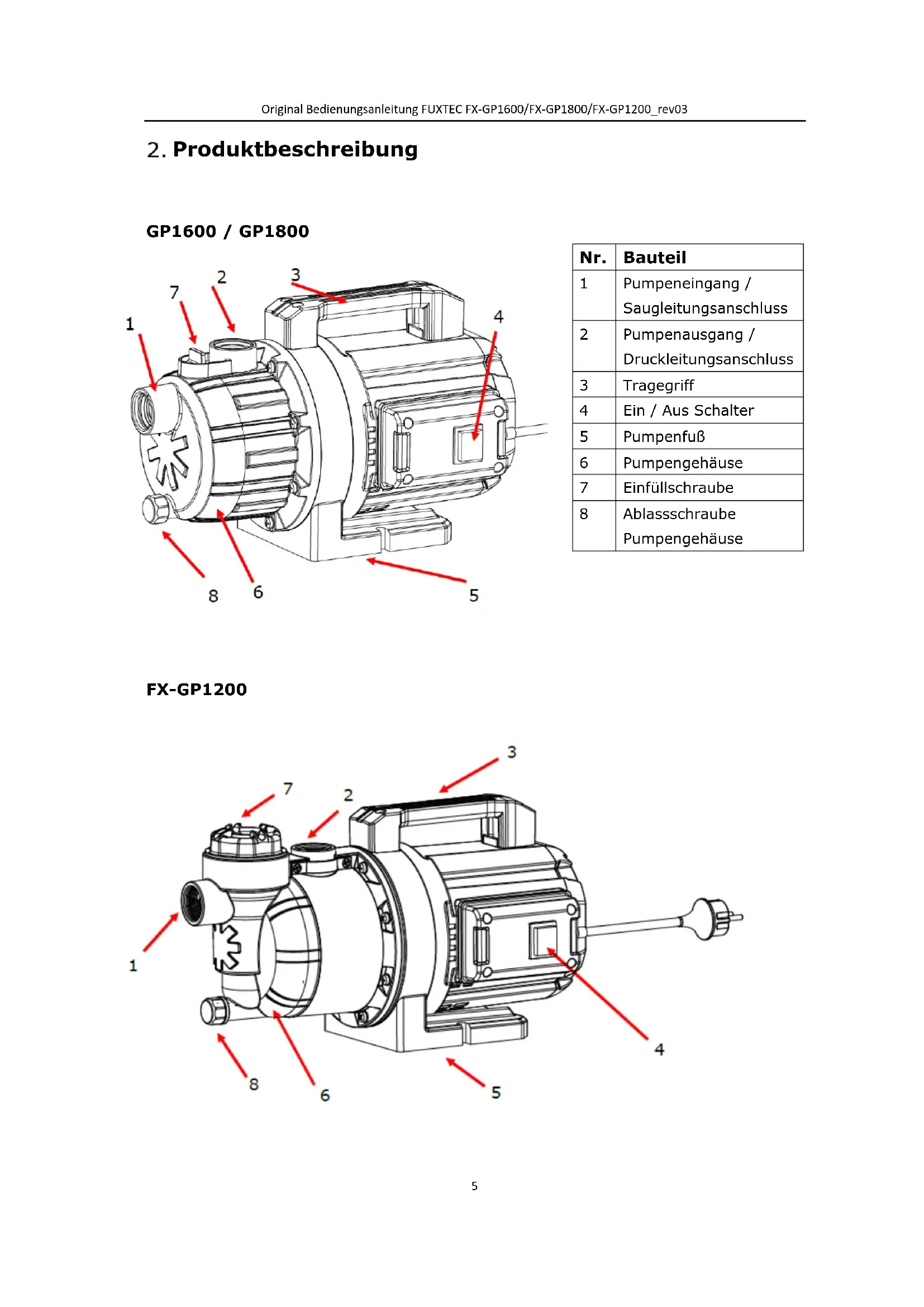- Die Pumpe muss mit 230V Wechselstrom versorgt werden, wie auf demOriginal Bedienungsanleitung FUXTEC FX-GP1600/FX-GP1800/FX-GP1200_rev03
