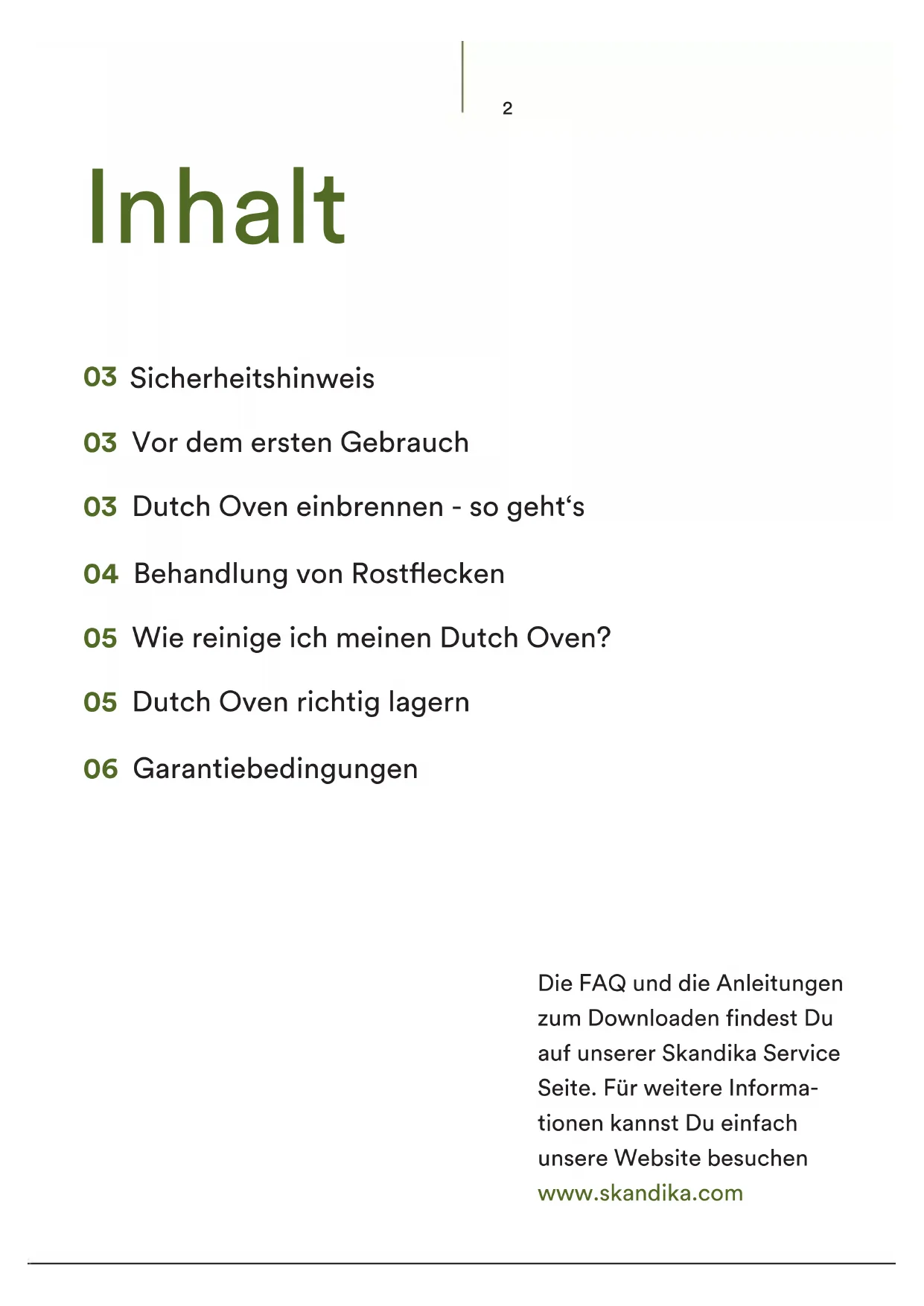 Sicherheitshinweis 03 Vor dem ersten Gebrauch 03 Dutch Oven einbrennen - so geht‘s 04 Behandlung von Rostflecken 05 Wie reinige ich meinen Dutch Oven? 05 Dutch Oven richtig lagern 06 Garantiebedingungen Die FAQ und die Anleitungen zum Downloaden findest Du auf unserer Skandika Service Seite. Für weitere Informa- tionen kannst Du einfach unsere Website besuchen www.skandika.comDE