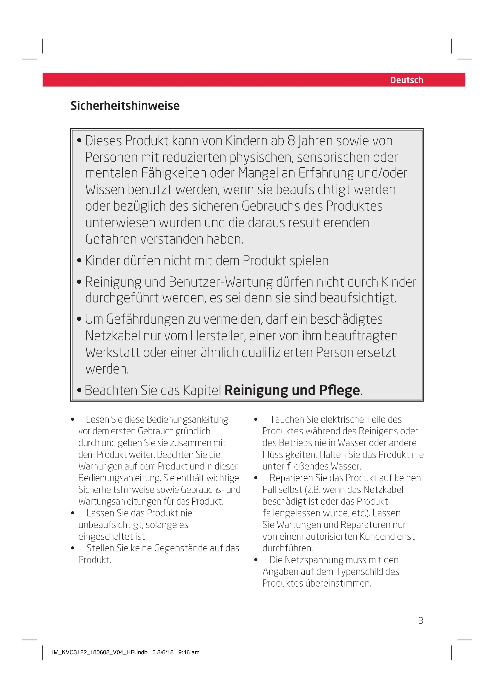 - Die Netzspannung muss mit den Angaben auf dem Typenschild des Produktes übereinstimmen. IM_KVC3122_180608_V04_HR.indb 3 8/6/18 9:46 amSize - A5 Deutsch