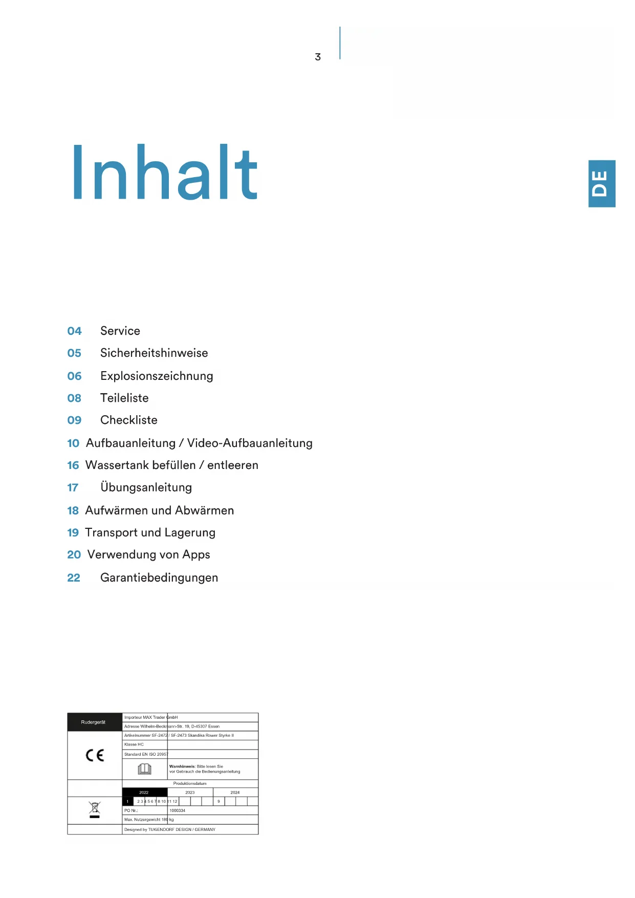 04 Service 05 Sicherheitshinweise 06 Explosionszeichnung 08 Teileliste 09 Checkliste 10 Aufbauanleitung / Video-Aufbauanleitung 16 Wassertank befüllen / entleeren 17 Übungsanleitung 18 Aufwärmen und Abwärmen 19 Transport und Lagerung 20 Verwendung von Apps 22 Garantiebedingungen Inhalt Rudergerät Importeur MAX Trader GmbHAdresse Wilhelm-Beckmann-Str. 19, D-45307 EssenArtikelnummer SF-2472 / SF-2473 Skandika Rower Styrke II Klasse HCStandard EN ISO 20957 Warnhinweis: Bitte lesen Sievor Gebrauch die BedienungsanleitungProduktionsdatum 2 3 4 5 6 7 8 10 11 12PO Nr.:Max. Nutzergewicht 180 kg