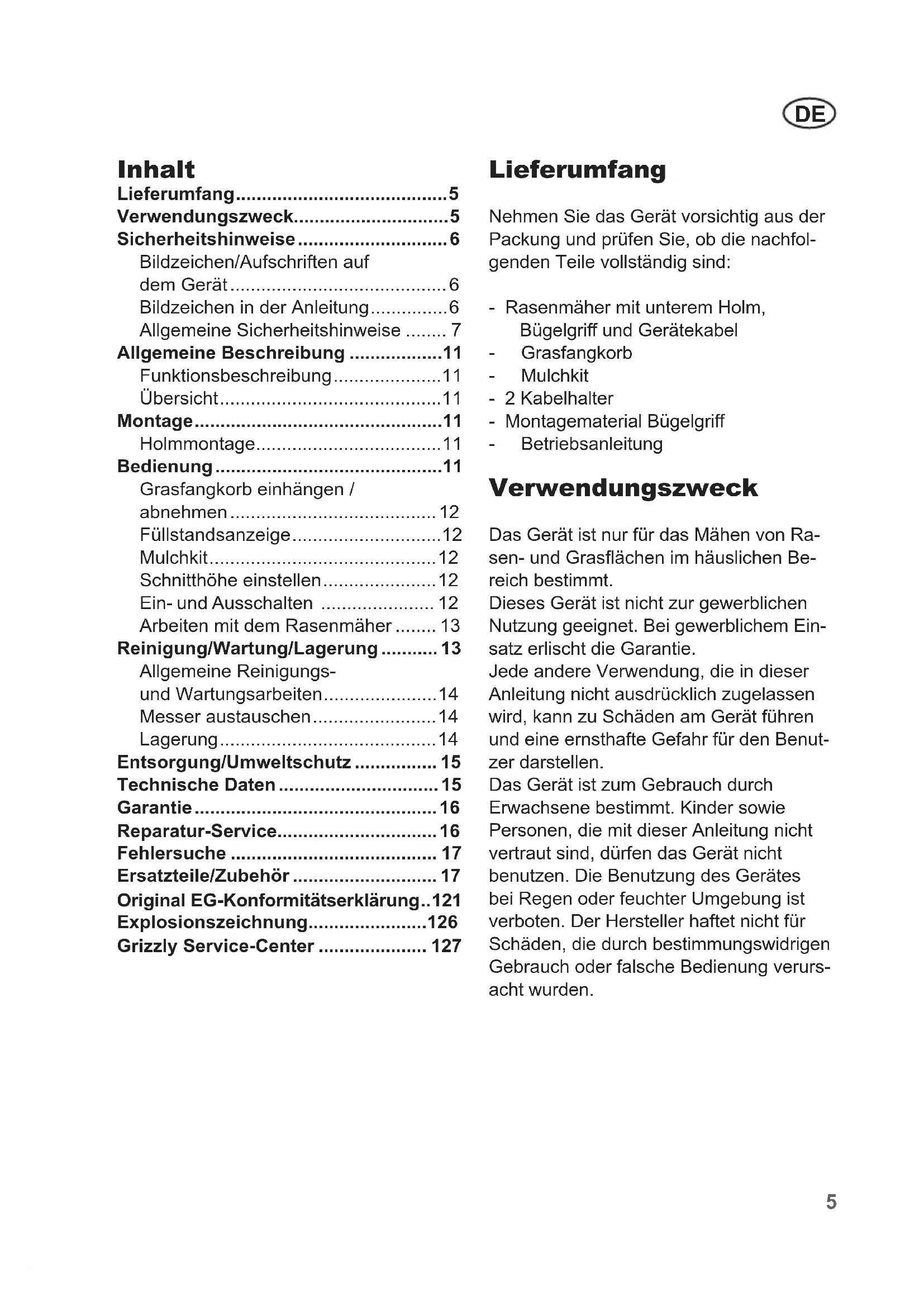 - Lieferumfang Nehmen Sie das Gerät vorsichtig aus der Packung und prüfen Sie, ob die nachfol- genden Teile vollständig sind: - Rasenmäher mit unterem Holm, Bügelgri und Gerätekabel - Grasfangkorb - Mulchkit - 2 Kabelhalter - Montagematerial Bügelgri - Betriebsanleitung Verwendungszweck Das Gerät ist nur für das Mähen von Ra- sen- und Grasächen im häuslichen Be- reich bestimmt. Dieses Gerät ist nicht zur gewerblichen Nutzung geeignet. Bei gewerblichem Ein- satz erlischt die Garantie. Jede andere Verwendung, die in dieser Anleitung nicht ausdrücklich zugelassen wird, kann zu Schäden am Gerät führen und eine ernsthafte Gefahr für den Benut- zer darstellen. Das Gerät ist zum Gebrauch durch Erwachsene bestimmt. Kinder sowie Personen, die mit dieser Anleitung nicht vertraut sind, dürfen das Gerät nicht benutzen. Die Benutzung des Gerätes bei Regen oder feuchter Umgebung ist verboten. Der Hersteller haftet nicht für Schäden, die durch bestimmungswidrigen Gebrauch oder falsche Bedienung verurs- acht wurden. Original EG-Konformitätserklärung p. 121