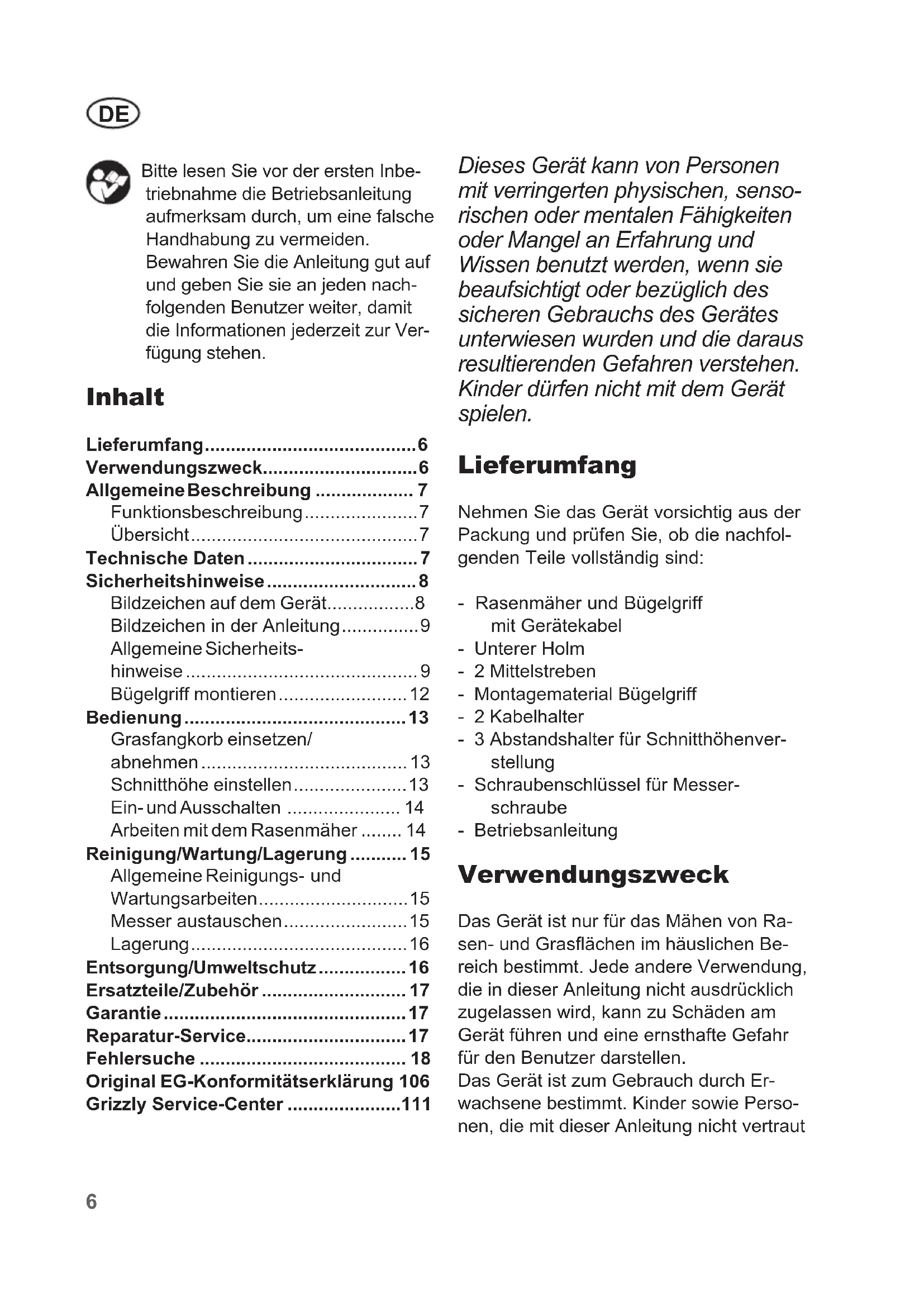 - Original EG-Konformitätserklärung 106 Grizzly Service-Center Dieses Gerät kann von Personen mit verringerten physischen, senso- rischen oder mentalen Fähigkeiten oder Mangel an Erfahrung und Wissen benutzt werden, wenn sie beaufsichtigt oder bezüglich des sicheren Gebrauchs des Gerätes unterwiesen wurden und die daraus resultierenden Gefahren verstehen. Kinder dürfen nicht mit dem Gerät spielen. Lieferumfang Nehmen Sie das Gerät vorsichtig aus der Packung und prüfen Sie, ob die nachfol- genden Teile vollständig sind: - Rasenmäher und Bügelgriff mit Gerätekabel - Unterer Holm - 2 Mittelstreben - Montagematerial Bügelgriff - 2 Kabelhalter - 3 Abstandshalter für Schnitthöhenver- stellung - Schraubenschlüssel für Messer- schraube - Betriebsanleitung Verwendungszweck Das Gerät ist nur für das Mähen von Ra- sen- und Grasächen im häuslichen Be- reich bestimmt. Jede andere Verwendung, die in dieser Anleitung nicht ausdrücklich zugelassen wird, kann zu Schäden am Gerät führen und eine ernsthafte Gefahr für den Benutzer darstellen. Das Gerät ist zum Gebrauch durch Er- wachsene bestimmt. Kinder sowie Perso- nen, die mit dieser Anleitung nicht vertraut Bitte lesen Sie vor der ersten Inbe- triebnahme die Betriebsanleitung aufmerksam durch, um eine falsche Handhabung zu vermeiden. Bewahren Sie die Anleitung gut auf und geben Sie sie an jeden nach- folgenden Benutzer weiter, damit die Informationen jederzeit zur Ver- fügung stehen. p. 111