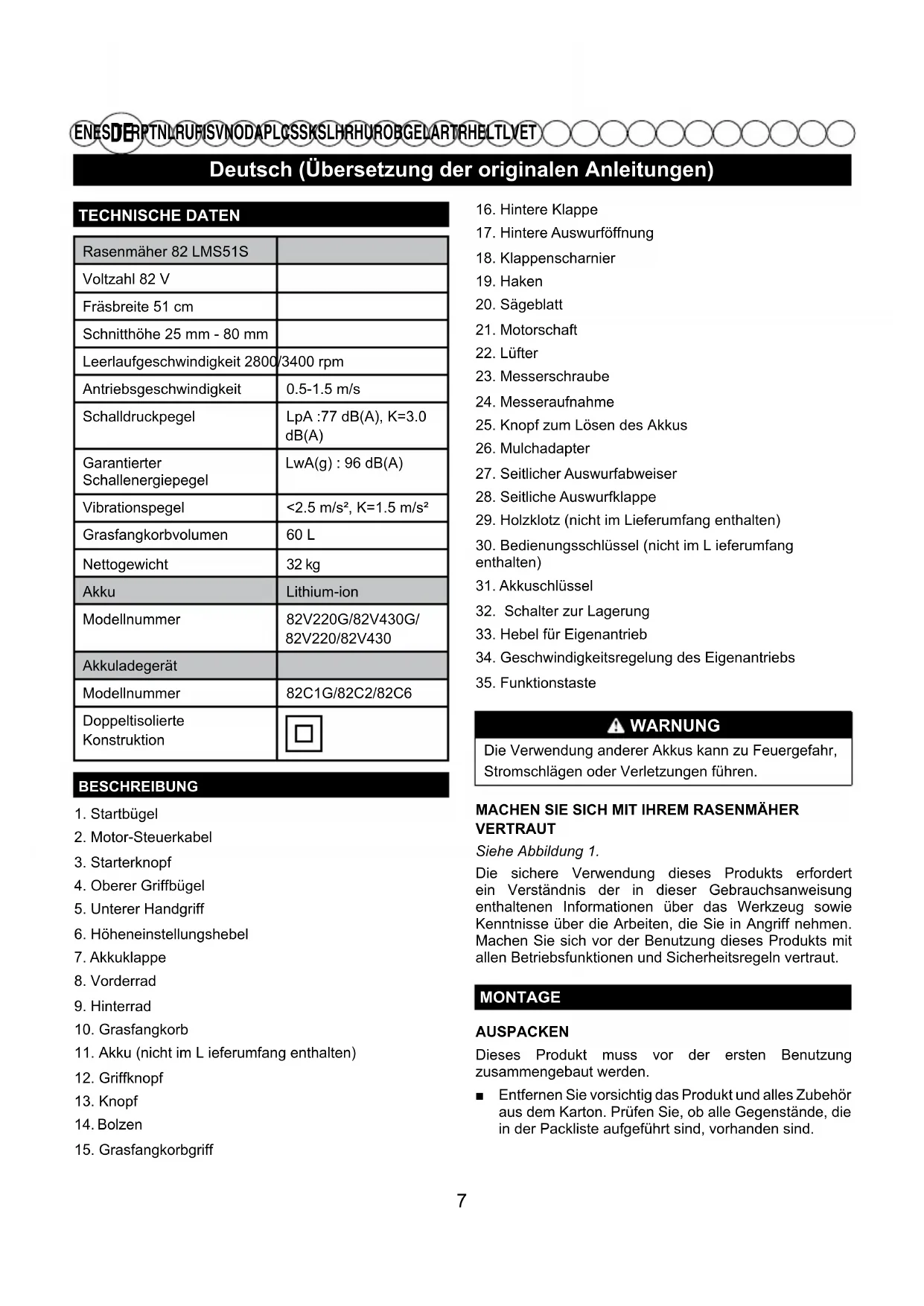 EN ES IT FR PT NL RU FI SV NO DA PL CS SK SL HR HU RO BG EL AR TR HE LT LV ET TECHNISCHE DATENRasenmäher 82 LMS51SVoltzahl 82 VFräsbreite 51 cmSchnitthöhe 25 mm - 80 mmLeerlaufgeschwindigkeit 2800/3400 rpmAntriebsgeschwindigkeit 0.5-1.5 m/sSchalldruckpegel LpA :77 dB(A), K=3.0 dB(A)GarantierterSchallenergiepegelLwA(g) : 96 dB(A)Vibrationspegel <2.5 m/s², K=1.5 m/s²Grasfangkorbvolumen 60 LNettogewicht 32 kgAkku Lithium-ionModellnummer 82V220G/82V430G/82V220/82V430AkkuladegerätModellnummer 82C1G/82C2/82C6Doppeltisolierte KonstruktionBESCHREIBUNG1. Startbügel2. Motor-Steuerkabel3. Starterknopf4. Oberer Griffbügel5. Unterer Handgriff6. Höheneinstellungshebel7. Akkuklappe8. Vorderrad9. Hinterrad10. Grasfangkorb11. Akku (nicht im L ieferumfang enthalten)12. Griffknopf13. Knopf Bolzen15. Grasfangkorbgriff16. Hintere Klappe17. Hintere Auswurföffnung18. Klappenscharnier19. Haken20. Sägeblatt21. Motorschaft22. Lüfter23. Messerschraube24. Messeraufnahme25. Knopf zum Lösen des Akkus26. Mulchadapter27. Seitlicher Auswurfabweiser28. Seitliche Auswurfklappe29. Holzklotz (nicht im Lieferumfang enthalten)30. Bedienungsschlüssel (nicht im L ieferumfang enthalten)31. Akkuschlüssel32. Schalter zur Lagerung33. Hebel für Eigenantrieb 34. Geschwindigkeitsregelung des Eigenantriebs35. Funktionstaste WARNUNG Die Verwendung anderer Akkus kann zu Feuergefahr,Stromschlägen oder Verletzungen führen. MACHEN SIE SICH MIT IHREM RASENMÄHER VERTRAUTSiehe Abbildung 1.Die sichere Verwendung dieses Produkts erfordert ein Verständnis der in dieser Gebrauchsanweisung enthaltenen Informationen über das Werkzeug sowie Kenntnisse über die Arbeiten, die Sie in Angriff nehmen. Machen Sie sich vor der Benutzung dieses Produkts mit allen Betriebsfunktionen und Sicherheitsregeln vertraut.MONTAGEAUSPACKENDieses Produkt muss vor der ersten Benutzung zusammengebaut werden. ■ Entfernen Sie vorsichtig das Produkt und alles Zubehör aus dem Karton. Prüfen Sie, ob alle Gegenstände, die in der Packliste aufgeführt sind, vorhanden sind. 7Deutsch (Übersetzung der originalen Anleitungen)