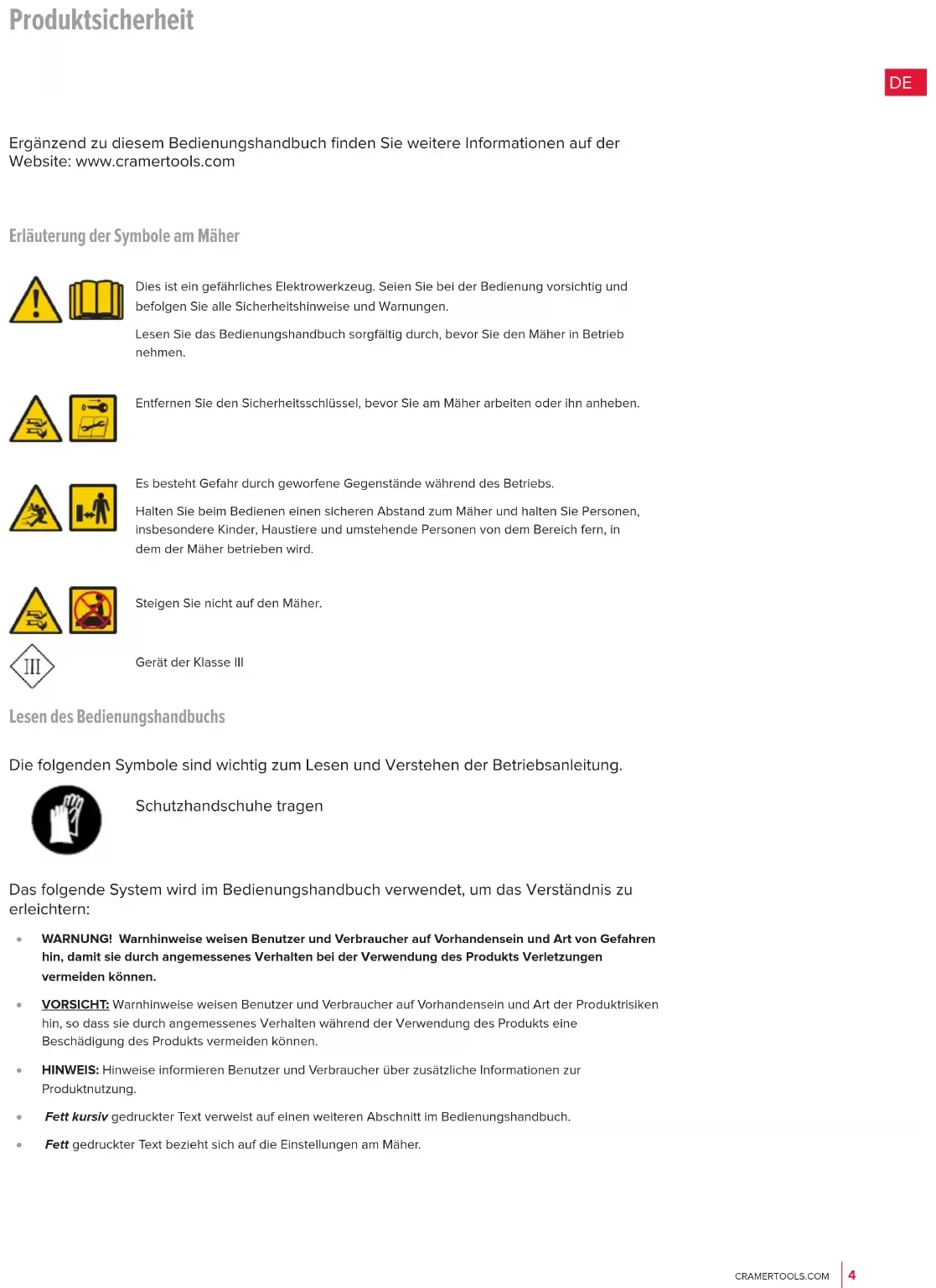 Ergänzend zu diesem Bedienungshandbuch finden Sie weitere Informationen auf der Website: www.cramertools.com Erläuterung der Symbole am Mäher Dies ist ein gefährliches Elektrowerkzeug. Seien Sie bei der Bedienung vorsichtig und befolgen Sie alle Sicherheitshinweise und Warnungen. Lesen Sie das Bedienungshandbuch sorgfältig durch, bevor Sie den Mäher in Betrieb nehmen. Entfernen Sie den Sicherheitsschlüssel, bevor Sie am Mäher arbeiten oder ihn anheben. Es besteht Gefahr durch geworfene Gegenstände während des Betriebs. Halten Sie beim Bedienen einen sicheren Abstand zum Mäher und halten Sie Personen, insbesondere Kinder, Haustiere und umstehende Personen von dem Bereich fern, in dem der Mäher betrieben wird. Steigen Sie nicht auf den Mäher. Gerät der Klasse III Lesen des Bedienungshandbuchs Die folgenden Symbole sind wichtig zum Lesen und Verstehen der Betriebsanleitung. Schutzhandschuhe tragen Das folgende System wird im Bedienungshandbuch verwendet, um das Verständnis zu erleichtern: