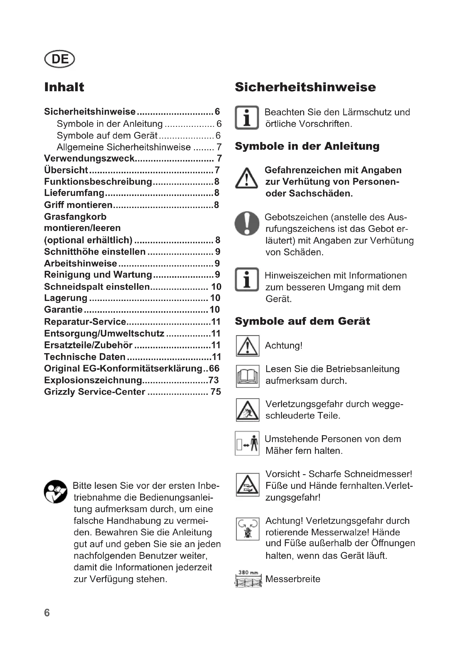 - Sicherheitshinweise Beachten Sie den Lärmschutz und örtliche Vorschriften. Symbole in der Anleitung Gefahrenzeichen mit Angaben zur Verhütung von Personen- oder Sachschäden. Gebotszeichen (anstelle des Aus- rufungszeichens ist das Gebot er- läutert) mit Angaben zur Verhütung von Schäden. Hinweiszeichen mit Informationen zum besseren Umgang mit dem Gerät. Symbole auf dem Gerät Achtung! Lesen Sie die Betriebsanleitung aufmerksam durch. Verletzungsgefahr durch wegge- schleuderte Teile. Umstehende Personen von dem Mäher fern halten. Vorsicht - Scharfe Schneidmesser! Füße und Hände fernhalten.Verlet- zungsgefahr! Achtung! Verletzungsgefahr durch rotierende Messerwalze! Hände und Füße außerhalb der Önungen halten, wenn das Gerät läuft. Messerbreite Bitte lesen Sie vor der ersten Inbe- triebnahme die Bedienungsanlei- tung aufmerksam durch, um eine falsche Handhabung zu vermei- den. Bewahren Sie die Anleitung gut auf und geben Sie sie an jeden nachfolgenden Benutzer weiter, damit die Informationen jederzeit zur Verfügung stehen. Inhalt Sicherheitshinweise p. 6