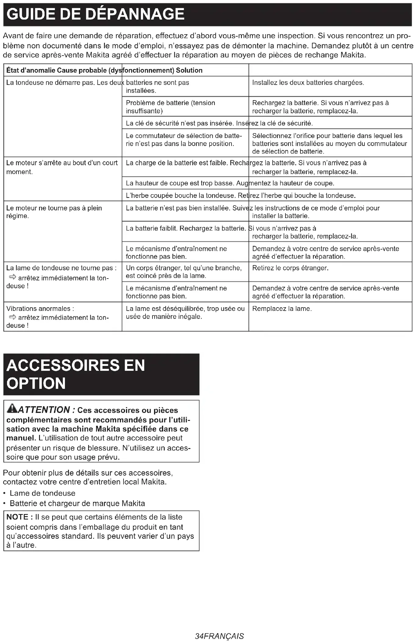 ANMERKUNG: Vergewissern Sie sich beim Montieren des Mähermessers, dass die Vorsprünge am Messerhalter in die Löcher im Mähermesser passen. Installieren des Mähermessers WARNUNG: Montieren Sie das Mähermesser sorgfältig. Das Messer hat eine Ober- und Unterseite. WARNUNG: Ziehen Sie dann die Schraube zur Sicherung des Messers im Uhrzeigersinn fest. WARNUNG: Vergewissern Sie sich, dass das Mähermesser und alle Befestigungsteile korrekt montiert und sicher festgezogen sind. WARNUNG: Befolgen Sie beim Auswechseln der Messer stets die Anweisungen in dieser Anleitung. ANMERKUNG: Denken Sie nach dem Montieren der Mähermesser daran, den Stift von der Mähereinheit zu entfernen. Zum Montieren der Mähermesser wenden Sie das Demontageverfahren umgekehrt an.48 DEUTSCH FEHLERSUCHE Bevor Sie den Reparaturdienst anrufen, führen Sie zunächst Ihre eigene Inspektion durch. Falls Sie ein Problem nden, das nicht in der Anleitung erläutert wird, versuchen Sie nicht, die Maschine zu zerlegen. Wenden Sie sich stattdessen an autorisierte Makita-Kundendienstzentren, und achten Sie darauf, dass stets Makita-Ersatzteile für Reparaturen verwendet werden. Zustand der Unregelmäßigkeit Wahrscheinliche Ursache (Funktionsstörung) Abhilfemaßnahme Der Mäher startet nicht. Es sind nicht beide Akkus eingesetzt. Setzen Sie zwei geladene Akkus ein. Akkustörung (Unterspannung) Laden Sie die Akkus auf. Falls Laden nichts nützt, tauschen Sie die Akkus aus. Der Sperrschlüssel ist nicht eingesteckt. Stecken Sie den Sperrschlüssel ein. Der Akku-Wahlschalter steht nicht in der korrekten Position. Wählen Sie das Akkudock, in das die Akkus einge- setzt sind, mit dem Akku-Wahlschalter aus. Der Motor bleibt nach kurzer Zeit stehen. Der Ladestand der Akkus ist niedrig. Laden Sie die Akkus auf. Falls Laden nichts nützt, tauschen Sie die Akkus aus. Die Schnitthöhe ist zu niedrig. Vergrößern Sie die Schnitthöhe. Grasschnitt hat sich im Mäher angesammelt. Entfernen Sie das angesammelte Gras vom Mäher. Der Motor erreicht die Maximaldrehzahl nicht. Die Akkus sind falsch eingesetzt. Setzen Sie die Akkus gemäß der Beschreibung in dieser Anleitung ein. Die Akkuleistung lässt nach. Laden Sie die Akkus auf. Falls Laden nichts nützt, tauschen Sie die Akkus aus. Das Antriebssystem funktioniert nicht korrekt. Wenden Sie sich bezüglich einer Reparatur an Ihr autorisiertes Kundendienstzentrum. Das Mähermesser dreht sich nicht: Stoppen Sie den Mäher unverzüglich! Ein Fremdkörper, wie z. B. ein Ast, hat sich in der Nähe des Messers verklemmt. Entfernen Sie den Fremdkörper. Das Antriebssystem funktioniert nicht korrekt. Wenden Sie sich bezüglich einer Reparatur an Ihr autorisiertes Kundendienstzentrum. Ungewöhnliche Vibration: Stoppen Sie den Mäher unverzüglich! Das Messer ist unausgeglichen, über- mäßig oder ungleichmäßig abgenutzt. Tauschen Sie das Messer aus. SONDERZUBEHÖR VORSICHT: Die folgenden Zubehörteile oder Vorrichtungen werden für den Einsatz mit der in dieser Anleitung beschriebenen Makita-Maschine empfohlen. Die Verwendung anderer Zubehörteile oder Vorrichtungen kann eine Verletzungsgefahr darstellen. Verwenden Sie Zubehörteile oder Vorrichtungen nur für ihren vorgesehenen Zweck. Wenn Sie weitere Einzelheiten bezüglich dieser Zubehörteile benötigen, wenden Sie sich bitte an Ihre Makita-Kundendienststelle.