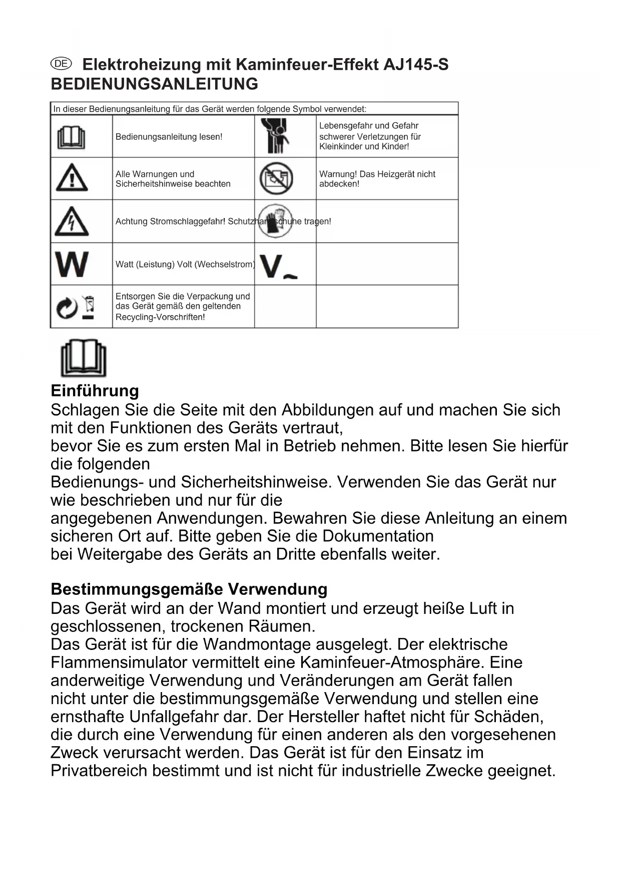Model identier(s): AJ145-S Item Symbol Value Unit Item Unit Heat output Type of heat input, for electric local space heaters only (select one) Nominal heat output Pnom 2,0 kW Manual heat charge control with integrated thermostat [no] Minimum heat output (in- dicative) Pmin N/A kW Manual heat charge control with room and/or outdoor temperature feedback [no] Maximum continuous heat output Pmax 2,0 kW Electronic heat charge con- trol with room and/or outdoor temperature feedback [no] Auxiliary electricity consumption Fan assisted heat output [no] At nominal heat output elmax N/A kW Type of heat output/room temperature control (select one) At minimum heat output elmin N/A kW Single stage heat output and no room temperature control [no] In standby mode elSB 0,41 W Two or more manual stages, no room temperature control [no] With mechanic thermostat room temperature control [no] With electronic room temper- ature control [no] Electronic room temperature control plus day timer [no] Electronic room temperature control plus week timer [yes] Other control options (multiple selections possible) Room temperature control, with presence detection [no] Room temperature control, with open window detection [yes] With distance control option [no] With adaptive start control [no] With working time limitation [no] With black bulb sensor [no] Contact details: Adriaan Mulderweg 9–11, 5657 EM Eindhoven, the Netherlands Remark: For electric local space heaters, the measured seasonal space heating energy efciency ηs cannot be worse than the declared value at the nominal heat output of the unit.B Elektroheizung mit Kaminfeuer-Effekt AJ145-S BEDIENUNGSANLEITUNG In dieser Bedienungsanleitung für das Gerät werden folgende Symbol verwendet: Bedienungsanleitung lesen! Lebensgefahr und Gefahr schwerer Verletzungen für Kleinkinder und Kinder! Alle Warnungen und Sicherheitshinweise beachten Warnung! Das Heizgerät nicht abdecken! Achtung Stromschlaggefahr! Schutzhandschuhe tragen! Watt (Leistung) Volt (Wechselstrom) Entsorgen Sie die Verpackung und das Gerät gemäß den geltenden Recycling-Vorschriften! Einführung Schlagen Sie die Seite mit den Abbildungen auf und machen Sie sich mit den Funktionen des Geräts vertraut, bevor Sie es zum ersten Mal in Betrieb nehmen. Bitte lesen Sie hierfür die folgenden Bedienungs- und Sicherheitshinweise. Verwenden Sie das Gerät nur wie beschrieben und nur für die angegebenen Anwendungen. Bewahren Sie diese Anleitung an einem sicheren Ort auf. Bitte geben Sie die Dokumentation bei Weitergabe des Geräts an Dritte ebenfalls weiter. Bestimmungsgemäße Verwendung Das Gerät wird an der Wand montiert und erzeugt heiße Luft in geschlossenen, trockenen Räumen. Das Gerät ist für die Wandmontage ausgelegt. Der elektrische Flammensimulator vermittelt eine Kaminfeuer-Atmosphäre. Eine anderweitige Verwendung und Veränderungen am Gerät fallen nicht unter die bestimmungsgemäße Verwendung und stellen eine ernsthafte Unfallgefahr dar. Der Hersteller haftet nicht für Schäden, die durch eine Verwendung für einen anderen als den vorgesehenen Zweck verursacht werden. Das Gerät ist für den Einsatz im Privatbereich bestimmt und ist nicht für industrielle Zwecke geeignet.Technische Daten Nennspannung: 220–240 V Nennleistung: 1800-2000W Lampen: 9 W LED Abmessungen: 94×12×48 cm (B×T×H) Gewicht: ca. 12 kg Lieferumfang Überprüfen Sie bitte sofort nach dem Auspacken, dass die Lieferung vollständig ist und alle Teile des Geräts in ordnungsgemäßem Zustand sind. 1 Elektrische Wandheizung 1 Fernbedienung 3 Schrauben 3 Stecker 1 Sicherheitsbügel 1 Bedienungsanleitung Dekosteine Einführung und Sicherheitshinweise Beschreibung der Komponenten