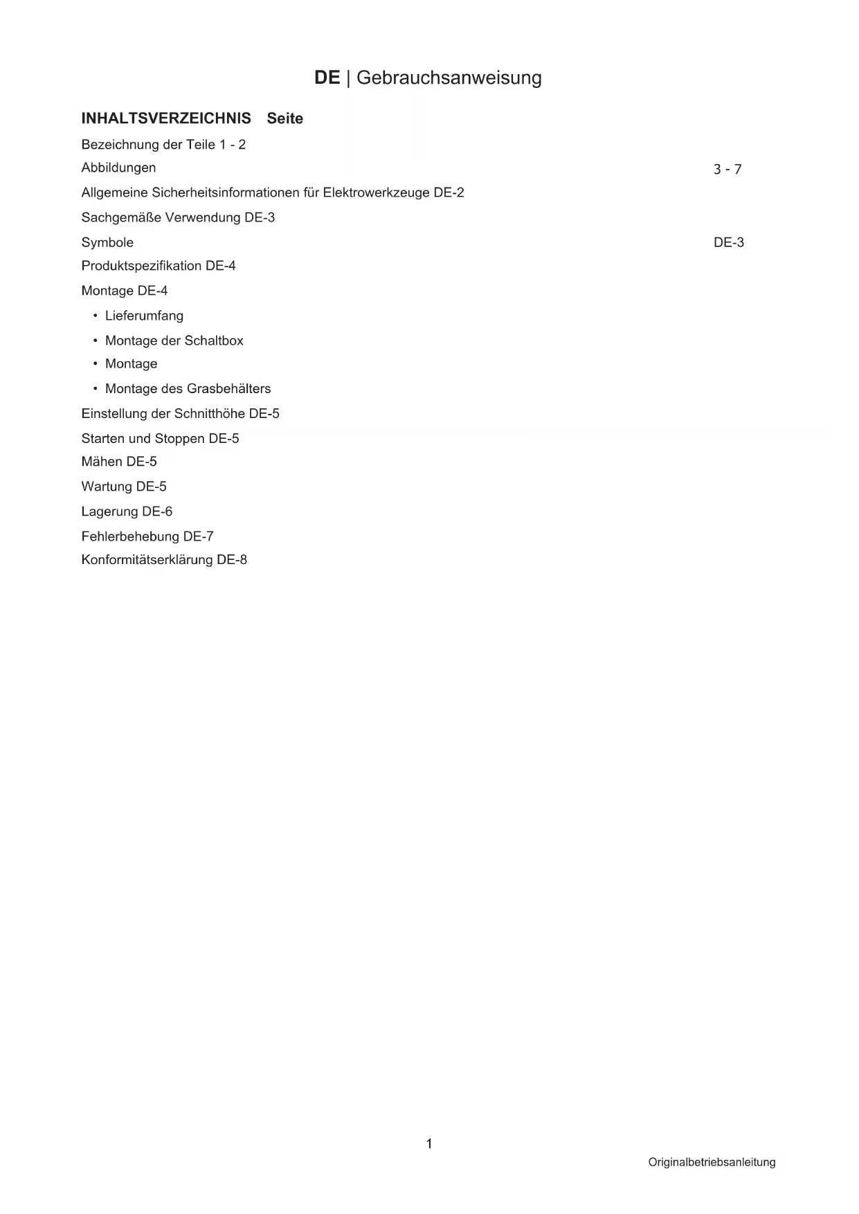 den Rasenmäher zu sich ziehen. j) Stoppen Sie die Schneidblätter, wenn der Rasenmäher für den Transport geneigt werden muss, wenn Sie über andere Flächen als Gras fahren und wenn Sie den Ra- senmäher zum Rasen und zurück transportieren. k) Verwenden Sie den Rasenmäher niemals mit be- schädigten Schutzvorrichtungen oder ohne montierte Sicherheitsvorrichtungen, z. B. Abweiser und/oder Grasfänger. l) Schalten Sie den Motor vorsichtig gemäß der Anwei- sungen ein und achten Sie dabei darauf, dass sich Ihre Füße in sicherem Abstand zu den Schneidblättern benden. m) Neigen Sie den Rasenmäher nicht, wenn Sie den Motor einschalten, es sei denn er muss zum Starten geneigt werden. Neigen Sie ihn in diesem Fall nicht mehr als absolut notwendig und heben Sie nur den vom Bediener entfernten Teil an. n) Legen Sie Ihre Hände oder Füße nicht in die Nähe rotierender Teile oder darunter. Halten Sie die Auslas- söffnung immer frei. o) Heben oder tragen Sie den Rasenmäher niemals bei laufendem Motor. p) Stoppen Sie den Motor, bevor Sie Blockaden lösen oder den verstopften Auslass säubern. - bevor Sie den Rasenmäher überprüfen, reinigen oder daran arbeiten. - nachdem Sie einen Fremdkörper getroffen haben. Überprüfen Sie den Rasenmäher auf Schäden und reparieren Sie diese, bevor Sie den Rasenmäher er- neut starten und in Betrieb nehmen. - falls der Rasenmäher beginnt, ungewöhnlich zu vib- rieren (sofort überprüfen). q) Stoppen Sie den Motor - sobald Sie ihn verlassen. Wartung und Lagerung a) Achten Sie darauf, dass alle Muttern, Bolzen und Schrauben fest angezogen sind, damit sich das Gerät ständig in einem sicheren Betriebszustand bendet. b) Überprüfen Sie den Grasbehälter regelmäßig auf Ver- schleiß oder Verformung. c) Tauschen Sie verschlissene oder beschädigte Teile aus Sicherheitsgründen aus. Sicherheitswarnungen für den Rasenmäher: a) Verwenden Sie den Rasenmäher nicht mit beschädig- ten oder verschlissenen Kabeln. b) Stecken Sie beschädigte Kabel nicht in die Steckdose. Berühren Sie keine beschädigten Kabel, bevor diese von der Stromversorgung getrennt wurden. Ein be- schädigtes Teil kann zu einem Kontakt mit spannungs- führenden Teilen führen. c) Berühren Sie die Schneidblätter erst, wenn die Ma- schine von der Stromversorgung getrennt ist und die Schneidblätter vollständig stillstehen.3 DE | Gebrauchsanweisung d) Halten Sie Verlängerungskabel von den Schneidblät- tern fern. Die Schneidblätter können die Kabel be- schädigen und so zu einem Kontakt mit spannungs- führenden Teilen führen. e) Trennen Sie den Rasenmäher von der Stromversor- gung (d.h. Stecker aus der Steckdose ziehen) - jedes Mal, wenn Sie den Rasenmäher unbeaufsich- tigt lassen, - bevor Sie eine Blockierung beseitigen, - bevor Sie den Rasenmäher überprüfen, reinigen oder daran arbeiten, - nachdem Sie einen Fremdkörper getroffen haben, - jedes Mal, wenn die Maschine ungewöhnlich zu vi- brieren beginnt. f) Lesen Sie die Anweisungen für einen sicheren Betrieb der Maschine sorgfältig durch. g) Empfehlungen: Schließen Sie den Rasenmäher nur an eine Stromver- sorgung an, die durch einen Fehlerstromschutzschal- ter (RCE) mit einem Auslösestrom von höchstens 30 mA gesichert ist. h) Wenn das Stromkabel beschädigt ist, muss es durch ein Spezialkabel oder eine Spezialkabeleinheit vom Hersteller oder seines Kundendiensts ersetzt werden.