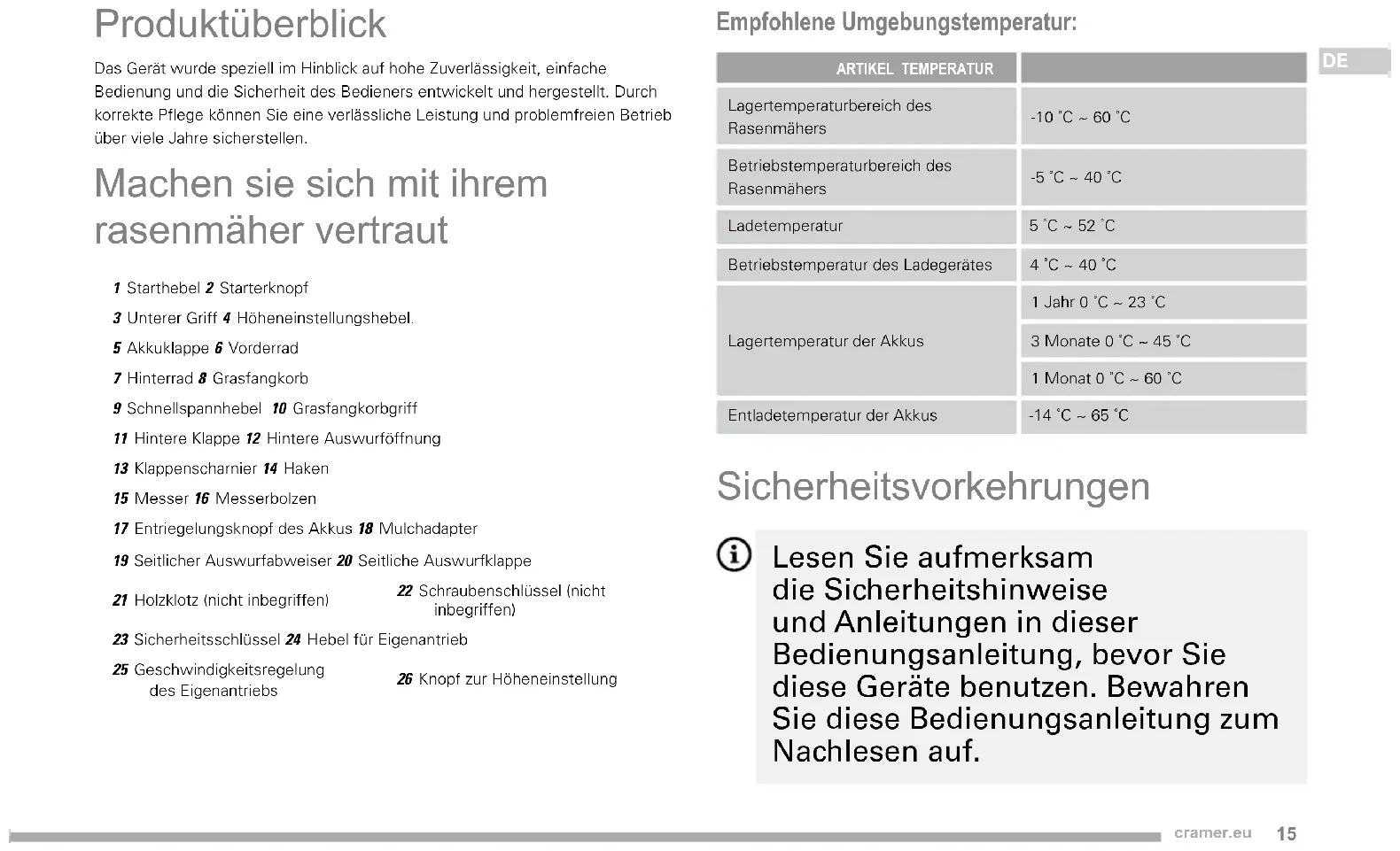 Produktüberblick Das Gerät wurde speziell im Hinblick auf hohe Zuverlässigkeit, einfache Bedienung und die Sicherheit des Bedieners entwickelt und hergestellt. Durch korrekte Pflege können Sie eine verlässliche Leistung und problemfreien Betrieb über viele Jahre sicherstellen. Machen sie sich mit ihrem rasenmäher vertraut 1 Starthebel 2 Starterknopf3 Unterer Griff 4 Höheneinstellungshebel.5 Akkuklappe 6 Vorderrad7 Hinterrad 8 Grasfangkorb9 Schnellspannhebel 10 Grasfangkorbgriff11 Hintere Klappe 12 Hintere Auswurföffnung13 Klappenscharnier 14 Haken15 Messer 16 Messerbolzen17 Entriegelungsknopf des Akkus 18 Mulchadapter19 Seitlicher Auswurfabweiser 20 Seitliche Auswurfklappe21 Holzklotz (nicht inbegriffen)22 Schraubenschlüssel (nicht inbegriffen)23 Sicherheitsschlüssel 24 Hebel für Eigenantrieb25 Geschwindigkeitsregelung des Eigenantriebs26 Knopf zur Höheneinstellung Empfohlene Umgebungstemperatur: ARTIKEL TEMPERATUR Lagertemperaturbereich des Rasenmähers-10 ˚C ~ 60 ˚C Betriebstemperaturbereich des Rasenmähers-5 ˚C ~ 40 ˚C Ladetemperatur 5 ˚C ~ 52 ˚C Betriebstemperatur des Ladegerätes 4 ˚C ~ 40 ˚C Lagertemperatur der Akkus 1 Jahr 0 ˚C ~ 23 ˚C 3 Monate 0 ˚C ~ 45 ˚C 1 Monat 0 ˚C ~ 60 ˚CEntladetemperatur der Akkus -14 ˚C ~ 65 ˚C Sicherheitsvorkehrungen Lesen Sie aufmerksam die Sicherheitshinweise und Anleitungen in dieser Bedienungsanleitung, bevor Sie diese Geräte benutzen. Bewahren Sie diese Bedienungsanleitung zum Nachlesen auf.16 cramer.eu