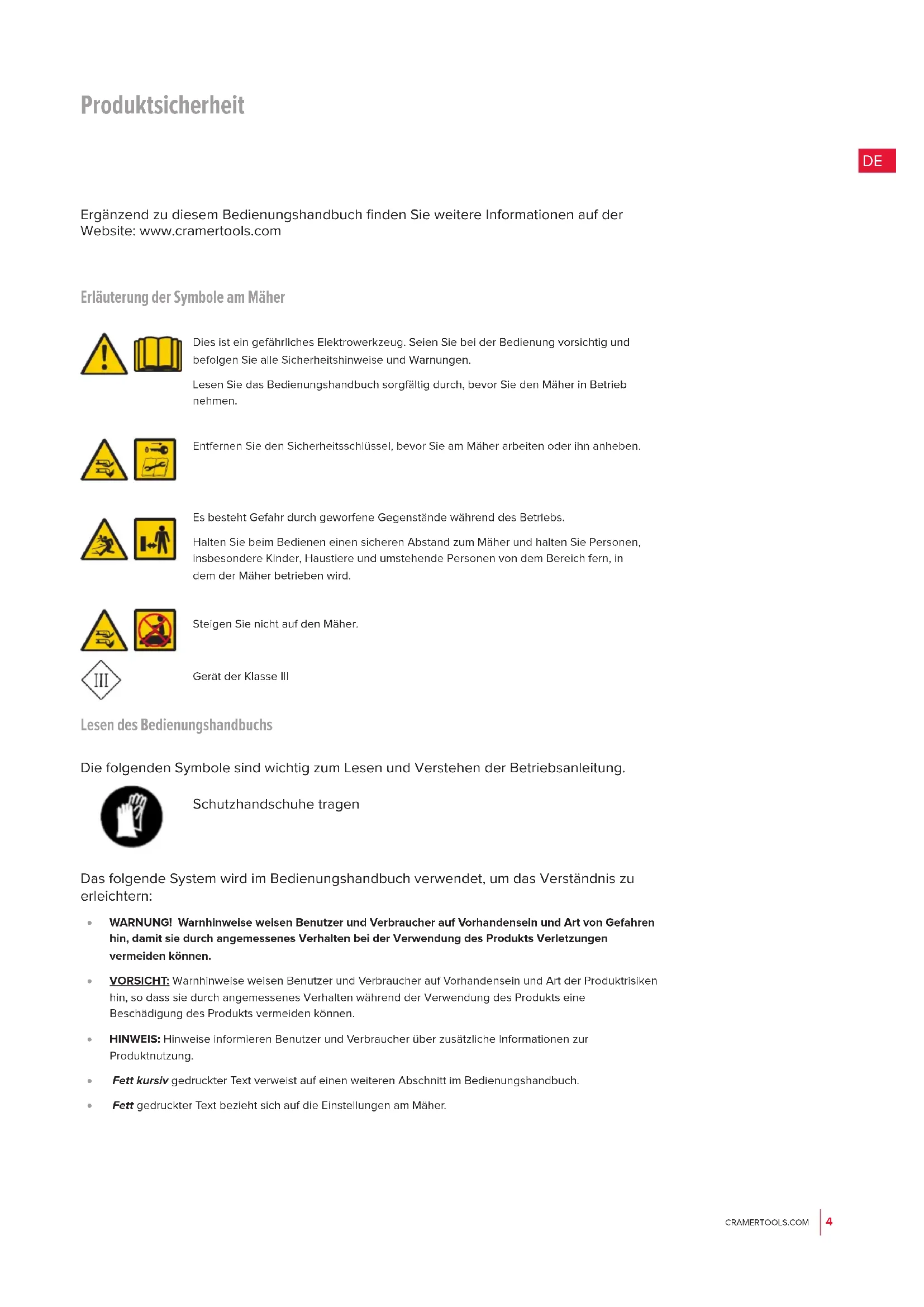 Ergänzend zu diesem Bedienungshandbuch finden Sie weitere Informationen auf der Website: www.cramertools.com Erläuterung der Symbole am Mäher Dies ist ein gefährliches Elektrowerkzeug. Seien Sie bei der Bedienung vorsichtig und befolgen Sie alle Sicherheitshinweise und Warnungen. Lesen Sie das Bedienungshandbuch sorgfältig durch, bevor Sie den Mäher in Betrieb nehmen. Entfernen Sie den Sicherheitsschlüssel, bevor Sie am Mäher arbeiten oder ihn anheben. Es besteht Gefahr durch geworfene Gegenstände während des Betriebs. Halten Sie beim Bedienen einen sicheren Abstand zum Mäher und halten Sie Personen, insbesondere Kinder, Haustiere und umstehende Personen von dem Bereich fern, in dem der Mäher betrieben wird. Steigen Sie nicht auf den Mäher. Gerät der Klasse III Lesen des Bedienungshandbuchs Die folgenden Symbole sind wichtig zum Lesen und Verstehen der Betriebsanleitung. Schutzhandschuhe tragen Das folgende System wird im Bedienungshandbuch verwendet, um das Verständnis zu erleichtern: