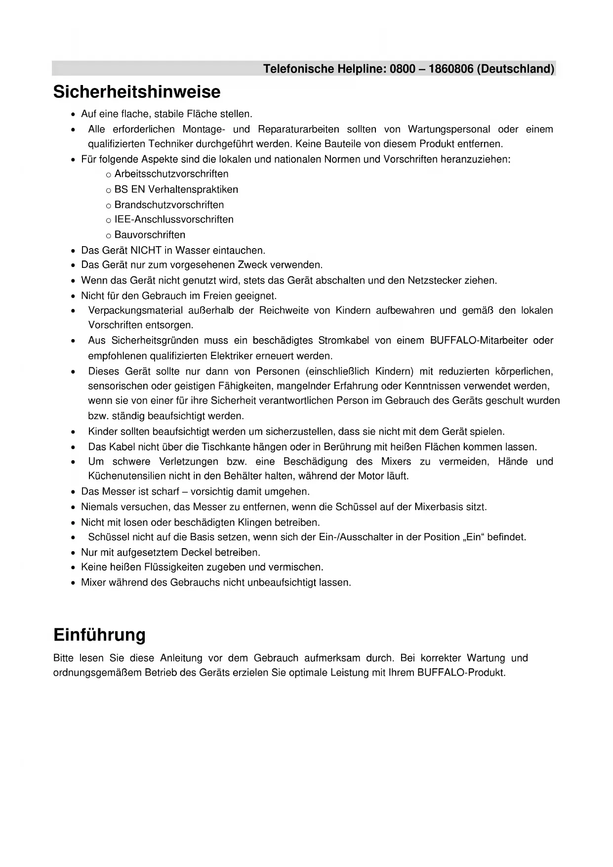 Tous droits réservés. La production ou transmission, partielle ou intégrale, sous quelque forme que ce soit ou par n'importe quel moyen, tant électronique que mécanique, sous forme de photocopie, d'enregistrement ou autre, de ce mode d'emploi est interdite sans l'autorisation préalable de BUFFALO. Tous les efforts ont été faits pour que ces informations soient correctes au moment de l'impression, toutefois, BUFFALO se réserve le droit de modifier les spécifications sans avertissement préalable.Telefonische Helpline: 0800 – 1860806 (Deutschland) Sicherheitshinweise Auf eine flache, stabile Fläche stellen. Alle erforderlichen Montage- und Reparaturarbeiten sollten von Wartungspersonal oder einem qualifizierten Techniker durchgeführt werden. Keine Bauteile von diesem Produkt entfernen. Für folgende Aspekte sind die lokalen und nationalen Normen und Vorschriften heranzuziehen: o Arbeitsschutzvorschriften o BS EN Verhaltenspraktiken o Brandschutzvorschriften o IEE-Anschlussvorschriften o Bauvorschriften Das Gerät NICHT in Wasser eintauchen. Das Gerät nur zum vorgesehenen Zweck verwenden. Wenn das Gerät nicht genutzt wird, stets das Gerät abschalten und den Netzstecker ziehen. Nicht für den Gebrauch im Freien geeignet. Verpackungsmaterial außerhalb der Reichweite von Kindern aufbewahren und gemäß den lokalen Vorschriften entsorgen. Aus Sicherheitsgründen muss ein beschädigtes Stromkabel von einem BUFFALO-Mitarbeiter oder empfohlenen qualifizierten Elektriker erneuert werden. Dieses Gerät sollte nur dann von Personen (einschließlich Kindern) mit reduzierten körperlichen, sensorischen oder geistigen Fähigkeiten, mangelnder Erfahrung oder Kenntnissen verwendet werden, wenn sie von einer für ihre Sicherheit verantwortlichen Person im Gebrauch des Geräts geschult wurden bzw. ständig beaufsichtigt werden. Kinder sollten beaufsichtigt werden um sicherzustellen, dass sie nicht mit dem Gerät spielen. Das Kabel nicht über die Tischkante hängen oder in Berührung mit heißen Flächen kommen lassen. Um schwere Verletzungen bzw. eine Beschädigung des Mixers zu vermeiden, Hände und Küchenutensilien nicht in den Behälter halten, während der Motor läuft. Das Messer ist scharf – vorsichtig damit umgehen. Niemals versuchen, das Messer zu entfernen, wenn die Schüssel auf der Mixerbasis sitzt. Nicht mit losen oder beschädigten Klingen betreiben. Schüssel nicht auf die Basis setzen, wenn sich der Ein-/Ausschalter in der Position „Ein“ befindet. Nur mit aufgesetztem Deckel betreiben. Keine heißen Flüssigkeiten zugeben und vermischen. Mixer während des Gebrauchs nicht unbeaufsichtigt lassen. Einführung Bitte lesen Sie diese Anleitung vor dem Gebrauch aufmerksam durch. Bei korrekter Wartung und ordnungsgemäßem Betrieb des Geräts erzielen Sie optimale Leistung mit Ihrem BUFFALO-Produkt.DE Lieferumfang Folgende Teile zählen zum Lieferumfang: BUFFALO-Mixer Mixschüssel und Deckel Sicherungsschieber BUFFALO ist stolz auf die hochwertige Qualität seiner Produkte und seinen erstklassigen Service. Wir stellen sicher, dass alle gelieferten Produkte zum Zeitpunkt der Verpackung voll funktionsfähig sind und sich in einwandfreiem Zustand befinden. Sollten Sie Transportschäden feststellen, wenden Sie sich bitte unverzüglich an Ihren BUFFALO-Händler.. Bedienelemente