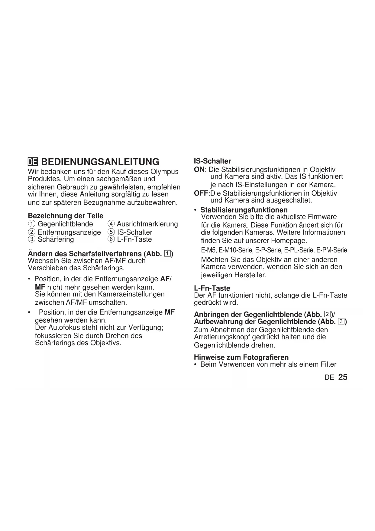 Die Software in diesem Objektiv enthält möglicherweise Software von Drittanbietern. Jede Software von Drittanbietern beinhaltet Nutzungsbedingungen, die von den Besitzern oder Lizenznehmern dieser Software gestellt werden, und unter denen die Software Ihnen zur Verfügung gestellt wird. Diese Bedingungen und andere Hinweise zu Software von Drittanbietern finden Sie in der Hinweise-PDF-Datei der Software, zu finden unter http://www.olympus.co.jp/en/support/imsg/ digicamera/download/notice/notice.cfm28 DA BETJENINGSVEJLEDNING Tak, fordi du valgte dette Olympus-produkt. For at garantere din sikkerhed skal du læse betjeningsvejledningen inden brug og sørge for at have den parat til senere brug. Delenes betegnelser 1 Modlysblænde 2 Afstandsindikator 3 Fokuseringsring 4 Monteringsmærke 5 IS-kontakt 6 Knappen L-Fn Ændring af fokusmetoder (fig. 1) Skift mellem AF/MF ved at skubbe fokuseringsringen.