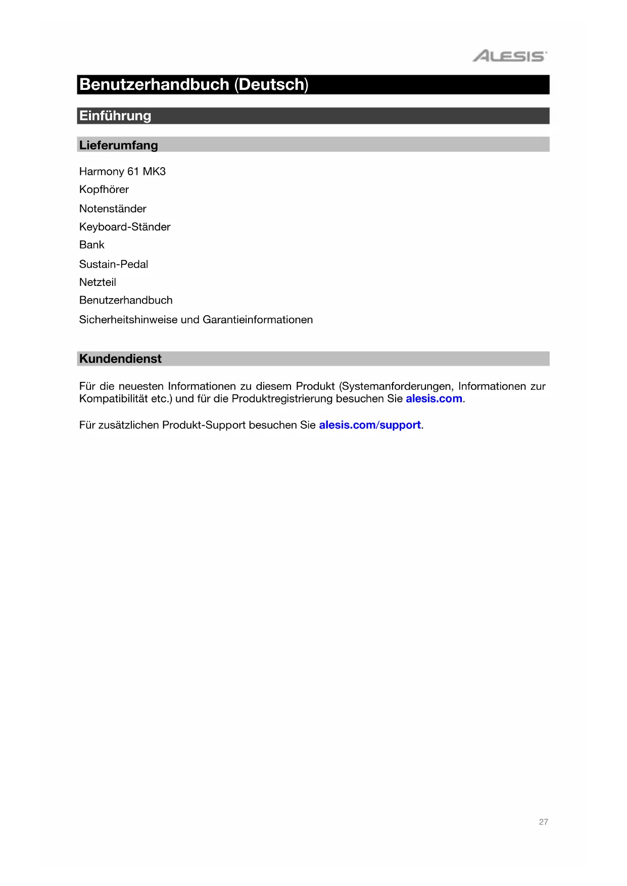 Benutzerhandbuch (Deutsch) Einführung Lieferumfang Harmony 61 MK3 Kopfhörer Notenständer Keyboard-Ständer Bank Sustain-Pedal Netzteil Benutzerhandbuch Sicherheitshinweise und Garantieinformationen