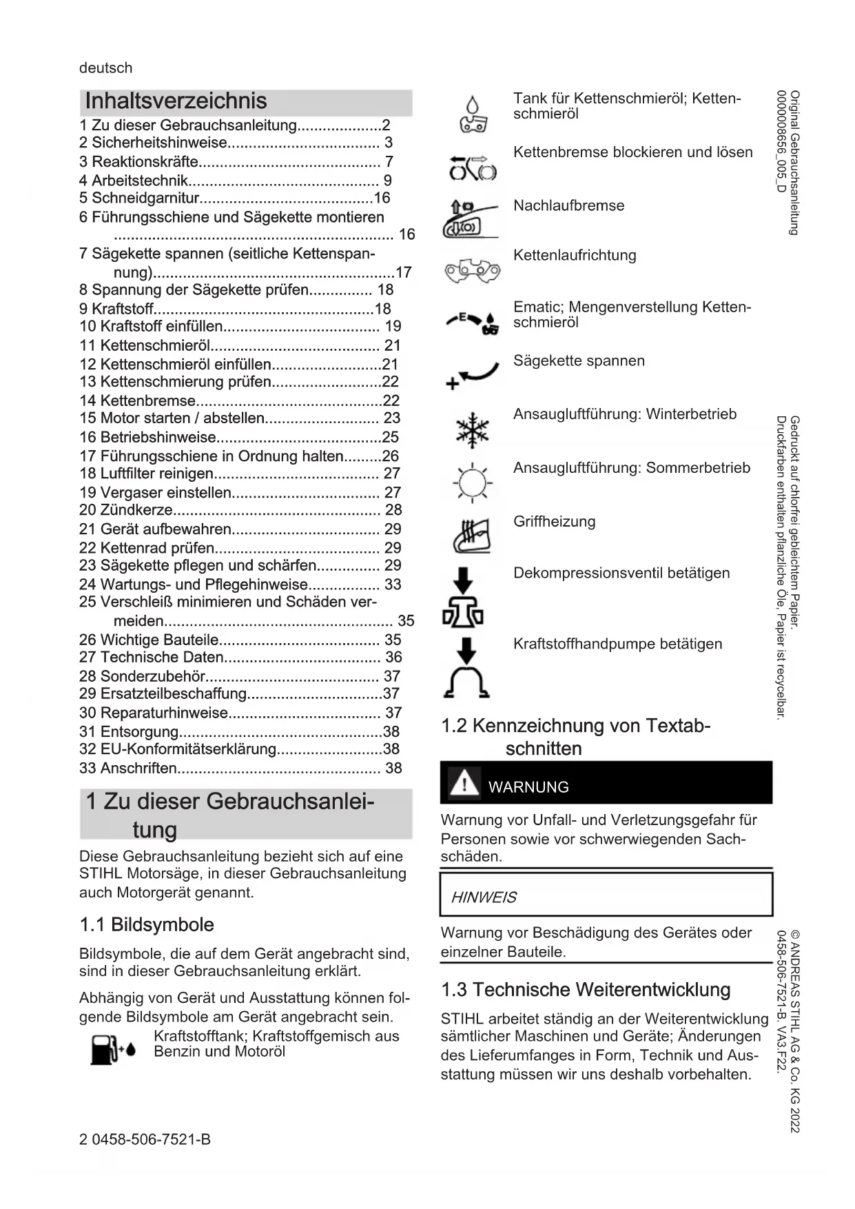 STIHL arbeitet ständig an der Weiterentwicklung sämtlicher Maschinen und Geräte; Änderungen des Lieferumfanges in Form, Technik und Aus‐ stattung müssen wir uns deshalb vorbehalten. deutsch 2 0458-506-7521-B © ANDREAS STIHL AG & Co. KG 2022 0458-506-7521-B. VA3.F22. Gedruckt auf chlorfrei gebleichtem Papier. Druckfarben enthalten pflanzliche Öle, Papier ist recycelbar. Original Gebrauchsanleitung 0000008656_005_DAus Angaben und Abbildungen dieser Gebrauchsanleitung können deshalb keine Ansprüche abgeleitet werden. 2 Sicherheitshinweise Besondere Sicherheitsmaßnahmen sind beim Arbeiten mit der Motorsäge erforderlich, weil mit sehr hoher Ket‐ tengeschwindigkeit gearbeitet wird und die Schneidezähne sehr scharf sind. Die gesamte Gebrauchsanleitung vor der ersten Inbetriebnahme aufmerk‐ sam lesen und für späteren Gebrauch sicher aufbewahren. Nichtbeachten der Gebrauchsanleitung kann lebens‐ gefährlich sein.