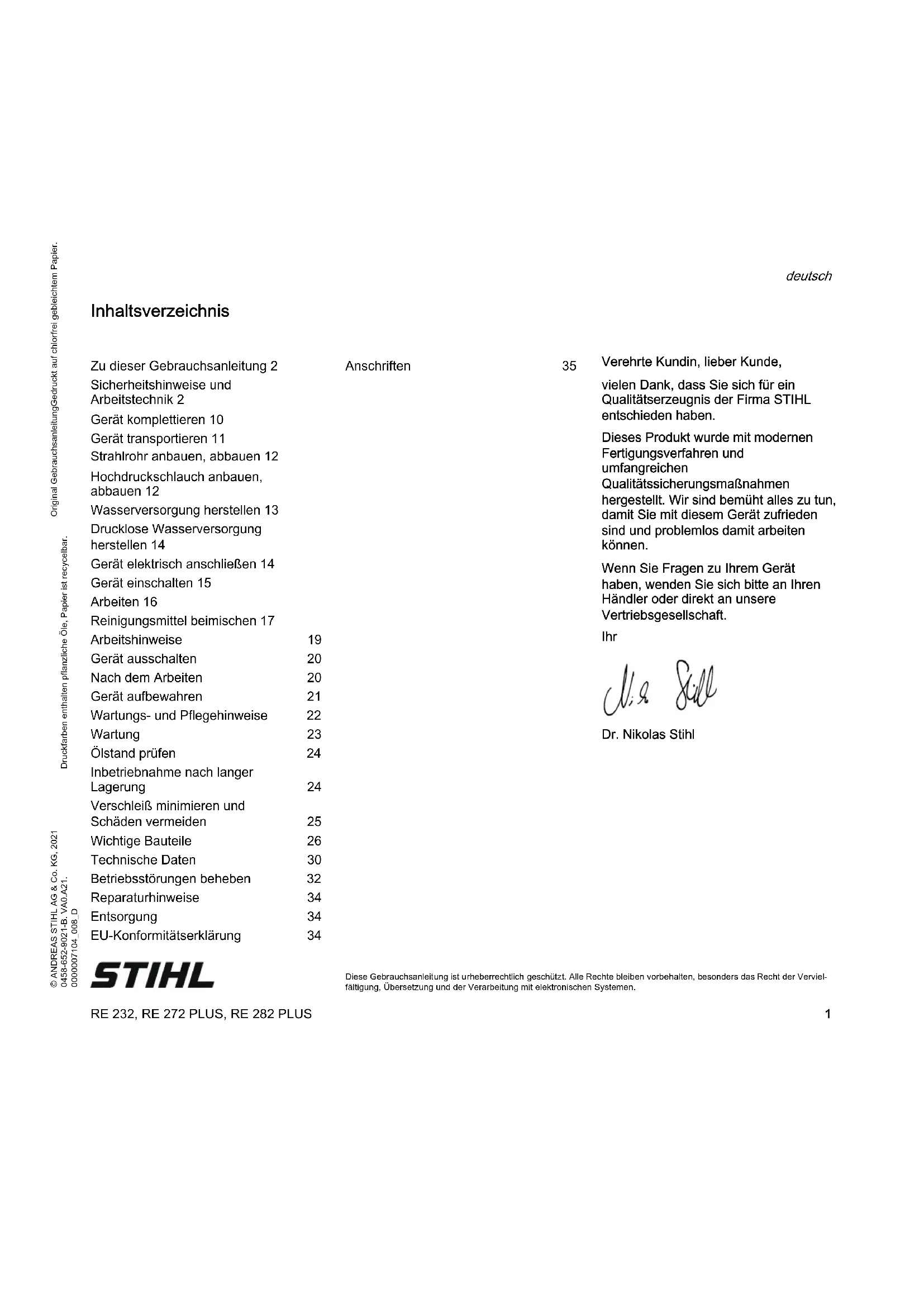 Diese Gebrauchsanleitung ist urheberrechtlich geschützt. Alle Rechte bleiben vorbehalten, besonders das Recht der Verviel- fältigung, Übersetzung und der Verarbeitung mit elektronischen Systemen. Inhaltsverzeichnis Verehrte Kundin, lieber Kunde, vielen Dank, dass Sie sich für ein Qualitätserzeugnis der Firma STIHL entschieden haben. Dieses Produkt wurde mit modernen Fertigungsverfahren und umfangreichen Qualitätssicherungsmaßnahmen hergestellt. Wir sind bemüht alles zu tun, damit Sie mit diesem Gerät zufrieden sind und problemlos damit arbeiten können. Wenn Sie Fragen zu Ihrem Gerät haben, wenden Sie sich bitte an Ihren Händler oder direkt an unsere Vertriebsgesellschaft. Ihr Dr. Nikolas Stihl Zu dieser Gebrauchsanleitung 2 Sicherheitshinweise und Arbeitstechnik 2 Gerät komplettieren 10 Gerät transportieren 11 Strahlrohr anbauen, abbauen 12 Hochdruckschlauch anbauen, abbauen 12 Wasserversorgung herstellen 13 Drucklose Wasserversorgung herstellen 14 Gerät elektrisch anschließen 14 Gerät einschalten 15 Arbeiten 16 Reinigungsmittel beimischen 17 Arbeitshinweise 19 Gerät ausschalten 20 Nach dem Arbeiten 20 Gerät aufbewahren 21 Wartungs- und Pflegehinweise 22 Wartung 23 Ölstand prüfen 24 Inbetriebnahme nach langer Lagerung 24 Verschleiß minimieren und Schäden vermeiden 25 Wichtige Bauteile 26 Technische Daten 30 Betriebsstörungen beheben 32 Reparaturhinweise 34 Entsorgung 34 EU-Konformitätserklärung 34 Anschriften 35RE 232, RE 272 PLUS, RE 282 PLUS deutsch