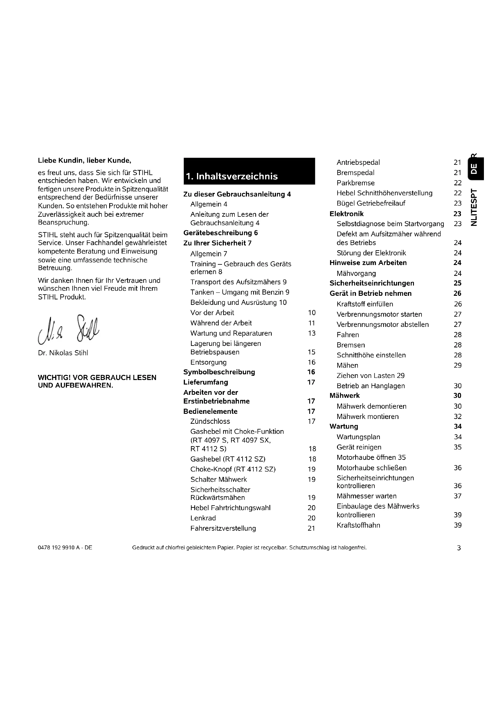 NLITESPT 0478 192 9910 A - DE Liebe Kundin, lieber Kunde, es freut uns, dass Sie sich für STIHL entschieden haben. Wir entwickeln und fertigen unsere Produkte in Spitzenqualität entsprechend der Bedürfnisse unserer Kunden. So entstehen Produkte mit hoher Zuverlässigkeit auch bei extremer Beanspruchung. STIHL steht auch für Spitzenqualität beim Service. Unser Fachhandel gewährleistet kompetente Beratung und Einweisung sowie eine umfassende technische Betreuung. Wir danken Ihnen für Ihr Vertrauen und wünschen Ihnen viel Freude mit Ihrem STIHL Produkt. Dr. Nikolas Stihl