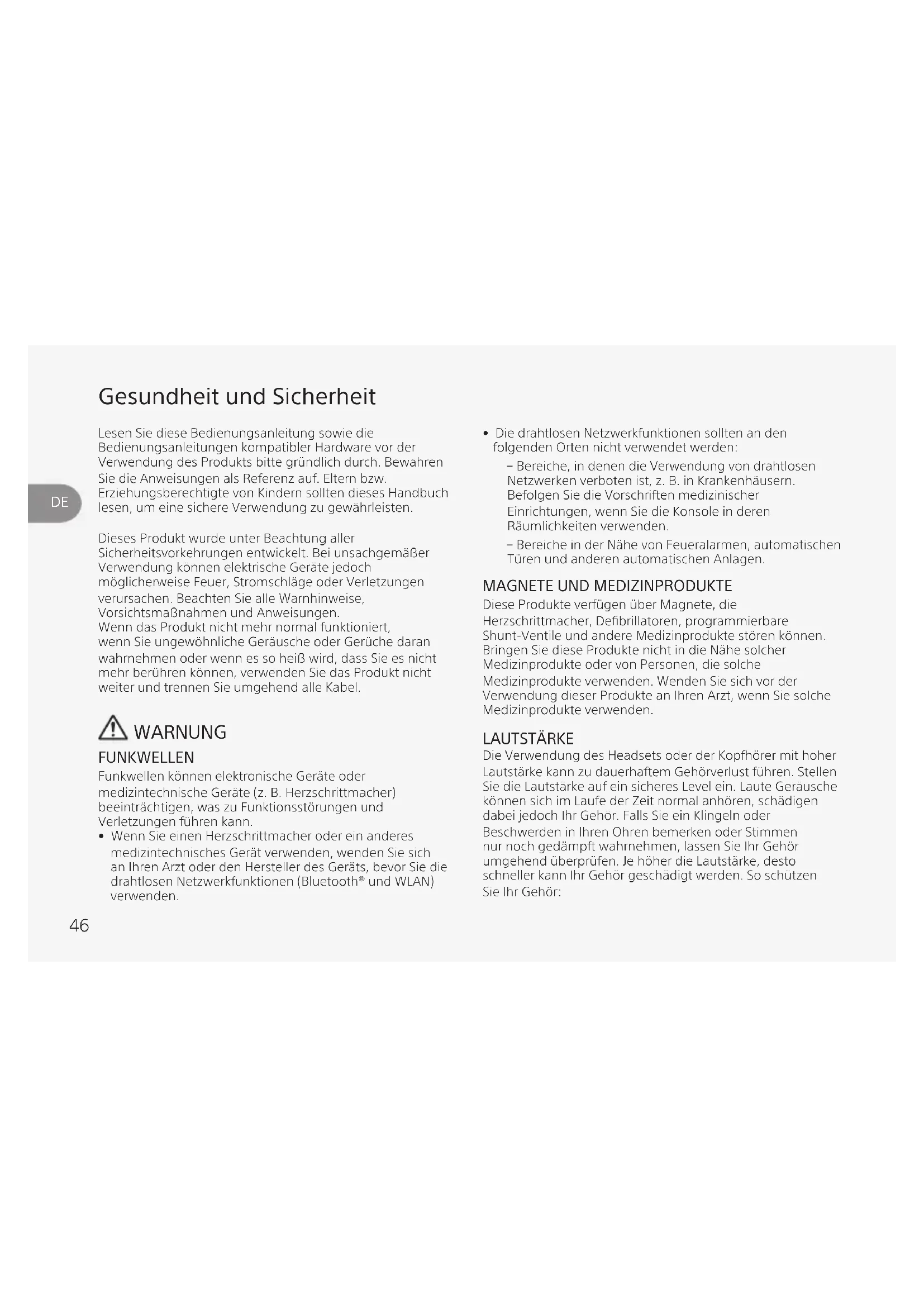 Diese Produkte verfügen über Magnete, die Herzschrittmacher, Defibrillatoren, programmierbare Shunt-Ventile und andere Medizinprodukte stören können. Bringen Sie diese Produkte nicht in die Nähe solcher Medizinprodukte oder von Personen, die solche Medizinprodukte verwenden. Wenden Sie sich vor der Verwendung dieser Produkte an Ihren Arzt, wenn Sie solche Medizinprodukte verwenden. LAUTSTÄRKE Die Verwendung des Headsets oder der Kopfhörer mit hoher Lautstärke kann zu dauerhaftem Gehörverlust führen. Stellen Sie die Lautstärke auf ein sicheres Level ein. Laute Geräusche können sich im Laufe der Zeit normal anhören, schädigen dabei jedoch Ihr Gehör. Falls Sie ein Klingeln oder Beschwerden in Ihren Ohren bemerken oder Stimmen nur noch gedämpft wahrnehmen, lassen Sie Ihr Gehör umgehend überprüfen. Je höher die Lautstärke, desto schneller kann Ihr Gehör geschädigt werden. So schützen Sie Ihr Gehör: Lesen Sie diese Bedienungsanleitung sowie die Bedienungsanleitungen kompatibler Hardware vor der Verwendung des Produkts bitte gründlich durch. Bewahren Sie die Anweisungen als Referenz auf. Eltern bzw. Erziehungsberechtigte von Kindern sollten dieses Handbuch lesen, um eine sichere Verwendung zu gewährleisten.Dieses Produkt wurde unter Beachtung aller Sicherheitsvorkehrungen entwickelt. Bei unsachgemäßer Verwendung können elektrische Geräte jedoch möglicherweise Feuer, Stromschläge oder Verletzungen verursachen. Beachten Sie alle Warnhinweise, Vorsichtsmaßnahmen und Anweisungen.Wenn das Produkt nicht mehr normal funktioniert, wenn Sie ungewöhnliche Geräusche oder Gerüche daran wahrnehmen oder wenn es so heiß wird, dass Sie es nicht mehr berühren können, verwenden Sie das Produkt nicht weiter und trennen Sie umgehend alle Kabel. WARNUNG FUNKWELLEN Funkwellen können elektronische Geräte oder medizintechnische Geräte (z. B. Herzschrittmacher) beeinträchtigen, was zu Funktionsstörungen und Verletzungen führen kann.• Wenn Sie einen Herzschrittmacher oder ein anderes medizintechnisches Gerät verwenden, wenden Sie sich an Ihren Arzt oder den Hersteller des Geräts, bevor Sie die drahtlosen Netzwerkfunktionen (Bluetooth® und WLAN) verwenden. DEGesundheit und Sicherheit DEDE