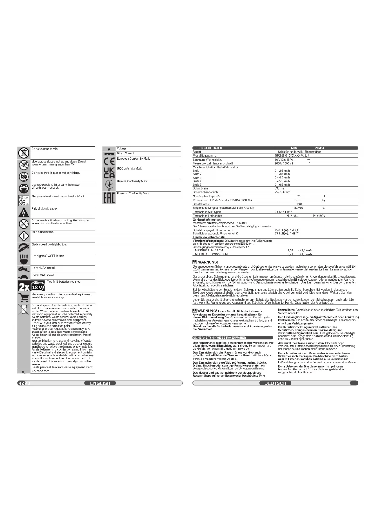 WARTUNG Kontrollieren Sie in regelmäßigen Abständen, dass das Messer und alle Befestigungs- und Einstellschrauben fest angezogen sind. Überprüfen Sie den Grasfangkorb regelmäßig und ersetzen Sie ihn im Falle von Verschleiß- oder Abnutzungserscheinungen durch einen neuen. Den Rasenmäher nicht mit einem Schlauch abspritzen, damit kein Wasser in die Maschine oder die elektrischen Anschlüsse eindringt. Entfernen Sie vor Wartung, Montage, Einstellung, Reinigung, Säuberung und bei Nichtgebrauch den Akku. Halten Sie den Rasenmäher sorgfältig instand. Für optimale Ergebnisse und sicheres Arbeiten die Messerklingen immer scharf und sauber halten. Verwenden Sie nur original Ersatzmesser von MILWAUKEE. Seien Sie bei der Messerpfl ege sehr vorsichtig. Wickeln Sie das/ die Messer ein oder tragen Sie Schutzhandschuhe. Beschädigte Messer sind zu ersetzen. Versuchen Sie nicht, Messer zu reparieren oder zu verändern. Verwenden Sie nur Originalersatzteile, Zubehör und Anbauteile des Herstellers.Andernfalls kann es zu Verletzungen kommen, die Leistung kann beeinträchtigt werden und die Garantie kann erlöschen. Ein stumpfes Messer an beiden Seiten gleichmäßig schärfen, damit es nicht unrund läuft. Reinigen Sie das Messer gründlich und überprüfen Sie dessen Rundlauf. Dazu einen dünnen Nagel in die mittlere Öff nung einsetzen und das Messer horizontal darauf drehen. Der Nagel muss sich ebenfalls in horizontaler Position befi nden. Sollte das Messer unrund laufen, an der schwereren bzw. tiefer hängenden Seite weiteres Material abtragen, bis das Messer rund läuft. Das Messer läuft rund, wenn es sich gleichmäßig dreht, ohne auf einer Seite tiefer zu hängen. Verbogene oder angeschlagene Messer austauschen. Ein nicht ausgewuchtetes Messer verursacht Vibrationen und kann zu Schäden am Mäher oder Verletzungen führen. Nur Zubehör und Ersatzteile von Milwaukee verwenden. Bauteile, deren Austausch nicht beschrieben wurde, bei einer Milwaukee Kundendienststelle auswechseln lassen (Broschüre Garantie/ Kundendienstadressen beachten). Bei Bedarf kann eine Explosionszeichnung des Gerätes unter Angabe der Maschinen Type und der sechsstelligen Nummer auf dem Leistungsschild bei Ihrer Kundendienststelle oder direkt bei Techtronic Industries GmbH, Max-Eyth-Straße 10, 71364 Winnenden, Germany angefordert werden. SYMBOLE Bitte lesen Sie die Gebrauchsanweisung vor Inbetriebnahme sorgfältig durch. ACHTUNG! WARNUNG! GEFAHR! Vor allen Arbeiten an der Maschine den Wechselakku herausnehmen Beim Arbeiten mit der Maschine stets Schutzbrille tragen. Gehörschutz tragen! Schutzhandschuhe tragen! Lange Hosen tragen Sicherheitsschuhe tragen! Vor Gebrauch die Bedienungsanleitung lesen und verstehen. Alle Warnungen und Sicherheitshinweise beachten. WARNUNG – Auf weggeschleudertes Material achten – Umstehende Personen fernhalten. WARNUNG – Hände und Füße von den Messern fernhalten. Vor Wartungsarbeiten den Akku entnehmen. ACHTUNG! - Hebegefahr. Kann zu Verletzungen führen. Nicht in die eingeschaltete Lichtquelle sehen. GEFAHR – Hände und Füße fern- halten. Quetschgefahr Vor Regen schützen. Immer quer und niemals längs zur Hangneigung arbeiten. Nicht auf Flächen mit einer Neigung über 15° verwenden. Nicht bei Regen oder feuchter Witterung mähen. Den Rasenmäher zu zweit anheben oder tragen. Achten Sie beim Anheben auf einen sicheren, rückenschonenden Stand. Der garantierte Schallleistungspegel beträgt 96 dB. Achtung! Stromschlaggefahr. Den Rasenmäher nicht mit einem Schlauch abspritzen, damit kein Wasser in die Maschine oder die elektrischen Anschlüsse eindringt. Taste Schneidwerk starten. Taste Messerdrehzahl langsam/schnell. Taste Scheinwerfer AN/AUS. höhere max.Geschwindigkeit niedrigere max. Geschwindigkeit. Zwei M18-Akkus erforderlich. Zubehör - Im Lieferumfang nicht enthalten, empfohlene Ergänzung aus dem Zubehörprogramm. Altbatterien, Elektro- und Elektronik-Altgeräte dürfen nicht zusammen mit dem Hausmüll entsorgt werden. Altbatterien, Elektro- und Elektronik-Altgeräte sind getrennt zu sammeln und zu entsorgen. Entfernen Sie Altbatterien, Altakkumulatorn und Leuchtmittel vor dem Entsorgen aus den Geräten. Erkundigen Sie sich bei den örtlichen Behörden oder bei Ihrem Fachhändler nach Recyclinghöfen und Sammelstellen. Je nach den örtlichen Bestimmungen können Ein- zelhändler verpfl ichtet sein, Altbatterien, Elektro- und Elektronik-Altgeräte kostenlos zurückzunehmen. Tragen Sie durch Wiederverwendung und Recycling Ihrer Altbatterien, Elektro- und Elektronik-Altgeräte dazu bei, den Bedarf an Rohmaterialien zu verringern. Altbatterien (vor allem Lithium-Ionen-Batterien), Elektro- und Elektronik-Altgeräte enthalten wertvolle, wiederverwertbare Materialien, die bei nicht umwelt- gerechter Entsorgung negative Auswirkungen auf die Umwelt und Ihre Gesundheit haben können. Löschen Sie vor der Entsorgung möglicherweise auf Ihrem Altgerät vorhandene personenbezogene Daten.