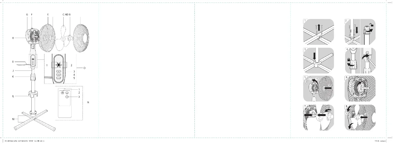 A. Schutzgitter (vorne) B. Propellermutter C. Ventilatorügel D. Kunststomutter E. Schutzgitter (hinten) F. Oszillationsknopf G. Motoreinheit H. Motorwelle