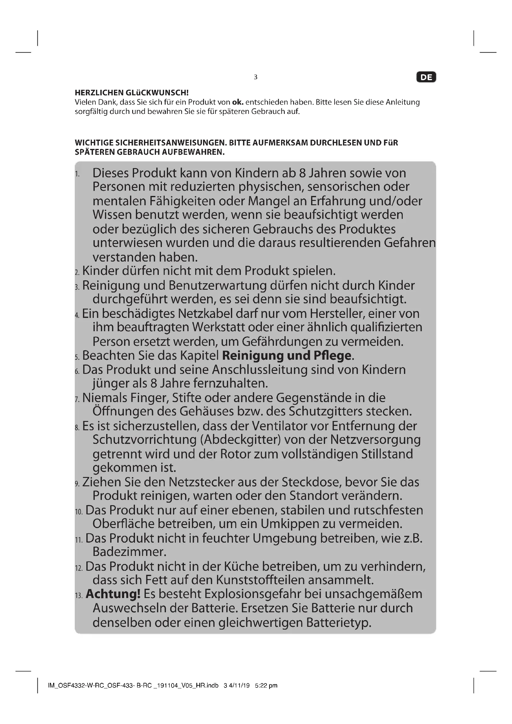 HERZLICHEN GLüCKWUNSCH! Vielen Dank, dass Sie sich für ein Produkt von ok. entschieden haben. Bitte lesen Sie diese Anleitung sorgfältig durch und bewahren Sie sie für späteren Gebrauch auf. WICHTIGE SICHERHEITSANWEISUNGEN. BITTE AUFMERKSAM DURCHLESEN UND FüR SPÄTEREN GEBRAUCH AUFBEWAHREN.