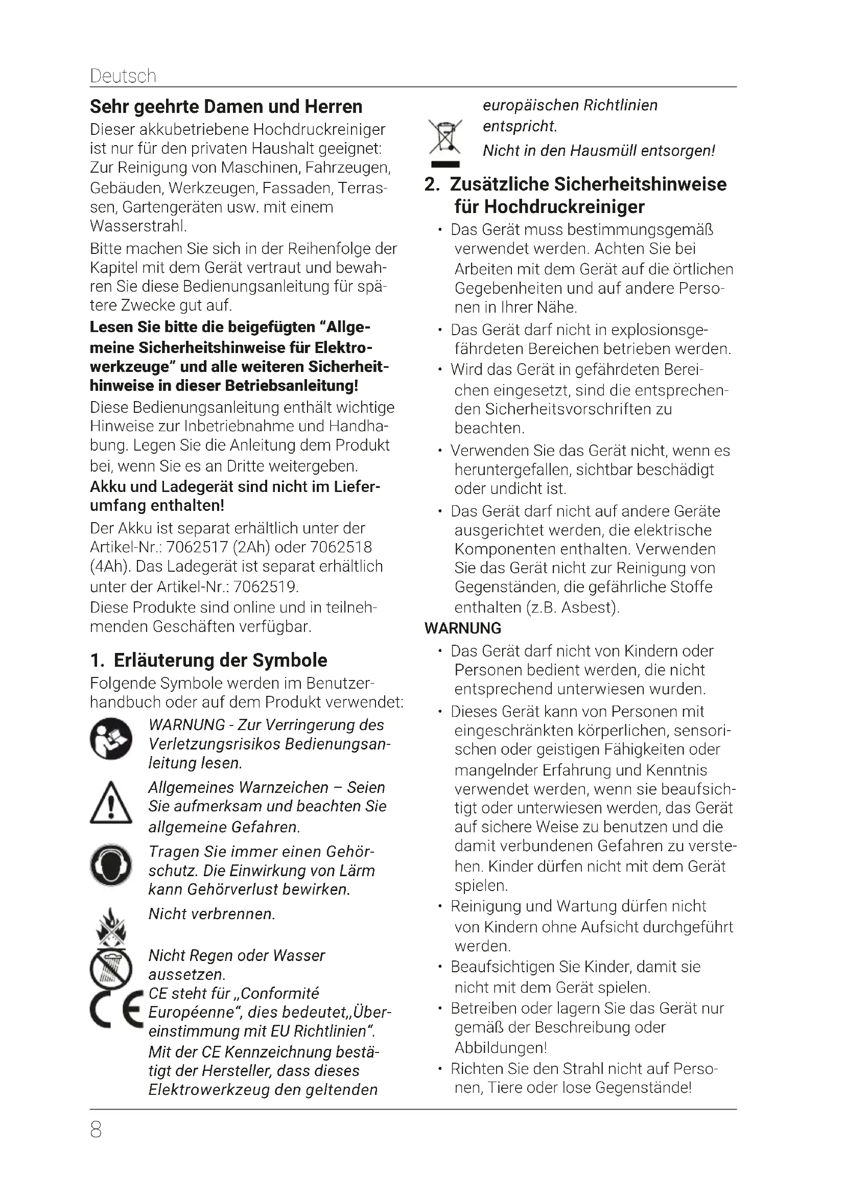 Sehr geehrte Damen und Herren Dieser akkubetriebene Hochdruckreiniger ist nur für den privaten Haushalt geeignet: Zur Reinigung von Maschinen, Fahrzeugen, Gebäuden, Werkzeugen, Fassaden, Terras- sen, Gartengeräten usw. mit einem Wasserstrahl. Bitte machen Sie sich in der Reihenfolge der Kapitel mit dem Gerät vertraut und bewah- ren Sie diese Bedienungsanleitung für spä- tere Zwecke gut auf. Lesen Sie bitte die beigefügten “Allge- meine Sicherheitshinweise für Elektro- werkzeuge” und alle weiteren Sicherheit- hinweise in dieser Betriebsanleitung! Diese Bedienungsanleitung enthält wichtige Hinweise zur Inbetriebnahme und Handha- bung. Legen Sie die Anleitung dem Produkt bei, wenn Sie es an Dritte weitergeben. Akku und Ladegerät sind nicht im Liefer- umfang enthalten! Der Akku ist separat erhältlich unter der Artikel-Nr.: 7062517 (2Ah) oder 7062518 (4Ah). Das Ladegerät ist separat erhältlich unter der Artikel-Nr.: 7062519. Diese Produkte sind online und in teilneh- menden Geschäften verfügbar.