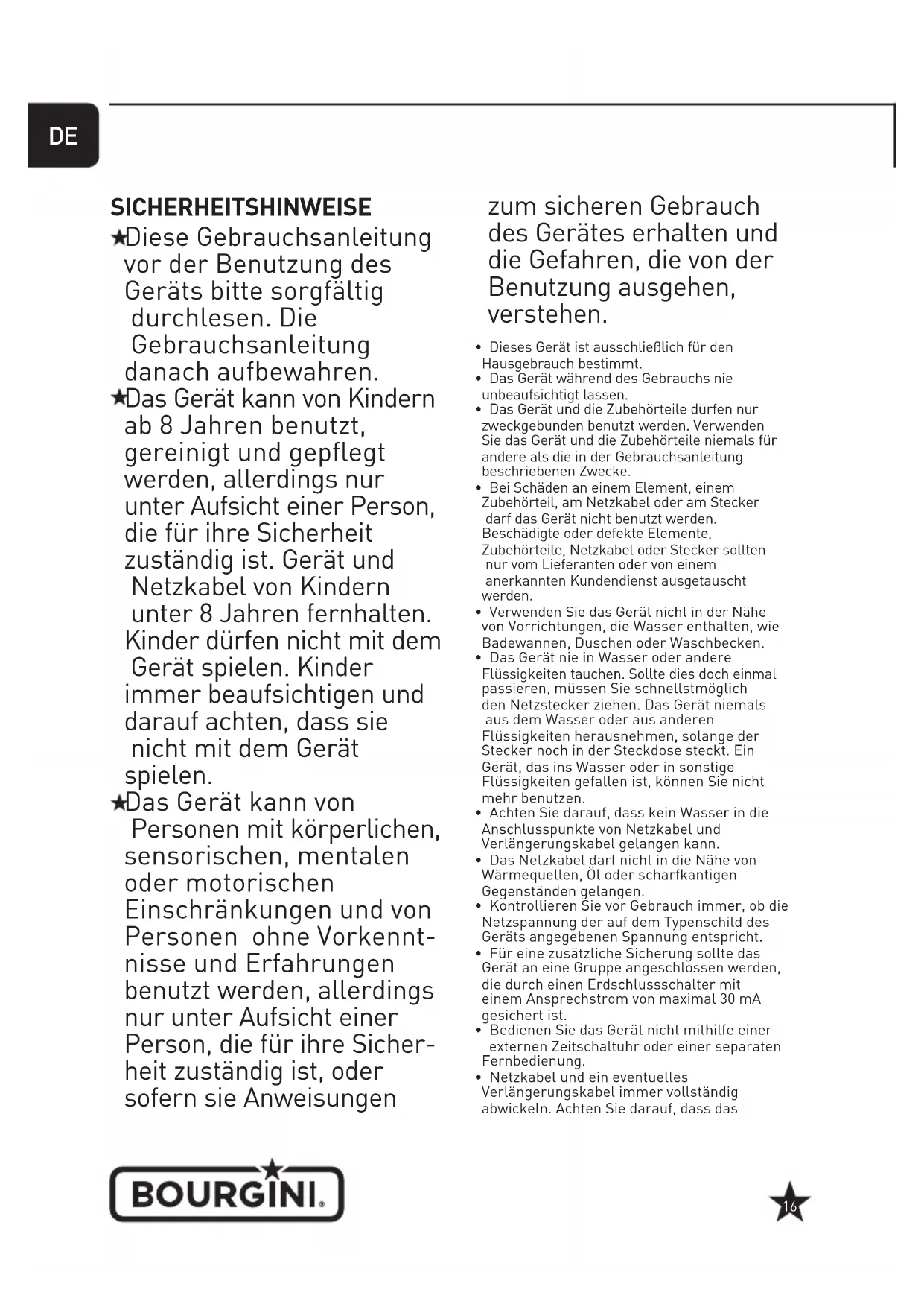 Die Garantie wird für die Dauer von zwei Jahren ab dem auf dem Kassenbon angegebenen Kaufdatum gewährt. Der Kassenbon gilt als Garantieschein. Sie können die Garantie bei dem Einzelhändler einlösen, bei dem Sie das Gerät gekauft haben. Die Garantie deckt keine Schäden, die durch falsche Nutzung, unsachgemäßes Auseinandernehmen, Fallenlassen, Stöße u. Ä. entstanden sind sowie Schäden an Geräten, die mit Wasser benutzt werden, die durch zu spätes Entkalken entstehen. Sofern bei einem bestimmten Produkt besondere Garantiebestimmungen angegeben werden, gelten diese vor den Allgemeinen Garantiebestim- mungen. Die Garantie gilt nicht für Folgeschäden. Bei Fragen zur Anwendung des Produkts besuchen Sie bitte unsere Website: www.bourgini.com HAFTUNGSAUSSCHLUSS Änderungen vorbehalten; Produktspezifikationen können ohne Angabe von Gründen geändert werden.