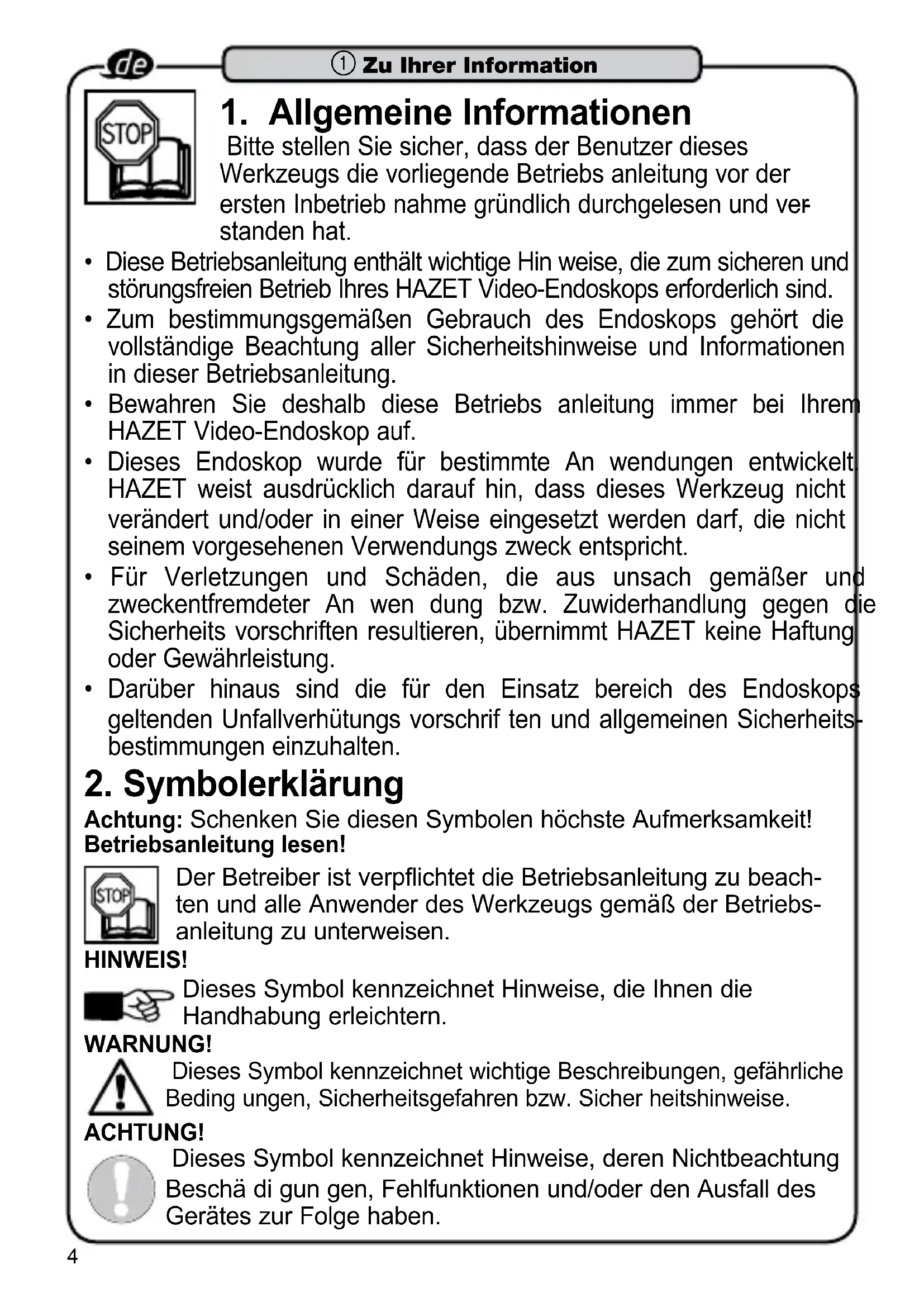 - Diese Betriebsanleitung enthält wichtige Hin weise, die zum sicheren und störungsfreien Betrieb Ihres HAZET Video-Endoskops erforderlich sind.