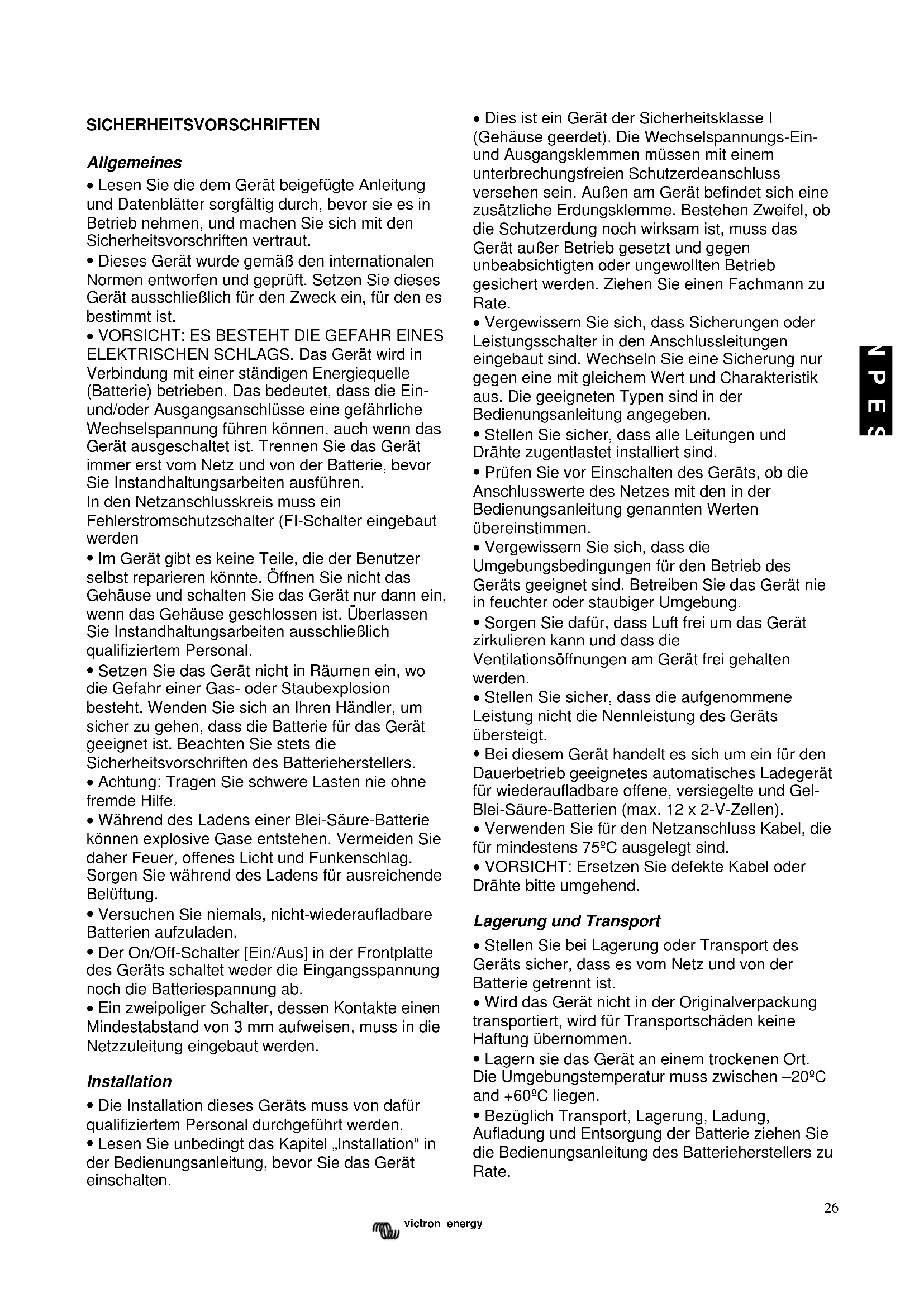 Bezüglich Transport, Lagerung, Ladung, Aufladung und Entsorgung der Batterie ziehen Sie die Bedienungsanleitung des Batterieherstellers zu Rate.27 victron energy BESCHREIBUNG Technologie Das Phoenix Ladegerät ist ein Hochfrequenz- Switch-Mode-Batterieladegerät. Sein Eingang ist elektronisch in der ersten Leistungsstufe leistungsfaktorverbessert. Die zweite Stufe sorgt für galvanische Trennung und dafür, dass an den Ausgangsklemmen eine saubere Gleichspannung zur Verfügung steht. Durch den mikroprozessorgesteuerten Ladevorgang wird ein exakter Ladezustand der Batterie garantiert. Die elektronischen Bauteile im Innern sind durch eine Spezialbeschichtung gegen Feuchtigkeit und Schmutz geschützt, was eine lange Lebensdauer Ihres Batterieladegeräts gewährleistet. Zwei große Batterien und eine zusätzliche kleine Batterie können mit diesem Ladegerät geladen werden. Adaptiver Ladevorgang Das neue Phoenix Ladegerät nutzt die adaptive Ladecharakteristik. Die adaptive Ladecharakteristik unterscheidet sich von anderen Ladecharakteristiken in mehrfacher Hinsicht. Die drei wichtigsten Aspekte sind die Schnellladefunktion, der Sicherheitsmodus und der Ganzjahres-Modus. Allgemein ausgedrückt, passt sich das Phoenix Ladegerät an die angeschlossenen Batterien an. Schnellladefunktion In der ersten Stufe des Ladezyklus, der Konstantphase, werden die Batterien mit einem höheren Strom geladen als bei herkömmlichen Lademethoden. Die Konstantphase ist beendet, wenn die Batteriespannung 14,4 V bzw. 28,8 V beträgt. Dann beginnt die Konstantspannungsphase. Die Dauer der Konstantspannungsphase wird aus der gemessenen Konstantladedauer berechnet. Zu diesem Zweck überwacht der Mikroprozessor des Ladegeräts verschiedene Parameter der Batterie. Sicherheitsmodus Was aber, wenn Ihre Batterie eine höhere Konstantspannung benötigt? Das Ladegerät erhöht allmählich die an die Batterie angelegte Spannung, bis die vorgegebene Konstantspannung erreicht ist. Diese Phase bezeichnen wir als Sicherheitsmodus und schützt Ihre Batterie vor Zerstörung durch Überladen. Das Phoenix Ladegerät besitzt eine Temperaturkompensation. Das Gerät nimmt auf der Grundlage der Batterietemperatur eine Neuberechnung verschiedener Werte vor. Ganzjahres-Modus In Zeiten, in denen Sie Ihre Batterien nicht benutzen und die Netzspannung am Ladegerät anliegt, verringert das Phoenix Ladegerät seine Ladeerhaltungsspannung. Auf diese Weise wird die Gasung der Batterie verringert, damit sie nicht austrocknet, wenn sie über längere Zeit nicht verwendet wird. Damit Ihre Batterien sich in einwandfreiem Zustand befinden, erhöht das Phoenix Ladegerät die angelegte Spannung einmal pro Woche. Dies bezeichnen wir als die wiederholte Konstantspannungsphase. Betrieb Das Ladegerät lädt die Batterie mit einer 4-stufigen adaptiven Ladecharakteristik. (Siehe Technische Beschreibung auf der Rückseite.) Es kann ständig an die Batterie angeschlossen bleiben, ohne dass es durch Überladung zur vermehrten Gasung kommt. Das Ladegerät kann für unterschiedliche Batterietypen eingesetzt werden. Die Voreinstellung ist für eine EXIDE Gel G210 Batterie vorgesehen(Siehe Spezifikation für andere vorprogrammierte Batterietypen.) Beim Einsatz mit anderen Batterietypen wenden Sie sich bitte an Ihren Batteriehändler, der Ihnen die richtigen Ladespannungen nennt. Lassen Sie gegebenenfalls Ihr Phoenix Ladegerät neu einstellen. Der Gesamtladestrom des Phoenix Ladegeräts wird auf zwei Hauptausgänge aufgeteilt. Es gibt einen zusätzlichen Ausgang mit begrenzter Ladekapazität, um beispielsweise die Starterbatterie zu laden. Die Ausgänge des Ladegeräts sind gegen Kurzschluss und zu hohe Umgebungstemperatur geschützt. Temperaturfühler Das Phoenix Ladegerät wird werkseitig mit einem Temperaturfühler ausgeliefert, der die Batterietemperatur misst und die Ladespannung dementsprechend angleicht. Dadurch wird eine bessere Ladung erreicht und eine längere Lebensdauer der Batterie gewährleistet