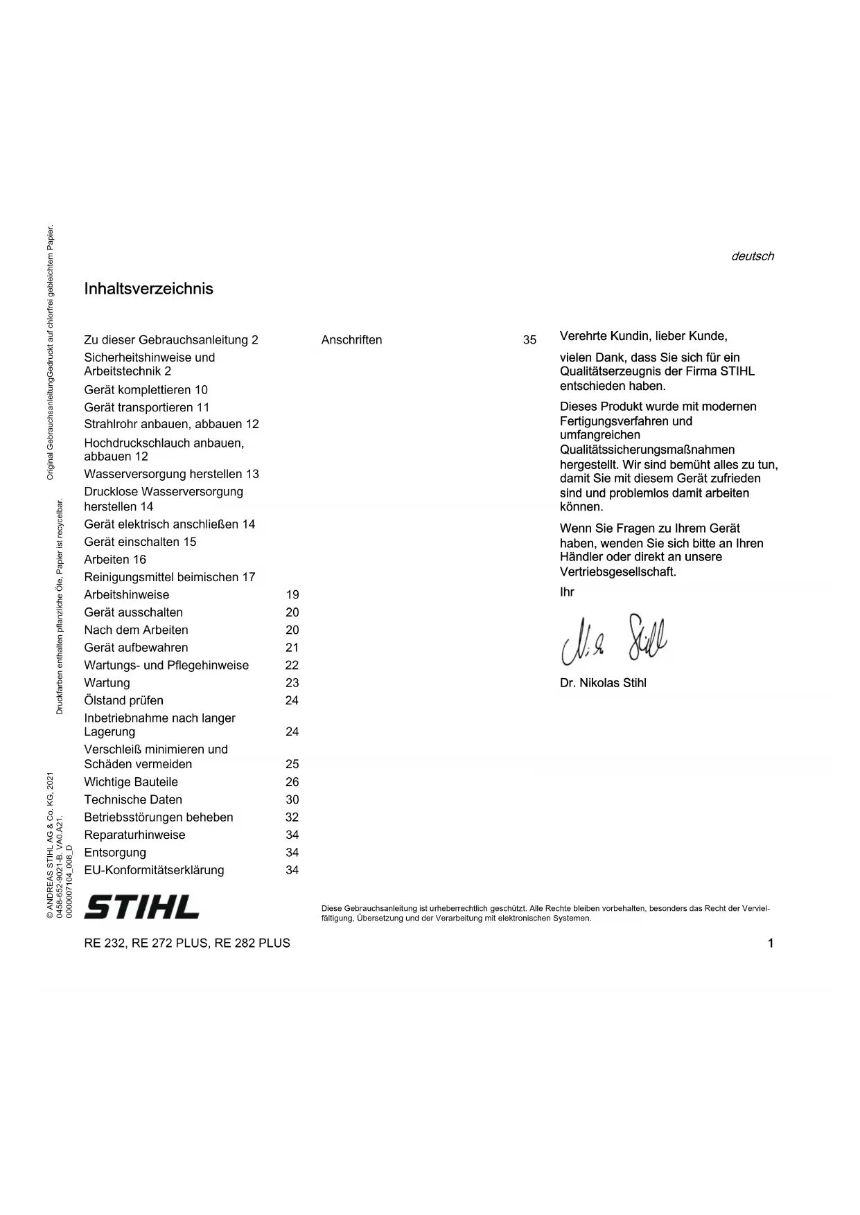Diese Gebrauchsanleitung ist urheberrechtlich geschützt. Alle Rechte bleiben vorbehalten, besonders das Recht der Verviel- fältigung, Übersetzung und der Verarbeitung mit elektronischen Systemen. Inhaltsverzeichnis Verehrte Kundin, lieber Kunde, vielen Dank, dass Sie sich für ein Qualitätserzeugnis der Firma STIHL entschieden haben. Dieses Produkt wurde mit modernen Fertigungsverfahren und umfangreichen Qualitätssicherungsmaßnahmen hergestellt. Wir sind bemüht alles zu tun, damit Sie mit diesem Gerät zufrieden sind und problemlos damit arbeiten können. Wenn Sie Fragen zu Ihrem Gerät haben, wenden Sie sich bitte an Ihren Händler oder direkt an unsere Vertriebsgesellschaft. Ihr Dr. Nikolas Stihl Zu dieser Gebrauchsanleitung 2 Sicherheitshinweise und Arbeitstechnik 2 Gerät komplettieren 10 Gerät transportieren 11 Strahlrohr anbauen, abbauen 12 Hochdruckschlauch anbauen, abbauen 12 Wasserversorgung herstellen 13 Drucklose Wasserversorgung herstellen 14 Gerät elektrisch anschließen 14 Gerät einschalten 15 Arbeiten 16 Reinigungsmittel beimischen 17 Arbeitshinweise 19 Gerät ausschalten 20 Nach dem Arbeiten 20 Gerät aufbewahren 21 Wartungs- und Pflegehinweise 22 Wartung 23 Ölstand prüfen 24 Inbetriebnahme nach langer Lagerung 24 Verschleiß minimieren und Schäden vermeiden 25 Wichtige Bauteile 26 Technische Daten 30 Betriebsstörungen beheben 32 Reparaturhinweise 34 Entsorgung 34 EU-Konformitätserklärung 34 Anschriften 35RE 232, RE 272 PLUS, RE 282 PLUS deutsch