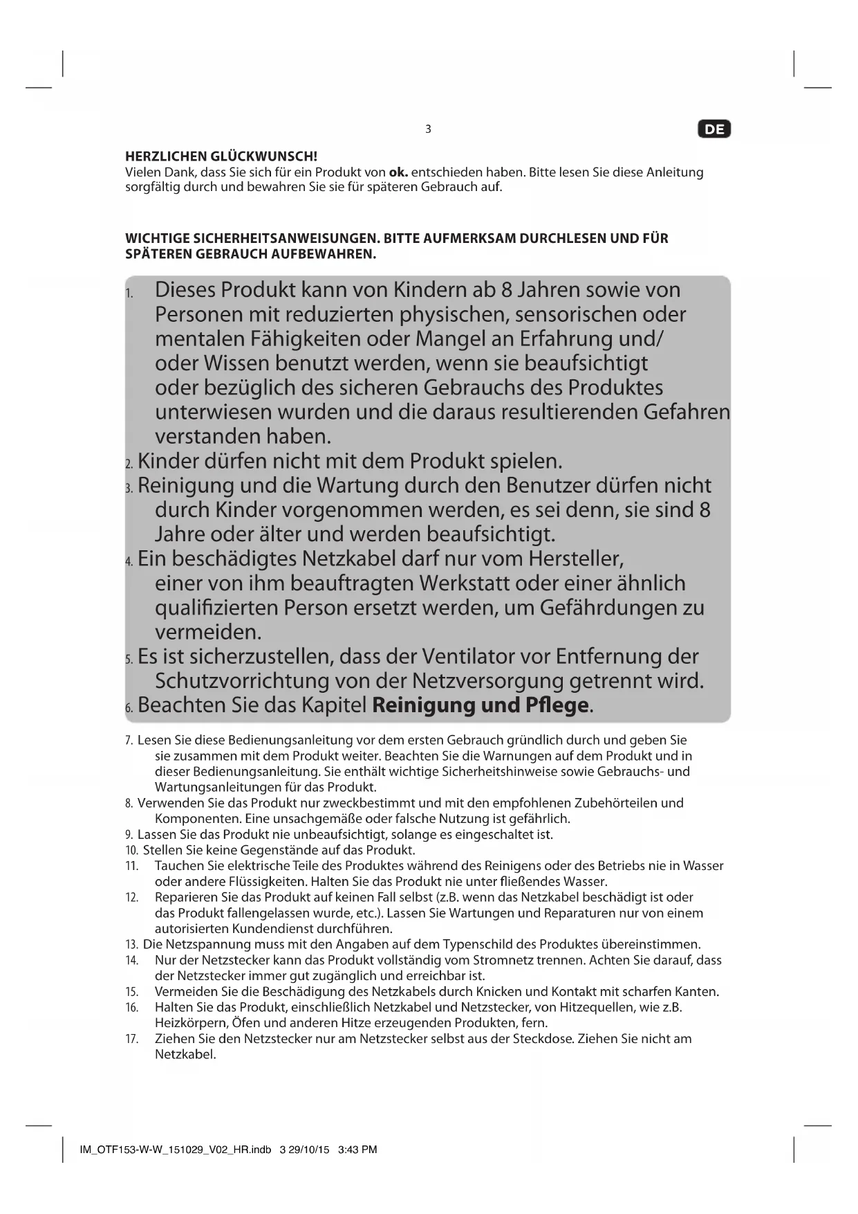 HERZLICHEN GLüCKWUNSCH! Vielen Dank, dass Sie sich für ein Produkt von ok. entschieden haben. Bitte lesen Sie diese Anleitung sorgfältig durch und bewahren Sie sie für späteren Gebrauch auf. WICHTIGE SICHERHEITSANWEISUNGEN. BITTE AUFMERKSAM DURCHLESEN UND FüR SPÄTEREN GEBRAUCH AUFBEWAHREN.