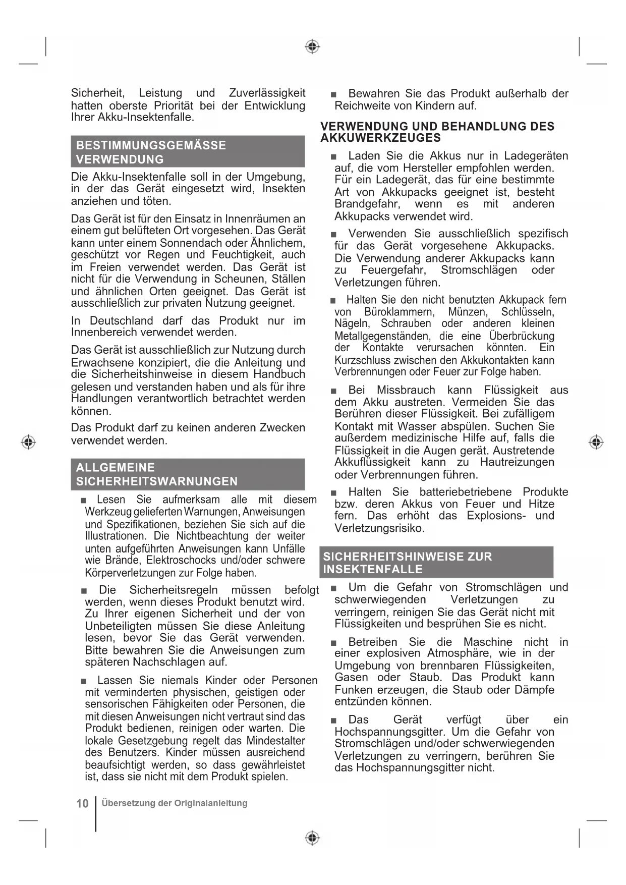 AKKUWERKZEUGES ■ Laden Sie die Akkus nur in Ladegeräten auf, die vom Hersteller empfohlen werden. Für ein Ladegerät, das für eine bestimmte Art von Akkupacks geeignet ist, besteht Brandgefahr, wenn es mit anderen Akkupacks verwendet wird. ■ Verwenden Sie ausschließlich spezifisch für das Gerät vorgesehene Akkupacks. Die Verwendung anderer Akkupacks kann zu Feuergefahr, Stromschlägen oder Verletzungen führen. ■ Halten Sie den nicht benutzten Akkupack fern von Büroklammern, Münzen, Schlüsseln, Nägeln, Schrauben oder anderen kleinen Metallgegenständen, die eine Überbrückung der Kontakte verursachen könnten. Ein Kurzschluss zwischen den Akkukontakten kann Verbrennungen oder Feuer zur Folge haben. ■ Bei Missbrauch kann Flüssigkeit aus dem Akku austreten. Vermeiden Sie das Berühren dieser Flüssigkeit. Bei zufälligem Kontakt mit Wasser abspülen. Suchen Sie außerdem medizinische Hilfe auf, falls die Flüssigkeit in die Augen gerät. Austretende Akkuflüssigkeit kann zu Hautreizungen oder Verbrennungen führen. ■ Halten Sie batteriebetriebene Produkte bzw. deren Akkus von Feuer und Hitze fern. Das erhöht das Explosions- und Verletzungsrisiko. SICHERHEITSHINWEISE ZUR INSEKTENFALLE ■ Um die Gefahr von Stromschlägen und schwerwiegenden Verletzungen zu verringern, reinigen Sie das Gerät nicht mit Flüssigkeiten und besprühen Sie es nicht. ■ Betreiben Sie die Maschine nicht in einer explosiven Atmosphäre, wie in der Umgebung von brennbaren Flüssigkeiten, Gasen oder Staub. Das Produkt kann Funken erzeugen, die Staub oder Dämpfe entzünden können. ■ Das Gerät verfügt über ein Hochspannungsgitter. Um die Gefahr von Stromschlägen und/oder schwerwiegenden Verletzungen zu verringern, berühren Sie das Hochspannungsgitter nicht.DEUTSCH