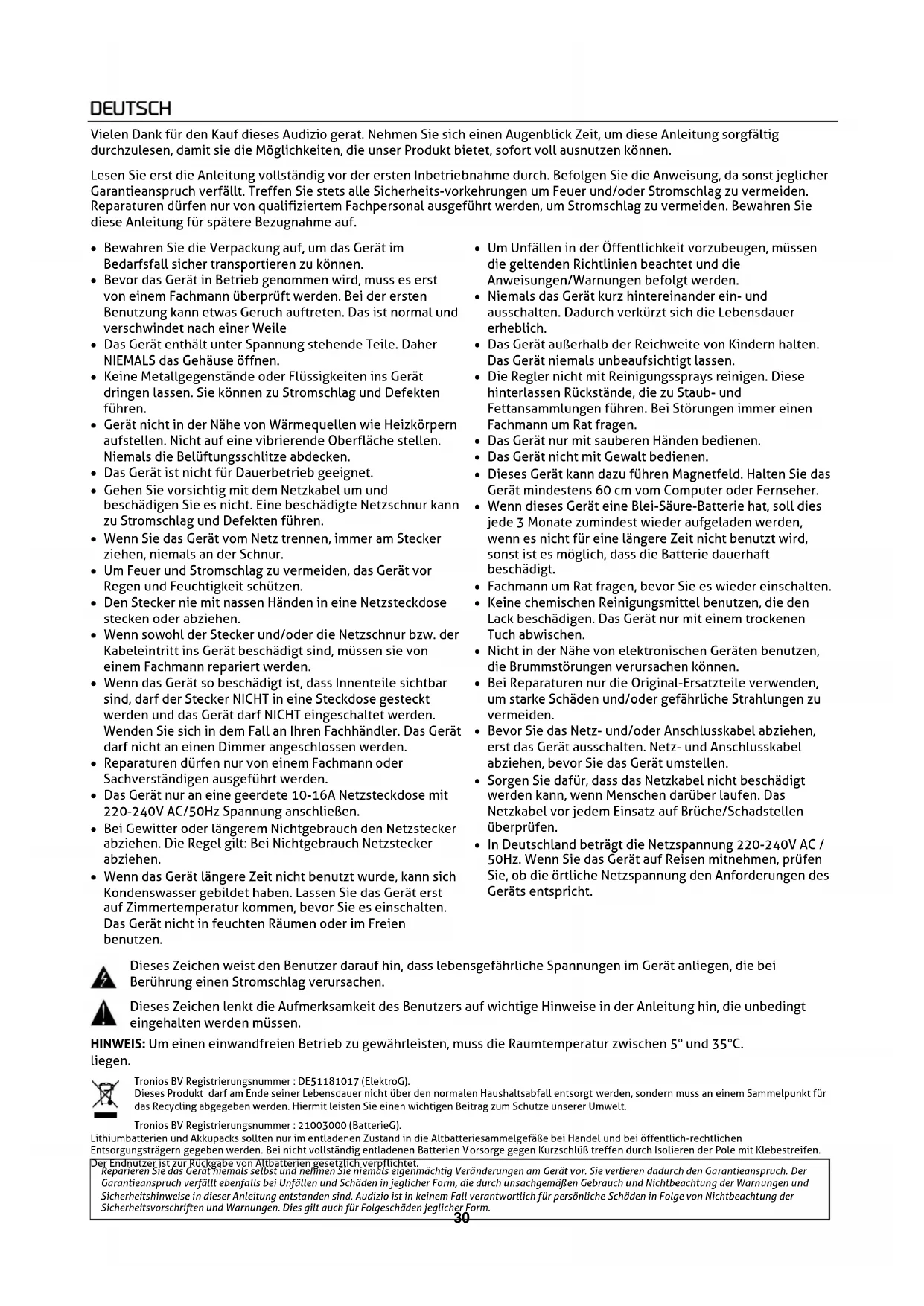 - In Deutschland beträgt die Netzspannung 220-240V AC / 50Hz. Wenn Sie das Gerät auf Reisen mitnehmen, prüfen Sie, ob die örtliche Netzspannung den Anforderungen des Geräts entspricht. Dieses Zeichen weist den Benutzer darauf hin, dass lebensgefährliche Spannungen im Gerät anliegen, die bei Berührung einen Stromschlag verursachen. Dieses Zeichen lenkt die Aufmerksamkeit des Benutzers auf wichtige Hinweise in der Anleitung hin, die unbedingt eingehalten werden müssen. HINWEIS: Um einen einwandfreien Betrieb zu gewährleisten, muss die Raumtemperatur zwischen 5° und 35°C. liegen. Tronios BV Registrierungsnummer : DE51181017 (ElektroG). Dieses Produkt darf am Ende seiner Lebensdauer nicht über den normalen Haushaltsabfall entsorgt werden, sondern muss an einem Sammelpunkt für das Recycling abgegeben werden. Hiermit leisten Sie einen wichtigen Beitrag zum Schutze unserer Umwelt. Tronios BV Registrierungsnummer : 21003000 (BatterieG). Lithiumbatterien und Akkupacks sollten nur im entladenen Zustand in die Altbatteriesammelgefäße bei Handel und bei öffentlich-rechtlichen Entsorgungsträgern gegeben werden. Bei nicht vollständig entladenen Batterien Vorsorge gegen Kurzschlüß treffen durch Isolieren der Pole mit Klebestreifen. Der Endnutzer ist zur Rückgabe von Altbatterien gesetzlich verpflichtet.