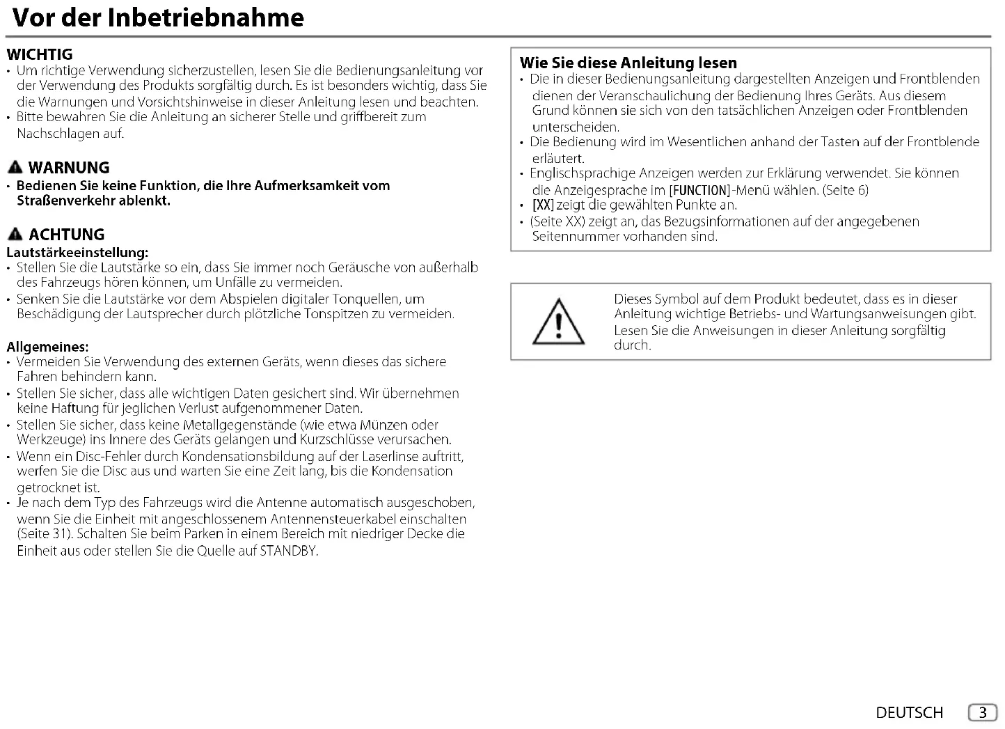- (Seite XX) zeigt an, das Bezugsinformationen auf der angegebenen Seitennummer vorhanden sind. Dieses Symbol auf dem Produkt bedeutet, dass es in dieser Anleitung wichtige Betriebs- und Wartungsanweisungen gibt. Lesen Sie die Anweisungen in dieser Anleitung sorgfältig durch. JS_KWD_DPX_5200BT_EN_GE.indd 3JS_KWD_DPX_5200BT_EN_GE.indd 3 8/10/2019 10:35:10 AM8/10/2019 10:35:10 AM4 DEUTSCH Data Size: B6L (182 mm x 128 mm) Book Size: B6L (182 mm x 128 mm) Grundlagen Zum Auf der Frontblende Einschalten Drücken Sie B SRC.