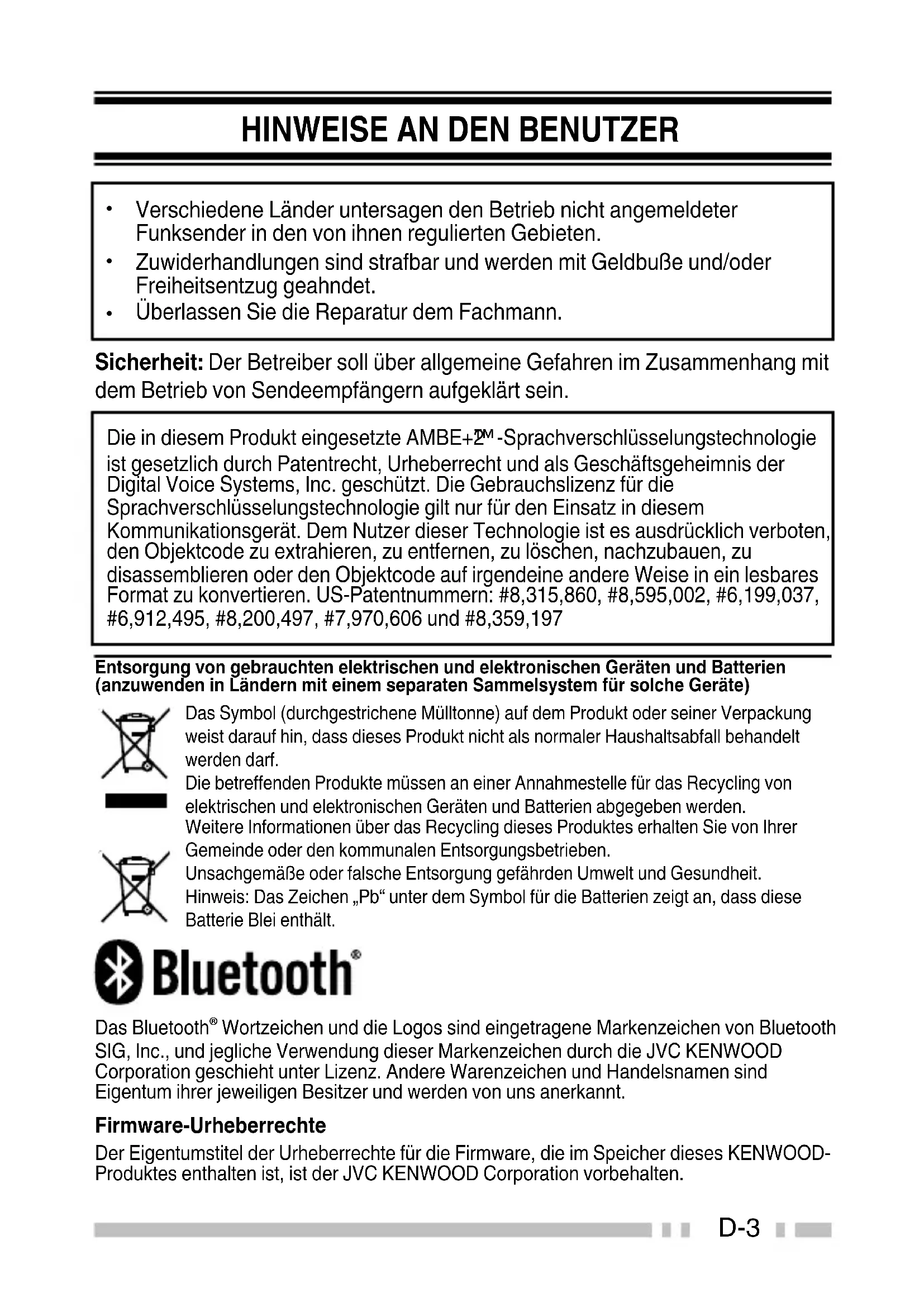 Das Bluetooth Wortzeichen und die Logos sind eingetragene Markenzeichen von BluetoothSIG, Inc., und jegliche Verwendung dieser Markenzeichen durch die JVC KENWOODCorporation geschieht unter Lizenz. Andere Warenzeichen und Handelsnamen sindEigentum ihrer jeweiligen Besitzer und werden von uns anerkannt. Firmware-Urheberrechte Der Eigentumstitel der Urheberrechte für die Firmware, die im Speicher dieses KENWOOD-Produktes enthalten ist, ist der JVC KENWOOD Corporation vorbehalten. D-3VORSICHTSMASSREGELN