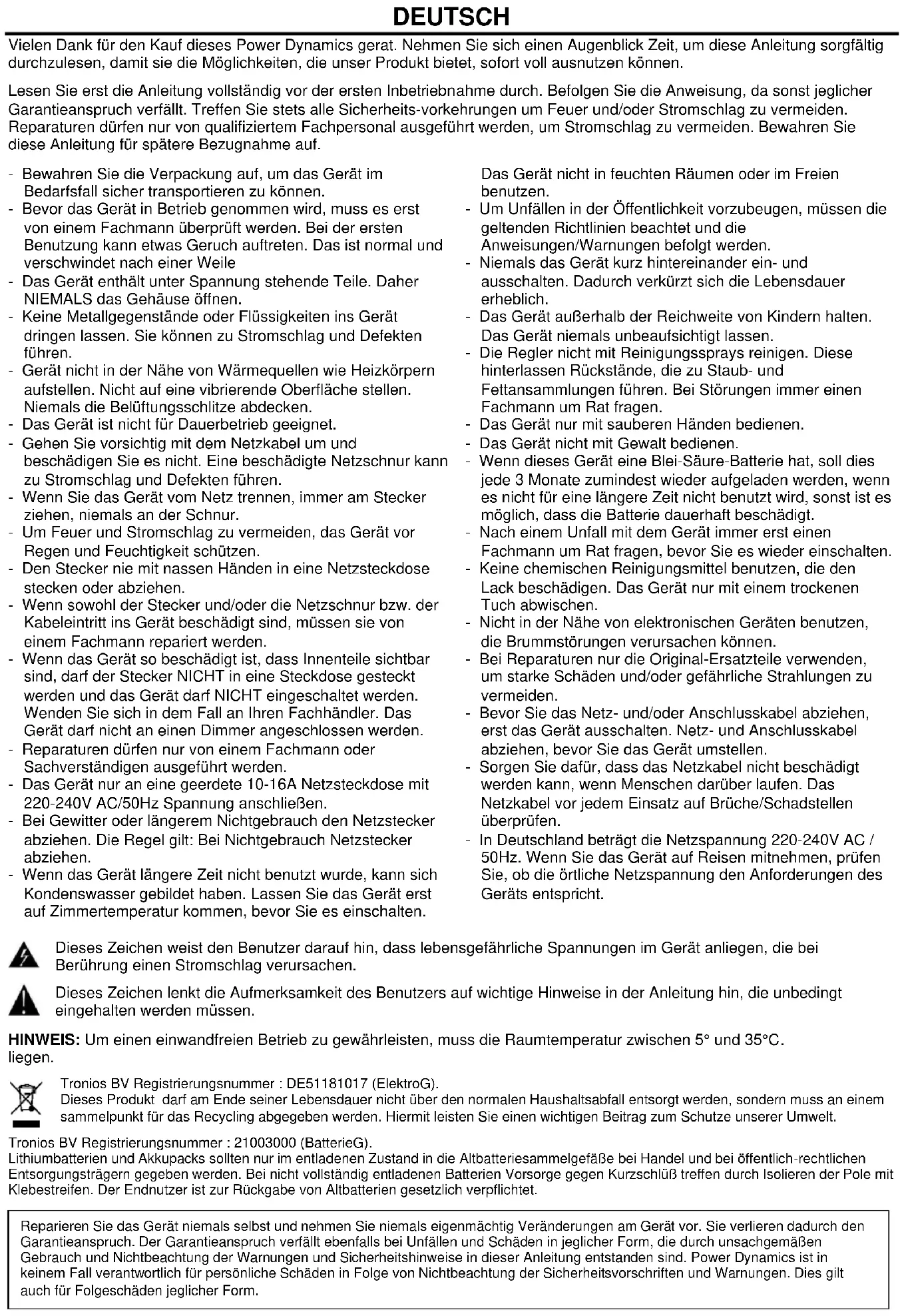 - Markeer tijdens de soundcheck storingsgebieden en vraag de presentatoren of artiest om die gebieden te vermijden. HEADSET MICROFOON Verbind de connector van de meegeleverde headsetmicrofoon met de aansluit connector van de zender. Plaats de microfoon van de headset ongeveer 15mm van de opening van uw mond.DEUTSCH Vielen Dank für den Kauf dieses Power Dynamics gerat. Nehmen Sie sich einen Augenblick Zeit, um diese Anleitung sorgfältig durchzulesen, damit sie die Möglichkeiten, die unser Produkt bietet, sofort voll ausnutzen können. Lesen Sie erst die Anleitung vollständig vor der ersten Inbetriebnahme durch. Befolgen Sie die Anweisung, da sonst jeglicher Garantieanspruch verfällt. Treffen Sie stets alle Sicherheits-vorkehrungen um Feuer und/oder Stromschlag zu vermeiden. Reparaturen dürfen nur von qualifiziertem Fachpersonal ausgeführt werden, um Stromschlag zu vermeiden. Bewahren Sie diese Anleitung für spätere Bezugnahme auf. - Bewahren Sie die Verpackung auf, um das Gerät im Bedarfsfall sicher transportieren zu können. - Bevor das Gerät in Betrieb genommen wird, muss es erst von einem Fachmann überprüft werden. Bei der ersten Benutzung kann etwas Geruch auftreten. Das ist normal und verschwindet nach einer Weile - Das Gerät enthält unter Spannung stehende Teile. Daher NIEMALS das Gehäuse öffnen. - Keine Metallgegenstände oder Flüssigkeiten ins Gerät dringen lassen. Sie können zu Stromschlag und Defekten führen. - Gerät nicht in der Nähe von Wärmequellen wie Heizkörpern aufstellen. Nicht auf eine vibrierende Oberfläche stellen. Niemals die Belüftungsschlitze abdecken. - Das Gerät ist nicht für Dauerbetrieb geeignet. - Gehen Sie vorsichtig mit dem Netzkabel um und beschädigen Sie es nicht. Eine beschädigte Netzschnur kann zu Stromschlag und Defekten führen. - Wenn Sie das Gerät vom Netz trennen, immer am Stecker ziehen, niemals an der Schnur. - Um Feuer und Stromschlag zu vermeiden, das Gerät vor Regen und Feuchtigkeit schützen. - Den Stecker nie mit nassen Händen in eine Netzsteckdose stecken oder abziehen. - Wenn sowohl der Stecker und/oder die Netzschnur bzw. der Kabeleintritt ins Gerät beschädigt sind, müssen sie von einem Fachmann repariert werden. - Wenn das Gerät so beschädigt ist, dass Innenteile sichtbar sind, darf der Stecker NICHT in eine Steckdose gesteckt werden und das Gerät darf NICHT eingeschaltet werden. Wenden Sie sich in dem Fall an Ihren Fachhändler. Das Gerät darf nicht an einen Dimmer angeschlossen werden. - Reparaturen dürfen nur von einem Fachmann oder Sachverständigen ausgeführt werden. - Das Gerät nur an eine geerdete 10-16A Netzsteckdose mit 220-240V AC/50Hz Spannung anschließen. - Bei Gewitter oder längerem Nichtgebrauch den Netzstecker abziehen. Die Regel gilt: Bei Nichtgebrauch Netzstecker abziehen. - Wenn das Gerät längere Zeit nicht benutzt wurde, kann sich Kondenswasser gebildet haben. Lassen Sie das Gerät erst auf Zimmertemperatur kommen, bevor Sie es einschalten. Das Gerät nicht in feuchten Räumen oder im Freien benutzen. - Um Unfällen in der Öffentlichkeit vorzubeugen, müssen die geltenden Richtlinien beachtet und die Anweisungen/Warnungen befolgt werden. - Niemals das Gerät kurz hintereinander ein- und ausschalten. Dadurch verkürzt sich die Lebensdauer erheblich. - Das Gerät außerhalb der Reichweite von Kindern halten. Das Gerät niemals unbeaufsichtigt lassen. - Die Regler nicht mit Reinigungssprays reinigen. Diese hinterlassen Rückstände, die zu Staub- und Fettansammlungen führen. Bei Störungen immer einen Fachmann um Rat fragen. - Das Gerät nur mit sauberen Händen bedienen. - Das Gerät nicht mit Gewalt bedienen. - Wenn dieses Gerät eine Blei-Säure-Batterie hat, soll dies jede 3 Monate zumindest wieder aufgeladen werden, wenn es nicht für eine längere Zeit nicht benutzt wird, sonst ist es möglich, dass die Batterie dauerhaft beschädigt. - Nach einem Unfall mit dem Gerät immer erst einen Fachmann um Rat fragen, bevor Sie es wieder einschalten. - Keine chemischen Reinigungsmittel benutzen, die den Lack beschädigen. Das Gerät nur mit einem trockenen Tuch abwischen. - Nicht in der Nähe von elektronischen Geräten benutzen, die Brummstörungen verursachen können. - Bei Reparaturen nur die Original-Ersatzteile verwenden, um starke Schäden und/oder gefährliche Strahlungen zu vermeiden. - Bevor Sie das Netz- und/oder Anschlusskabel abziehen, erst das Gerät ausschalten. Netz- und Anschlusskabel abziehen, bevor Sie das Gerät umstellen. - Sorgen Sie dafür, dass das Netzkabel nicht beschädigt werden kann, wenn Menschen darüber laufen. Das Netzkabel vor jedem Einsatz auf Brüche/Schadstellen überprüfen. - In Deutschland beträgt die Netzspannung 220-240V AC / 50Hz. Wenn Sie das Gerät auf Reisen mitnehmen, prüfen Sie, ob die örtliche Netzspannung den Anforderungen des Geräts entspricht. Dieses Zeichen weist den Benutzer darauf hin, dass lebensgefährliche Spannungen im Gerät anliegen, die bei Berührung einen Stromschlag verursachen. Dieses Zeichen lenkt die Aufmerksamkeit des Benutzers auf wichtige Hinweise in der Anleitung hin, die unbedingt eingehalten werden müssen. HINWEIS: Um einen einwandfreien Betrieb zu gewährleisten, muss die Raumtemperatur zwischen 5° und 35°C. liegen. Tronios BV Registrierungsnummer : DE51181017 (ElektroG). Dieses Produkt darf am Ende seiner Lebensdauer nicht über den normalen Haushaltsabfall entsorgt werden, sondern muss an einem sammelpunkt für das Recycling abgegeben werden. Hiermit leisten Sie einen wichtigen Beitrag zum Schutze unserer Umwelt. Tronios BV Registrierungsnummer : 21003000 (BatterieG). Lithiumbatterien und Akkupacks sollten nur im entladenen Zustand in die Altbatteriesammelgefäße bei Handel und bei öffentlich-rechtlichen Entsorgungsträgern gegeben werden. Bei nicht vollständig entladenen Batterien Vorsorge gegen Kurzschlüß treffen durch Isolieren der Pole mit Klebestreifen. Der Endnutzer ist zur Rückgabe v