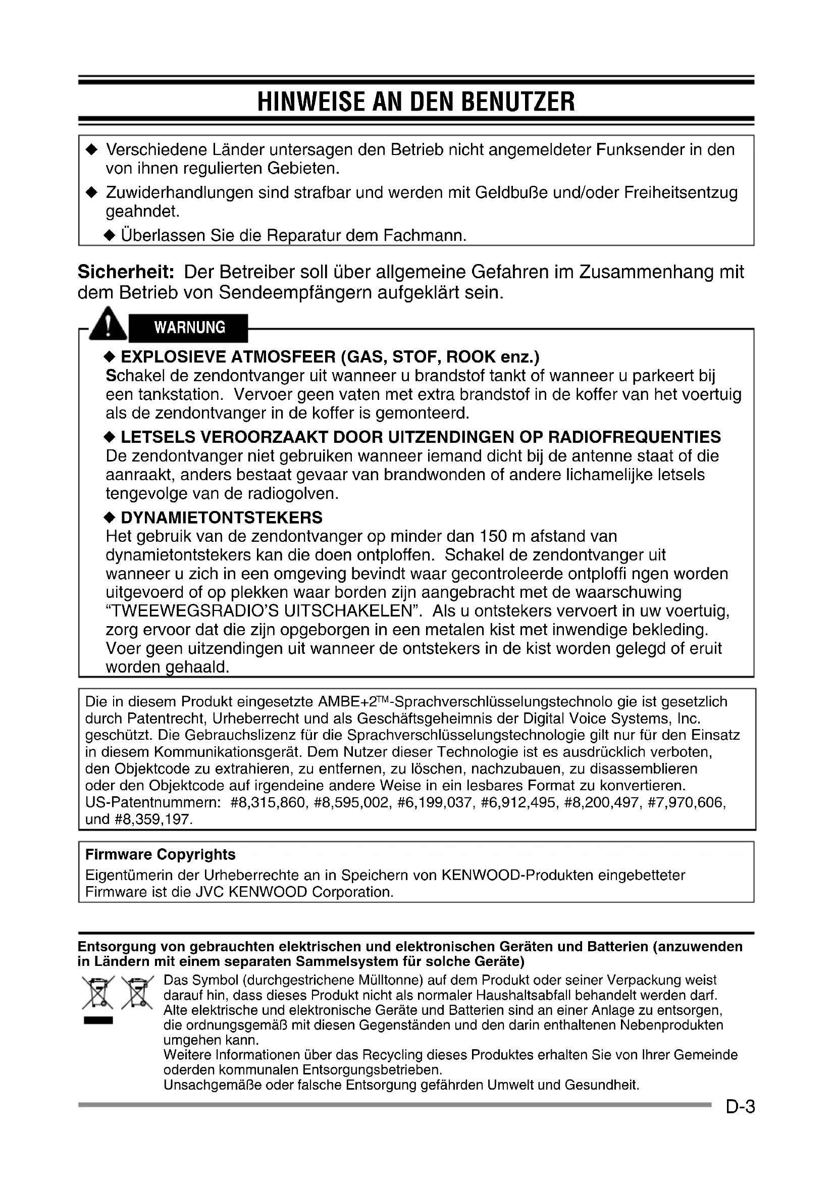 -Sprachverschlüsselungstechnolo gie ist gesetzlich durch Patentrecht, Urheberrecht und als Geschäftsgeheimnis der Digital Voice Systems, Inc. geschützt. Die Gebrauchslizenz für die Sprachverschlüsselungstechnologie gilt nur für den Einsatz in diesem Kommunikationsgerät. Dem Nutzer dieser Technologie ist es ausdrücklich verboten, den Objektcode zu extrahieren, zu entfernen, zu löschen, nachzubauen, zu disassemblieren oder den Objektcode auf irgendeine andere Weise in ein lesbares Format zu konvertieren. US-Patentnummern: #8,315,860, #8,595,002, #6,199,037, #6,912,495, #8,200,497, #7,970,606, und #8,359,197. Firmware Copyrights Eigentümerin der Urheberrechte an in Speichern von KENWOOD-Produkten eingebetteter Firmware ist die JVC KENWOOD Corporation. Entsorgung von gebrauchten elektrischen und elektronischen Geräten und Batterien (anzuwenden in Ländern mit einem separaten Sammelsystem für solche Geräte) Das Symbol (durchgestrichene Mülltonne) auf dem Produkt oder seiner Verpackung weist darauf hin, dass dieses Produkt nicht als normaler Haushaltsabfall behandelt werden darf. Alte elektrische und elektronische Geräte und Batterien sind an einer Anlage zu entsorgen, die ordnungsgemäß mit diesen Gegenständen und den darin enthaltenen Nebenprodukten umgehen kann. Weitere Informationen über das Recycling dieses Produktes erhalten Sie von Ihrer Gemeinde oderden kommunalen Entsorgungsbetrieben. Unsachgemäße oder falsche Entsorgung gefährden Umwelt und Gesundheit.D-4 VORSICHTSMASSREGELN Verhüten Sie Feuer, Personen- und Sachschäden: