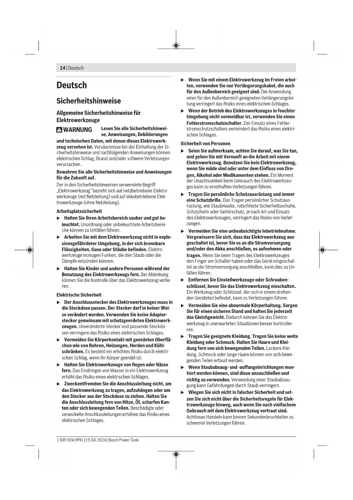 (58) (60) (28) (3) (61) Bosch Power Tools 1 609 92A 9PK | (19.04.2024)14 | Deutsch Deutsch Sicherheitshinweise Allgemeine Sicherheitshinweise für Elektrowerkzeuge WARNUNG Lesen Sie alle Sicherheitshinwei- se, Anweisungen, Bebilderungen und technischen Daten, mit denen dieses Elektrowerk- zeug versehen ist. Versäumnisse bei der Einhaltung der Si- cherheitshinweise und nachfolgenden Anweisungen können elektrischen Schlag, Brand und/oder schwere Verletzungen verursachen. Bewahren Sie alle Sicherheitshinweise und Anweisungen für die Zukunft auf. Der in den Sicherheitshinweisen verwendete Begriff „Elektrowerkzeug“ bezieht sich auf netzbetriebene Elektro- werkzeuge (mit Netzleitung) und auf akkubetriebene Elek- trowerkzeuge (ohne Netzleitung). Arbeitsplatzsicherheit u Halten Sie Ihren Arbeitsbereich sauber und gut be- leuchtet. Unordnung oder unbeleuchtete Arbeitsberei- che können zu Unfällen führen. u Arbeiten Sie mit dem Elektrowerkzeug nicht in explo- sionsgefährdeter Umgebung, in der sich brennbare Flüssigkeiten, Gase oder Stäube befinden. Elektro- werkzeuge erzeugen Funken, die den Staub oder die Dämpfe entzünden können. u Halten Sie Kinder und andere Personen während der Benutzung des Elektrowerkzeugs fern. Bei Ablenkung können Sie die Kontrolle über das Elektrowerkzeug verlie- ren. Elektrische Sicherheit u Der Anschlussstecker des Elektrowerkzeuges muss in die Steckdose passen. Der Stecker darf in keiner Wei- se verändert werden. Verwenden Sie keine Adapter- stecker gemeinsam mit schutzgeerdeten Elektrowerk- zeugen. Unveränderte Stecker und passende Steckdo- sen verringern das Risiko eines elektrischen Schlages. u Vermeiden Sie Körperkontakt mit geerdeten Oberflä- chen wie von Rohren, Heizungen, Herden und Kühl- schränken. Es besteht ein erhöhtes Risiko durch elektri- schen Schlag, wenn Ihr Körper geerdet ist. u Halten Sie Elektrowerkzeuge von Regen oder Nässe fern. Das Eindringen von Wasser in ein Elektrowerkzeug erhöht das Risiko eines elektrischen Schlages. u Zweckentfremden Sie die Anschlussleitung nicht, um das Elektrowerkzeug zu tragen, aufzuhängen oder um den Stecker aus der Steckdose zu ziehen. Halten Sie die Anschlussleitung fern von Hitze, Öl, scharfen Kan- ten oder sich bewegenden Teilen. Beschädigte oder verwickelte Anschlussleitungen erhöhen das Risiko eines elektrischen Schlages. u Wenn Sie mit einem Elektrowerkzeug im Freien arbei- ten, verwenden Sie nur Verlängerungskabel, die auch für den Außenbereich geeignet sind. Die Anwendung einer für den Außenbereich geeigneten Verlängerungslei- tung verringert das Risiko eines elektrischen Schlages. u Wenn der Betrieb des Elektrowerkzeuges in feuchter Umgebung nicht vermeidbar ist, verwenden Sie einen Fehlerstromschutzschalter. Der Einsatz eines Fehler- stromschutzschalters vermindert das Risiko eines elektri- schen Schlages. Sicherheit von Personen u Seien Sie aufmerksam, achten Sie darauf, was Sie tun, und gehen Sie mit Vernunft an die Arbeit mit einem Elektrowerkzeug. Benutzen Sie kein Elektrowerkzeug, wenn Sie müde sind oder unter dem Einfluss von Dro- gen, Alkohol oder Medikamenten stehen. Ein Moment der Unachtsamkeit beim Gebrauch des Elektrowerkzeu- ges kann zu ernsthaften Verletzungen führen. u Tragen Sie persönliche Schutzausrüstung und immer eine Schutzbrille. Das Tragen persönlicher Schutzaus- rüstung, wie Staubmaske, rutschfeste Sicherheitsschuhe, Schutzhelm oder Gehörschutz, je nach Art und Einsatz des Elektrowerkzeuges, verringert das Risiko von Verlet- zungen. u Vermeiden Sie eine unbeabsichtigte Inbetriebnahme. Vergewissern Sie sich, dass das Elektrowerkzeug aus- geschaltet ist, bevor Sie es an die Stromversorgung und/oder den Akku anschließen, es aufnehmen oder tragen. Wenn Sie beim Tragen des Elektrowerkzeuges den Finger am Schalter haben oder das Gerät eingeschal- tet an die Stromversorgung anschließen, kann dies zu Un- fällen führen. u Entfernen Sie Einstellwerkzeuge oder Schrauben- schlüssel, bevor Sie das Elektrowerkzeug einschalten. Ein Werkzeug oder Schlüssel, der sich in einem drehen- den Geräteteil befindet, kann zu Verletzungen führen. u Vermeiden Sie eine abnormale Körperhaltung. Sorgen Sie für einen sicheren Stand und halten Sie jederzeit das Gleichgewicht. Dadurch können Sie das Elektro- werkzeug in unerwarteten Situationen besser kontrollie- ren. u Tragen Sie geeignete Kleidung. Tragen Sie keine weite Kleidung oder Schmuck. Halten Sie Haare und Klei- dung fern von sich bewegenden Teilen. Lockere Klei- dung, Schmuck oder lange Haare können von sich bewe- genden Teilen erfasst werden. u Wenn Staubabsaug- und -auffangeinrichtungen mon- tiert werden können, sind diese anzuschließen und richtig zu verwenden. Verwendung einer Staubabsau- gung kann Gefährdungen durch Staub verringern. u Wiegen Sie sich nicht in falscher Sicherheit und set- zen Sie sich nicht über die Sicherheitsregeln für Elek- trowerkzeuge hinweg, auch wenn Sie nach vielfachem Gebrauch mit dem Elektrowerkzeug vertraut sind. Achtloses Handeln kann binnen Sekundenbruchteilen zu schweren Verletzungen führen. 1 609 92A 9PK | (19.04.2024) Bosch Power ToolsDeutsch | 15 Verwendung und Behandlung des Elektrowerkzeugs u Überlasten Sie das Elektrowerkzeug nicht. Verwenden Sie für Ihre Arbeit das dafür bestimmte Elektrowerk- zeug. Mit dem passenden Elektrowerkzeug arbeiten Sie besser und sicherer im angegebenen Leistungsbereich. u Benutzen Sie kein Elektrowerkzeug, dessen Schalter defekt ist. Ein Elektrowerkzeug, das sich nicht mehr ein- oder ausschalten lässt, ist gefährlich und muss repariert werden. u Ziehen Sie den Stecker aus der Steckdose und/oder entfernen Sie einen abnehmbaren Akku, bevor Sie Ge- räteeinstellungen vornehmen, Einsatzwerkzeugteile wechseln oder das Elektrowerkzeug weglegen. Diese Vorsichtsmaßnahme verhindert den unbeabsichtigten Start des Elektrowerkzeuges. u Bewahren Sie unbenutzte Elektrowerkzeuge außer- halb der Reichweite von Kindern auf. Lassen Sie 