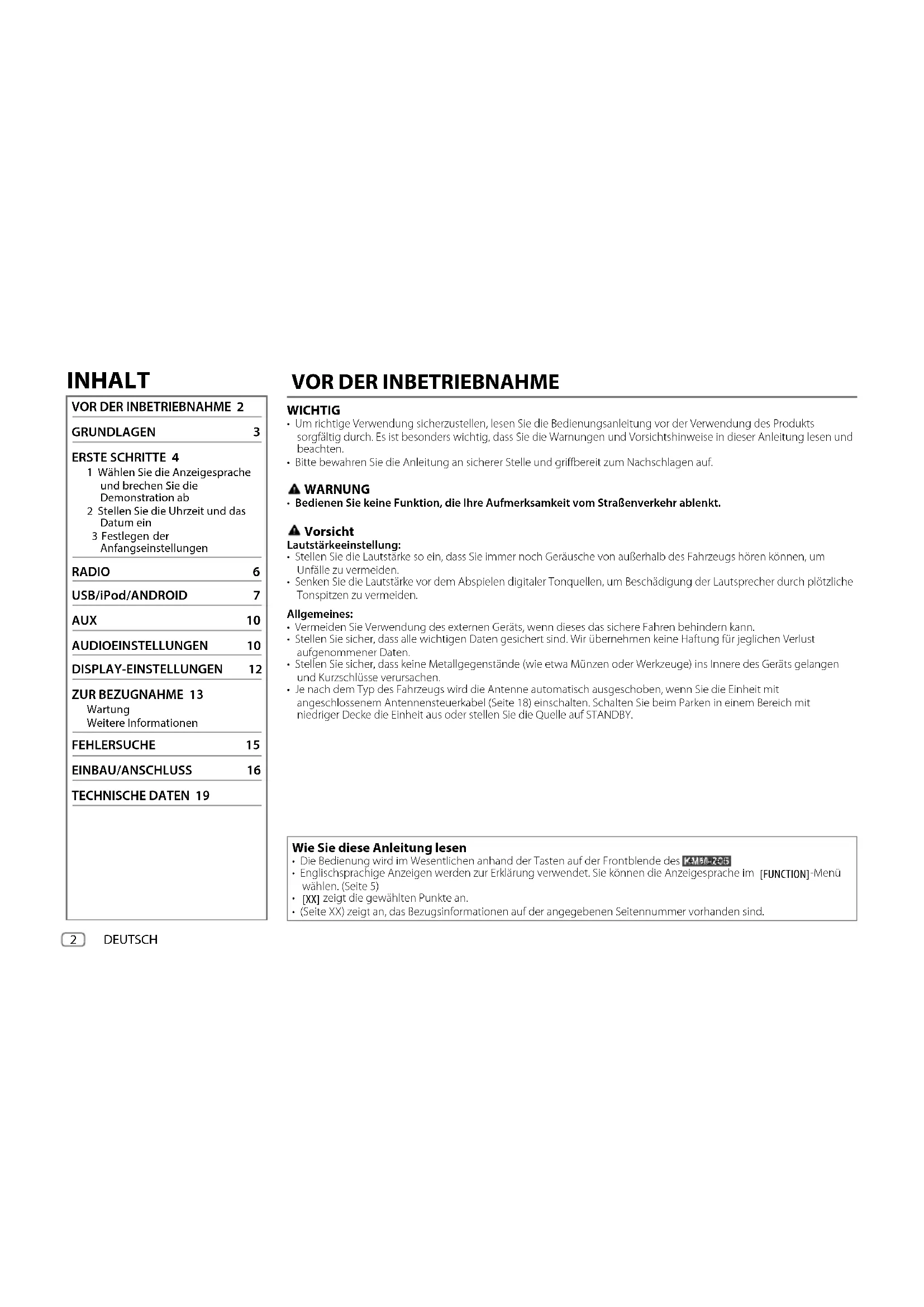 GRUNDLAGEN 3 ERSTE SCHRITTE 4 1 Wählen Sie die Anzeigesprache und brechen Sie die Demonstration ab 2 Stellen Sie die Uhrzeit und das Datum ein 3 Festlegen der Anfangseinstellungen RADIO 6 USB/iPod/ANDROID 7 AUX 10 AUDIOEINSTELLUNGEN 10 DISPLAY-EINSTELLUNGEN 12 ZUR BEZUGNAHME 13 Wartung Weitere Informationen FEHLERSUCHE 15 EINBAU/ANSCHLUSS 16 TECHNISCHE DATEN 19 Wie Sie diese Anleitung lesen