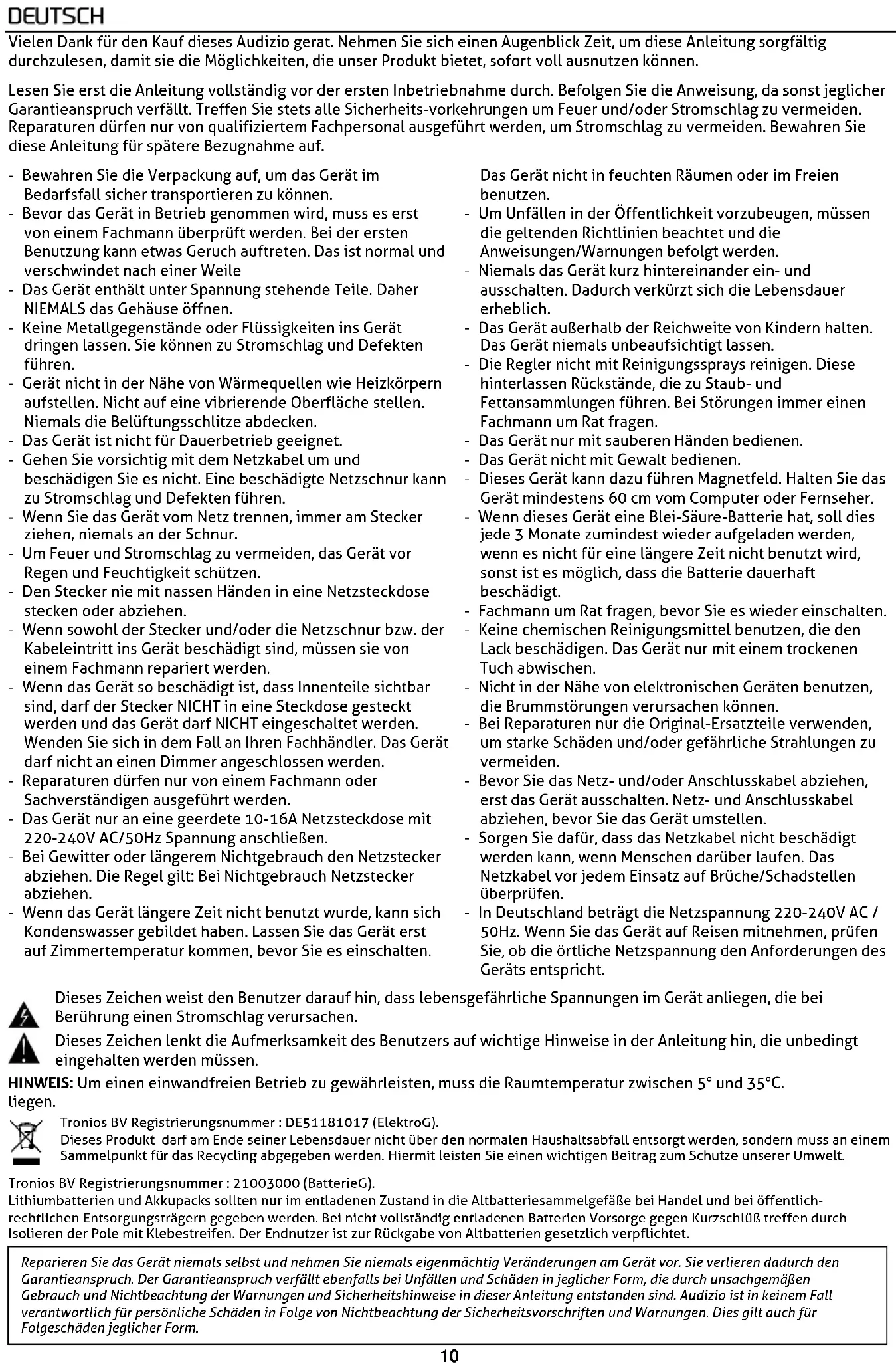 weergave te regelen.10 Vielen Dank für den Kauf dieses Audizio gerat. Nehmen Sie sich einen Augenblick Zeit, um diese Anleitung sorgfältig durchzulesen, damit sie die Möglichkeiten, die unser Produkt bietet, sofort voll ausnutzen können. Lesen Sie erst die Anleitung vollständig vor der ersten Inbetriebnahme durch. Befolgen Sie die Anweisung, da sonst jeglicher Garantieanspruch verfällt. Treffen Sie stets alle Sicherheits-vorkehrungen um Feuer und/oder Stromschlag zu vermeiden. Reparaturen dürfen nur von qualifiziertem Fachpersonal ausgeführt werden, um Stromschlag zu vermeiden. Bewahren Sie diese Anleitung für spätere Bezugnahme auf. - Bewahren Sie die Verpackung auf, um das Gerät im Bedarfsfall sicher transportieren zu können. - Bevor das Gerät in Betrieb genommen wird, muss es erst von einem Fachmann überprüft werden. Bei der ersten Benutzung kann etwas Geruch auftreten. Das ist normal und verschwindet nach einer Weile - Das Gerät enthält unter Spannung stehende Teile. Daher NIEMALS das Gehäuse öffnen. - Keine Metallgegenstände oder Flüssigkeiten ins Gerät dringen lassen. Sie können zu Stromschlag und Defekten führen. - Gerät nicht in der Nähe von Wärmequellen wie Heizkörpern aufstellen. Nicht auf eine vibrierende Oberfläche stellen. Niemals die Belüftungsschlitze abdecken. - Das Gerät ist nicht für Dauerbetrieb geeignet. - Gehen Sie vorsichtig mit dem Netzkabel um und beschädigen Sie es nicht. Eine beschädigte Netzschnur kann zu Stromschlag und Defekten führen. - Wenn Sie das Gerät vom Netz trennen, immer am Stecker ziehen, niemals an der Schnur. - Um Feuer und Stromschlag zu vermeiden, das Gerät vor Regen und Feuchtigkeit schützen. - Den Stecker nie mit nassen Händen in eine Netzsteckdose stecken oder abziehen. - Wenn sowohl der Stecker und/oder die Netzschnur bzw. der Kabeleintritt ins Gerät beschädigt sind, müssen sie von einem Fachmann repariert werden. - Wenn das Gerät so beschädigt ist, dass Innenteile sichtbar sind, darf der Stecker NICHT in eine Steckdose gesteckt werden und das Gerät darf NICHT eingeschaltet werden. Wenden Sie sich in dem Fall an Ihren Fachhändler. Das Gerät darf nicht an einen Dimmer angeschlossen werden. - Reparaturen dürfen nur von einem Fachmann oder Sachverständigen ausgeführt werden. - Das Gerät nur an eine geerdete 10-16A Netzsteckdose mit 220-240V AC/50Hz Spannung anschließen. - Bei Gewitter oder längerem Nichtgebrauch den Netzstecker abziehen. Die Regel gilt: Bei Nichtgebrauch Netzstecker abziehen. - Wenn das Gerät längere Zeit nicht benutzt wurde, kann sich Kondenswasser gebildet haben. Lassen Sie das Gerät erst auf Zimmertemperatur kommen, bevor Sie es einschalten. Das Gerät nicht in feuchten Räumen oder im Freien benutzen. - Um Unfällen in der Öffentlichkeit vorzubeugen, müssen die geltenden Richtlinien beachtet und die Anweisungen/Warnungen befolgt werden. - Niemals das Gerät kurz hintereinander ein- und ausschalten. Dadurch verkürzt sich die Lebensdauer erheblich. - Das Gerät außerhalb der Reichweite von Kindern halten. Das Gerät niemals unbeaufsichtigt lassen. - Die Regler nicht mit Reinigungssprays reinigen. Diese hinterlassen Rückstände, die zu Staub- und Fettansammlungen führen. Bei Störungen immer einen Fachmann um Rat fragen. - Das Gerät nur mit sauberen Händen bedienen. - Das Gerät nicht mit Gewalt bedienen. - Dieses Gerät kann dazu führen Magnetfeld. Halten Sie das Gerät mindestens 60 cm vom Computer oder Fernseher. - Wenn dieses Gerät eine Blei-Säure-Batterie hat, soll dies jede 3 Monate zumindest wieder aufgeladen werden, wenn es nicht für eine längere Zeit nicht benutzt wird, sonst ist es möglich, dass die Batterie dauerhaft beschädigt. - Fachmann um Rat fragen, bevor Sie es wieder einschalten. - Keine chemischen Reinigungsmittel benutzen, die den Lack beschädigen. Das Gerät nur mit einem trockenen Tuch abwischen. - Nicht in der Nähe von elektronischen Geräten benutzen, die Brummstörungen verursachen können. - Bei Reparaturen nur die Original-Ersatzteile verwenden, um starke Schäden und/oder gefährliche Strahlungen zu vermeiden. - Bevor Sie das Netz- und/oder Anschlusskabel abziehen, erst das Gerät ausschalten. Netz- und Anschlusskabel abziehen, bevor Sie das Gerät umstellen. - Sorgen Sie dafür, dass das Netzkabel nicht beschädigt werden kann, wenn Menschen darüber laufen. Das Netzkabel vor jedem Einsatz auf Brüche/Schadstellen überprüfen. - In Deutschland beträgt die Netzspannung 220-240V AC / 50Hz. Wenn Sie das Gerät auf Reisen mitnehmen, prüfen Sie, ob die örtliche Netzspannung den Anforderungen des Geräts entspricht. Dieses Zeichen weist den Benutzer darauf hin, dass lebensgefährliche Spannungen im Gerät anliegen, die bei Berührung einen Stromschlag verursachen. Dieses Zeichen lenkt die Aufmerksamkeit des Benutzers auf wichtige Hinweise in der Anleitung hin, die unbedingt eingehalten werden müssen. HINWEIS: Um einen einwandfreien Betrieb zu gewährleisten, muss die Raumtemperatur zwischen 5° und 35°C. liegen. Tronios BV Registrierungsnummer : DE51181017 (ElektroG). Dieses Produkt darf am Ende seiner Lebensdauer nicht über den normalen Haushaltsabfall entsorgt werden, sondern muss an einem Sammelpunkt für das Recycling abgegeben werden. Hiermit leisten Sie einen wichtigen Beitrag zum Schutze unserer Umwelt. Tronios BV Registrierungsnummer : 21003000 (BatterieG). Lithiumbatterien und Akkupacks sollten nur im entladenen Zustand in die Altbatteriesammelgefäße bei Handel und bei öffentlich- rechtlichen Entsorgungsträgern gegeben werden. Bei nicht vollständig entladenen Batterien Vorsorge gegen Kurzschlüß treffen durch Isolieren der Pole mit Klebestreifen. Der Endnutzer ist zur Rückgabe von Altbatterien gesetzlich verpflichtet.