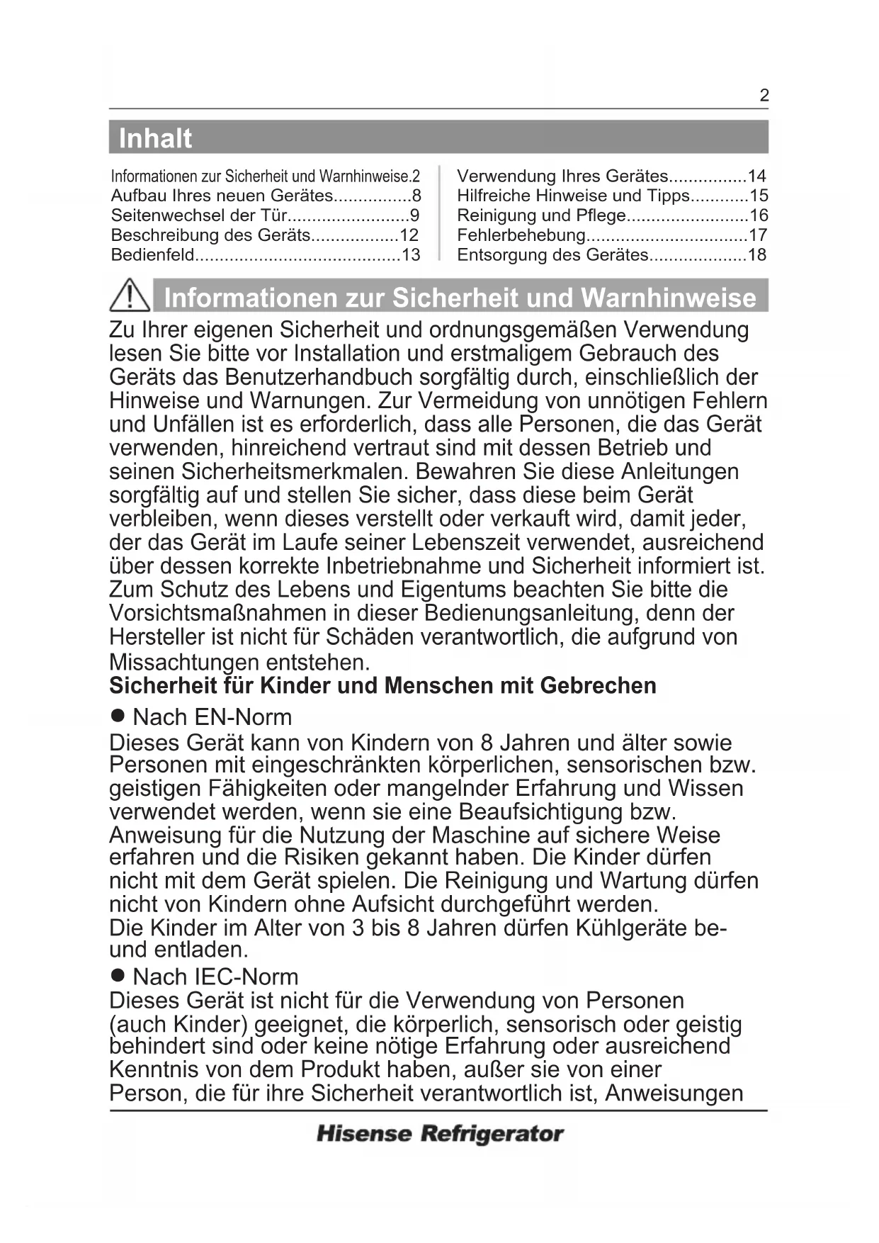 - Entsorgung des Gerätes Informationen zur Sicherheit und Warnhinweise Nach EN-Norm Dieses Gerät kann von Kindern von 8 Jahren und älter sowie Personen mit eingeschränkten körperlichen, sensorischen bzw. geistigen Fähigkeiten oder mangelnder Erfahrung und Wissen verwendet werden, wenn sie eine Beaufsichtigung bzw. Anweisung für die Nutzung der Maschine auf sichere Weise erfahren und die Risiken gekannt haben. Die Kinder dürfen nicht mit dem Gerät spielen. Die Reinigung und Wartung dürfen nicht von Kindern ohne Aufsicht durchgeführt werden. Die Kinder im Alter von 3 bis 8 Jahren dürfen Kühlgeräte be- und entladen. Nach IEC-Norm Dieses Gerät ist nicht für die Verwendung von Personen (auch Kinder) geeignet, die körperlich, sensorisch oder geistig behindert sind oder keine nötige Erfahrung oder ausreichend Kenntnis von dem Produkt haben, außer sie von einer Person, die für ihre Sicherheit verantwortlich ist, Anweisungen Zu Ihrer eigenen Sicherheit und ordnungsgemäßen Verwendung lesen Sie bitte vor Installation und erstmaligem Gebrauch des Geräts das Benutzerhandbuch sorgfältig durch, einschließlich der Hinweise und Warnungen. Zur Vermeidung von unnötigen Fehlern und Unfällen ist es erforderlich, dass alle Personen, die das Gerät verwenden, hinreichend vertraut sind mit dessen Betrieb und seinen Sicherheitsmerkmalen. Bewahren Sie diese Anleitungen sorgfältig auf und stellen Sie sicher, dass diese beim Gerät verbleiben, wenn dieses verstellt oder verkauft wird, damit jeder, der das Gerät im Laufe seiner Lebenszeit verwendet, ausreichend über dessen korrekte Inbetriebnahme und Sicherheit informiert ist. Zum Schutz des Lebens und Eigentums beachten Sie bitte die Vorsichtsmaßnahmen in dieser Bedienungsanleitung, denn der Hersteller ist nicht für Schäden verantwortlich, die aufgrund von Missachtungen entstehen. Sicherheit für Kinder und Menschen mit Gebrechen p. 18