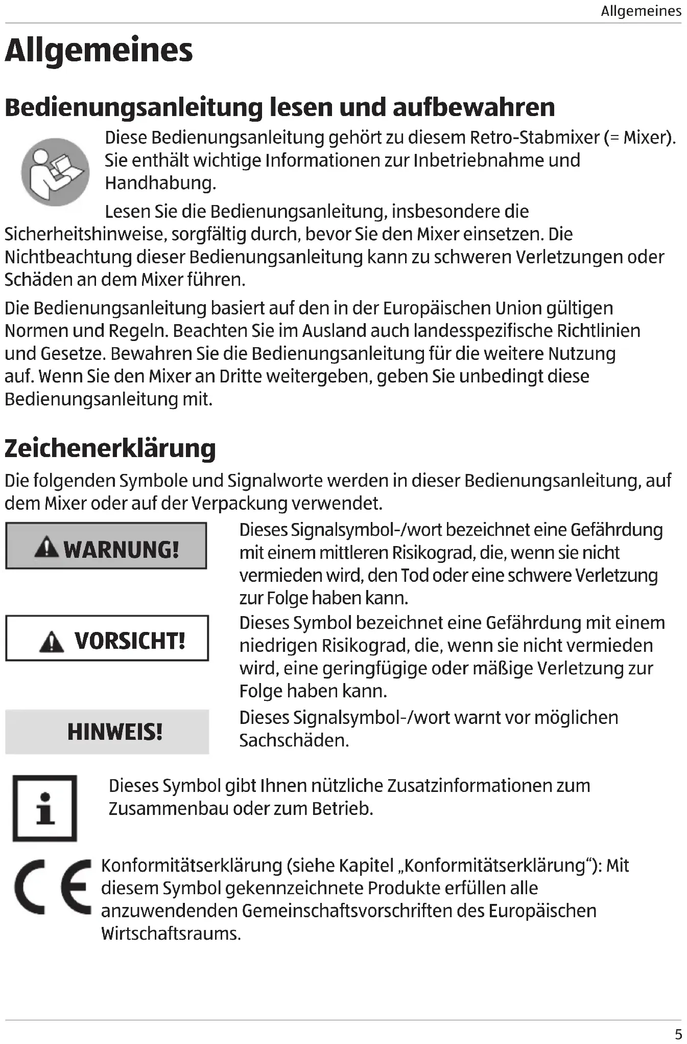 Allgemeines Bedienungsanleitung lesen und aufbewahren Diese Bedienungsanleitung gehört zu diesem Retro-Stabmixer (= Mixer). Sie enthält wichtige Informationen zur Inbetriebnahme und Handhabung. Lesen Sie die Bedienungsanleitung, insbesondere die Sicherheitshinweise, sorgfältig durch, bevor Sie den Mixer einsetzen. Die Nichtbeachtung dieser Bedienungsanleitung kann zu schweren Verletzungen oder Schäden an dem Mixer führen. Die Bedienungsanleitung basiert auf den in der Europäischen Union gültigen Normen und Regeln. Beachten Sie im Ausland auch landesspezifische Richtlinien und Gesetze. Bewahren Sie die Bedienungsanleitung für die weitere Nutzung auf. Wenn Sie den Mixer an Dritte weitergeben, geben Sie unbedingt diese Bedienungsanleitung mit. Zeichenerklärung Die folgenden Symbole und Signalworte werden in dieser Bedienungsanleitung, auf dem Mixer oder auf der Verpackung verwendet. WARNUNG! Dieses Signalsymbol-/wort bezeichnet eine Gefährdung mit einem mittleren Risikograd, die, wenn sie nicht vermieden wird, den Tod oder eine schwere Verletzung zur Folge haben kann. VORSICHT! Dieses Symbol bezeichnet eine Gefährdung mit einem niedrigen Risikograd, die, wenn sie nicht vermieden wird, eine geringfügige oder mäßige Verletzung zur Folge haben kann. HINWEIS! Dieses Signalsymbol-/wort warnt vor möglichen Sachschäden. Dieses Symbol gibt Ihnen nützliche Zusatzinformationen zum Zusammenbau oder zum Betrieb. Konformitätserklärung (siehe Kapitel „Konformitätserklärung“): Mit diesem Symbol gekennzeichnete Produkte erfüllen alle anzuwendenden Gemeinschaftsvorschriften des Europäischen Wirtschaftsraums. Buch_CH_EDS Stabmixer .indb 5Buch_CH_EDS Stabmixer .indb 5 26.09.2022 11:46:1626.09.2022 11:46:16Sicherheit
