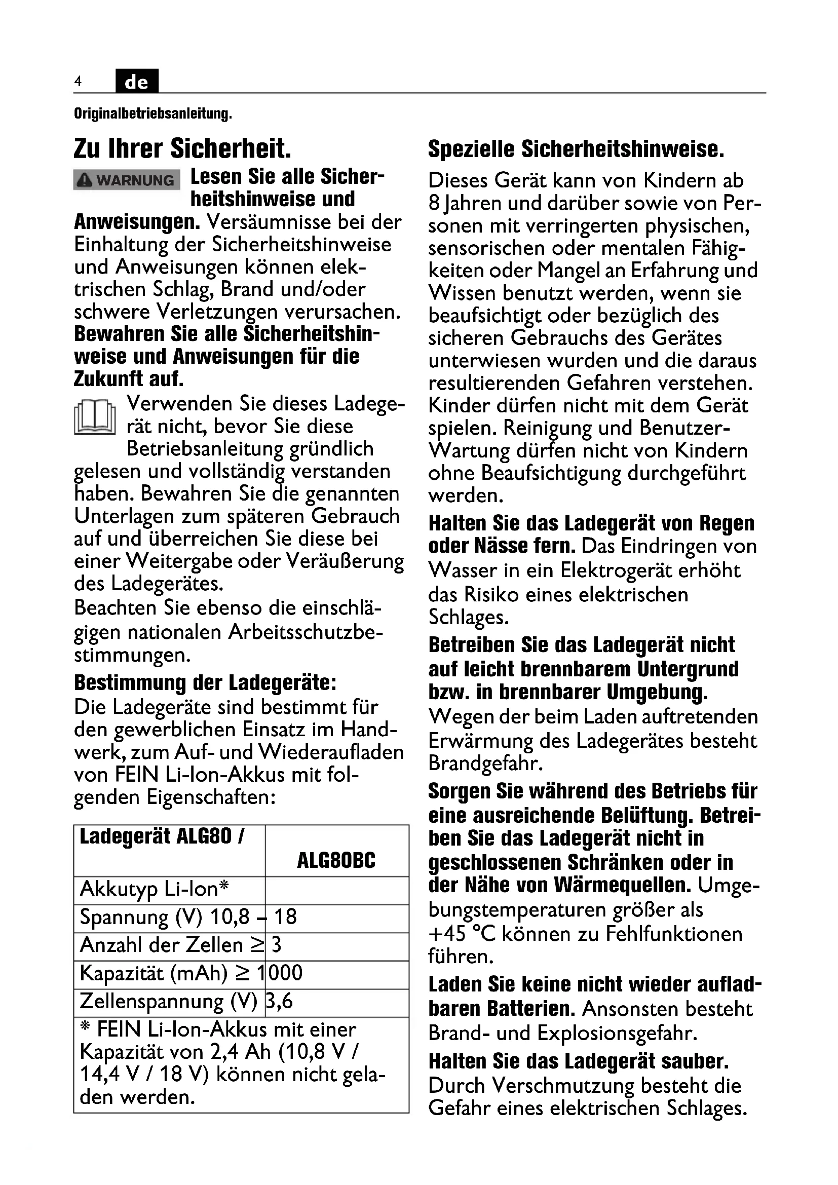 Originalbetriebsanleitung.Übersetzung der Originalbetriebsanleitung. Zu Ihrer Sicherheit. Lesen Sie alle Sicher- heitshinweise und Anweisungen. Versäumnisse bei der Einhaltung der Sicherheitshinweise und Anweisungen können elek- trischen Schlag, Brand und/oder schwere Verletzungen verursachen. Bewahren Sie alle Sicherheitshin- weise und Anweisungen für die Zukunft auf. Verwenden Sie dieses Ladege- rät nicht, bevor Sie diese Betriebsanleitung gründlich gelesen und vollständig verstanden haben. Bewahren Sie die genannten Unterlagen zum späteren Gebrauch auf und überreichen Sie diese bei einer Weitergabe oder Veräußerung des Ladegerätes. Beachten Sie ebenso die einschlä- gigen nationalen Arbeitsschutzbe- stimmungen. Bestimmung der Ladegeräte: Die Ladegeräte sind bestimmt für den gewerblichen Einsatz im Hand- werk, zum Auf- und Wiederaufladen von FEIN Li-Ion-Akkus mit fol- genden Eigenschaften: Spezielle Sicherheitshinweise. Dieses Gerät kann von Kindern ab 8 Jahren und darüber sowie von Per- sonen mit verringerten physischen, sensorischen oder mentalen Fähig- keiten oder Mangel an Erfahrung und Wissen benutzt werden, wenn sie beaufsichtigt oder bezüglich des sicheren Gebrauchs des Gerätes unterwiesen wurden und die daraus resultierenden Gefahren verstehen. Kinder dürfen nicht mit dem Gerät spielen. Reinigung und Benutzer- Wartung dürfen nicht von Kindern ohne Beaufsichtigung durchgeführt werden. Halten Sie das Ladegerät von Regen oder Nässe fern. Das Eindringen von Wasser in ein Elektrogerät erhöht das Risiko eines elektrischen Schlages. Betreiben Sie das Ladegerät nicht auf leicht brennbarem Untergrund bzw. in brennbarer Umgebung. Wegen der beim Laden auftretenden Erwärmung des Ladegerätes besteht Brandgefahr. Sorgen Sie während des Betriebs für eine ausreichende Belüftung. Betrei- ben Sie das Ladegerät nicht in geschlossenen Schränken oder in der Nähe von Wärmequellen. Umge- bungstemperaturen größer als +45 °C können zu Fehlfunktionen führen. Laden Sie keine nicht wieder auflad- baren Batterien. Ansonsten besteht Brand- und Explosionsgefahr. Halten Sie das Ladegerät sauber. Durch Verschmutzung besteht die Gefahr eines elektrischen Schlages. Ladegerät ALG80 / ALG80BC Akkutyp Li-Ion* Spannung (V) 10,8 – 18 Anzahl der Zellen ≥ 3 Kapazität (mAh) ≥ 1000 Zellenspannung (V) 3,6