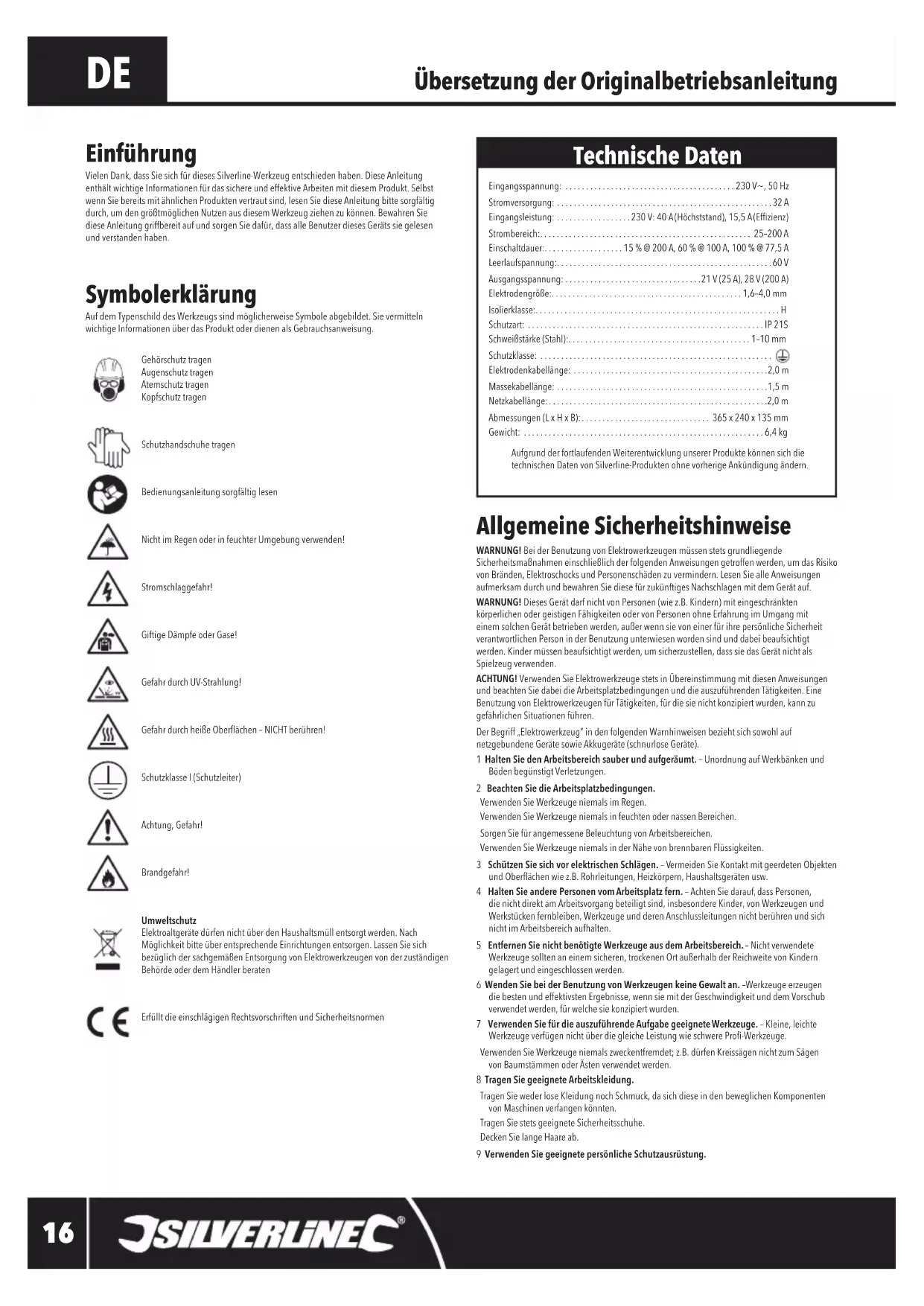 Allgemeine Sicherheitshinweise WARNUNG! Bei der Benutzung von Elektrowerkzeugen müssen stets grundliegende Sicherheitsmaßnahmen einschließlich der folgenden Anweisungen getroffen werden, um das Risiko von Bränden, Elektroschocks und Personenschäden zu vermindern. Lesen Sie alle Anweisungen aufmerksam durch und bewahren Sie diese für zukünftiges Nachschlagen mit dem Gerät auf.WARNUNG! Dieses Gerät darf nicht von Personen (wie z.B. Kindern) mit eingeschränkten körperlichen oder geistigen Fähigkeiten oder von Personen ohne Erfahrung im Umgang mit einem solchen Gerät betrieben werden, außer wenn sie von einer für ihre persönliche Sicherheit verantwortlichen Person in der Benutzung unterwiesen worden sind und dabei beaufsichtigt werden. Kinder müssen beaufsichtigt werden, um sicherzustellen, dass sie das Gerät nicht als Spielzeug verwenden.ACHTUNG! Verwenden Sie Elektrowerkzeuge stets in Übereinstimmung mit diesen Anweisungen und beachten Sie dabei die Arbeitsplatzbedingungen und die auszuführenden Tätigkeiten. Eine Benutzung von Elektrowerkzeugen für Tätigkeiten, für die sie nicht konzipiert wurden, kann zu gefährlichen Situationen führen.Der Begriff „Elektrowerkzeug” in den folgenden Warnhinweisen bezieht sich sowohl auf netzgebundene Geräte sowie Akkugeräte (schnurlose Geräte).1 Halten Sie den Arbeitsbereich sauber und aufgeräumt. – Unordnung auf Werkbänken und Böden begünstigt Verletzungen.2 Beachten Sie die Arbeitsplatzbedingungen. Verwenden Sie Werkzeuge niemals im Regen. Verwenden Sie Werkzeuge niemals in feuchten oder nassen Bereichen. Sorgen Sie für angemessene Beleuchtung von Arbeitsbereichen. Verwenden Sie Werkzeuge niemals in der Nähe von brennbaren Flüssigkeiten. 3 Schützen Sie sich vor elektrischen Schlägen. – Vermeiden Sie Kontakt mit geerdeten Objekten und Oberächen wie z.B. Rohrleitungen, Heizkörpern, Haushaltsgeräten usw. 4 Halten Sie andere Personen vom Arbeitsplatz fern. – Achten Sie darauf, dass Personen, die nicht direkt am Arbeitsvorgang beteiligt sind, insbesondere Kinder, von Werkzeugen und Werkstücken fernbleiben, Werkzeuge und deren Anschlussleitungen nicht berühren und sich nicht im Arbeitsbereich aufhalten. 5 Entfernen Sie nicht benötigte Werkzeuge aus dem Arbeitsbereich. – Nicht verwendete Werkzeuge sollten an einem sicheren, trockenen Ort außerhalb der Reichweite von Kindern gelagert und eingeschlossen werden.6 Wenden Sie bei der Benutzung von Werkzeugen keine Gewalt an. –Werkzeuge erzeugen die besten und effektivsten Ergebnisse, wenn sie mit der Geschwindigkeit und dem Vorschub verwendet werden, für welche sie konzipiert wurden. 7 Verwenden Sie für die auszuführende Aufgabe geeignete Werkzeuge. – Kleine, leichte Werkzeuge verfügen nicht über die gleiche Leistung wie schwere Pro-Werkzeuge. Verwenden Sie Werkzeuge niemals zweckentfremdet; z.B. dürfen Kreissägen nicht zum Sägen von Baumstämmen oder Ästen verwendet werden. 8 Tragen Sie geeignete Arbeitskleidung. Tragen Sie weder lose Kleidung noch Schmuck, da sich diese in den beweglichen Komponenten von Maschinen verfangen könnten. Tragen Sie stets geeignete Sicherheitsschuhe. Decken Sie lange Haare ab.9 Verwenden Sie geeignete persönliche Schutzausrüstung. Übersetzung der Originalbetriebsanleitung Symbolerklärung Auf dem Typenschild des Werkzeugs sind möglicherweise Symbole abgebildet. Sie vermitteln wichtige Informationen über das Produkt oder dienen als Gebrauchsanweisung. Gehörschutz tragen Augenschutz tragenAtemschutz tragenKopfschutz tragenSchutzhandschuhe tragenBedienungsanleitung sorgfältig lesenNicht im Regen oder in feuchter Umgebung verwenden!Stromschlaggefahr!Giftige Dämpfe oder Gase!Gefahr durch UV-Strahlung!Gefahr durch heiße Oberächen – NICHT berühren!Schutzklasse I (Schutzleiter)Achtung, Gefahr!Brandgefahr!Umweltschutz Elektroaltgeräte dürfen nicht über den Haushaltsmüll entsorgt werden. Nach Möglichkeit bitte über entsprechende Einrichtungen entsorgen. Lassen Sie sich bezüglich der sachgemäßen Entsorgung von Elektrowerkzeugen von der zuständigen Behörde oder dem Händler beratenErfüllt die einschlägigen Rechtsvorschriften und Sicherheitsnormen Einführung Vielen Dank, dass Sie sich für dieses Silverline-Werkzeug entschieden haben. Diese Anleitung enthält wichtige Informationen für das sichere und effektive Arbeiten mit diesem Produkt. Selbst wenn Sie bereits mit ähnlichen Produkten vertraut sind, lesen Sie diese Anleitung bitte sorgfältig durch, um den größtmöglichen Nutzen aus diesem Werkzeug ziehen zu können. Bewahren Sie diese Anleitung griffbereit auf und sorgen Sie dafür, dass alle Benutzer dieses Geräts sie gelesen und verstanden haben.
