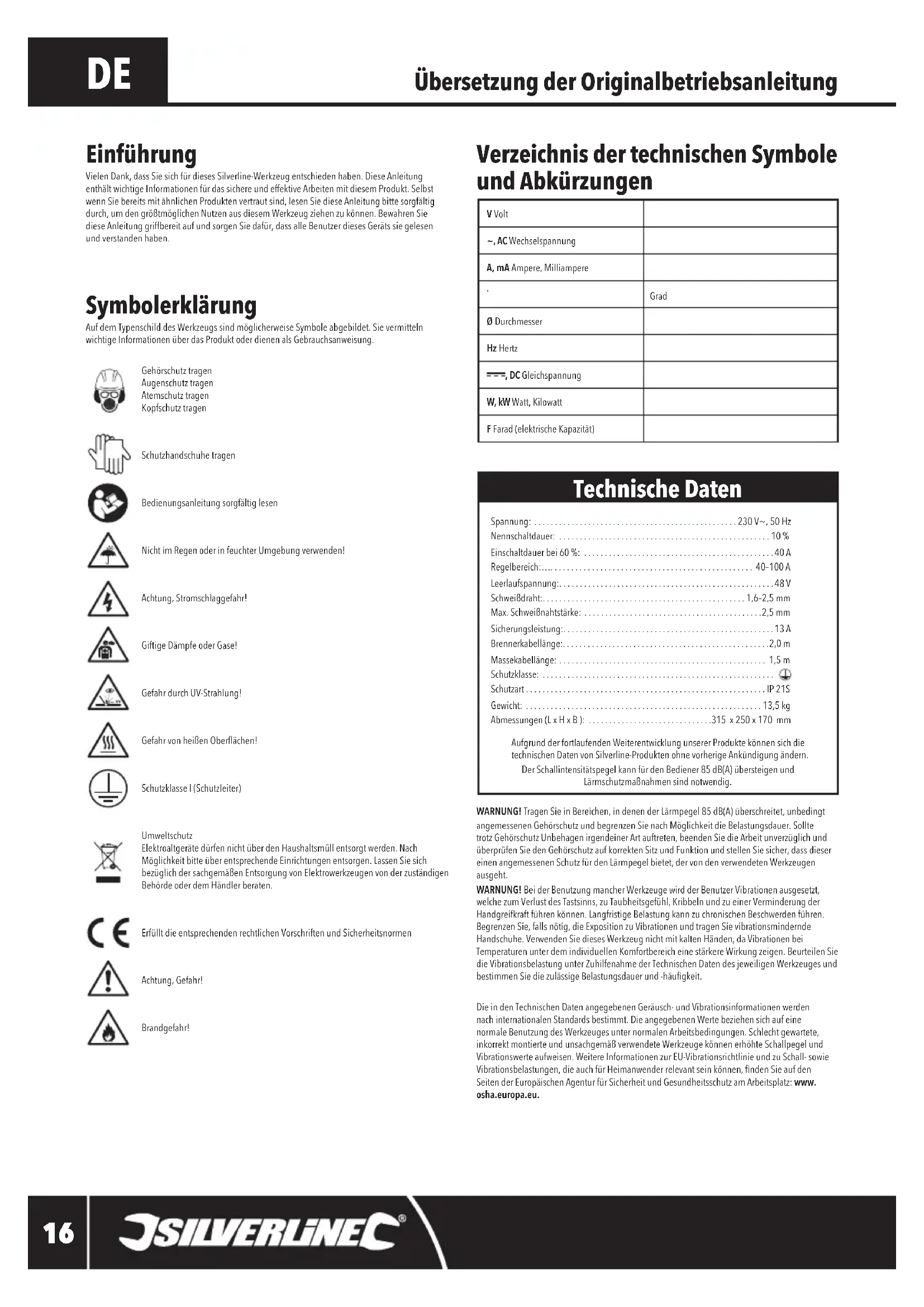 Laden Sie die Anleitung für Ihr Schweißgerät kostenlos im PDF-Format! Finden Sie Ihr Handbuch 677293 - SILVERLINE und nehmen Sie Ihr elektronisches Gerät wieder in die Hand. Auf dieser Seite sind alle Dokumente veröffentlicht, die für die Verwendung Ihres Geräts notwendig sind. 677293 von der Marke SILVERLINE.
