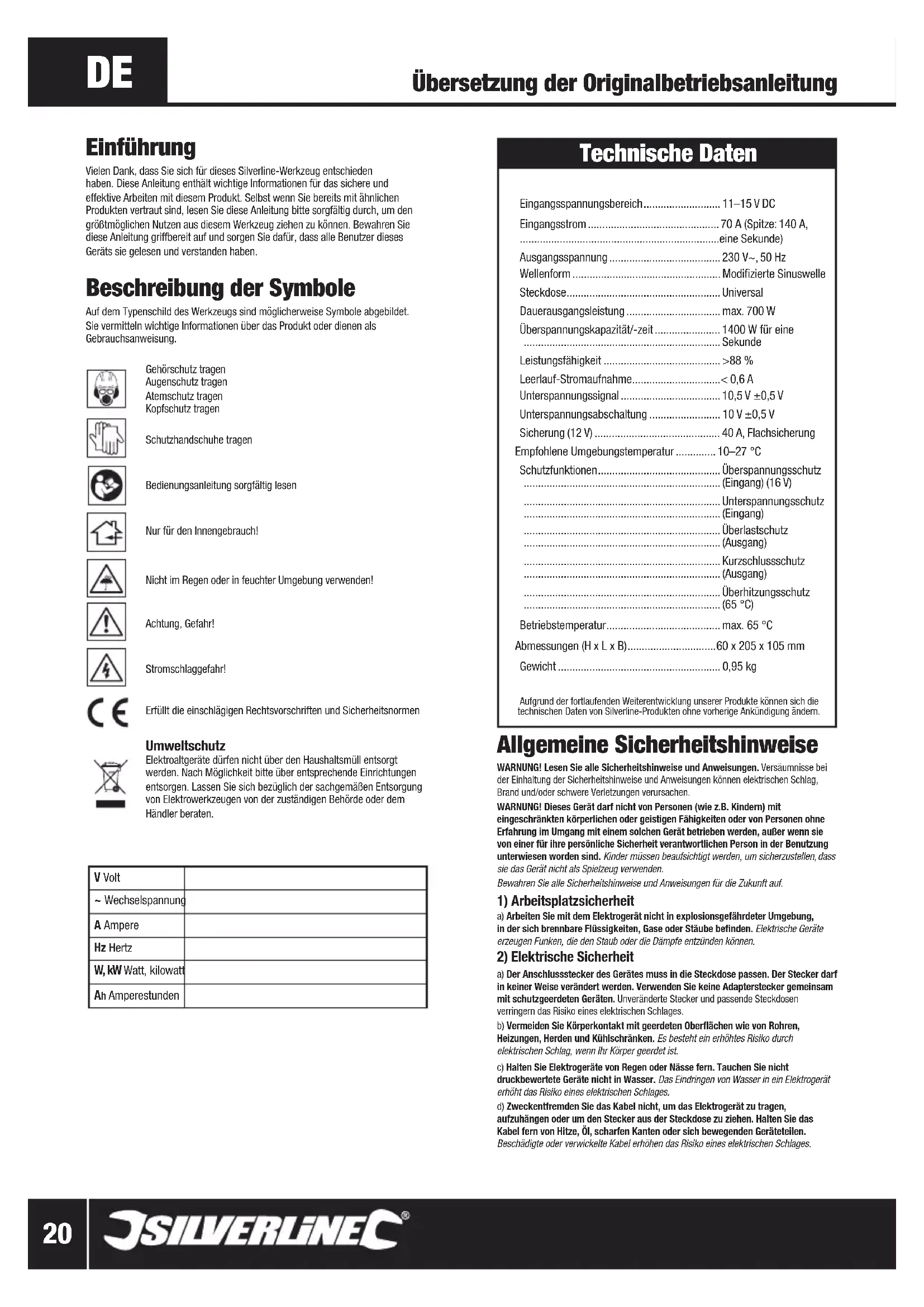 Beschreibung der Symbole Auf dem Typenschild des Werkzeugs sind möglicherweise Symbole abgebildet. Sie vermitteln wichtige Informationen über das Produkt oder dienen als Gebrauchsanweisung. Gehörschutz tragenAugenschutz tragenAtemschutz tragenKopfschutz tragen Schutzhandschuhe tragen Bedienungsanleitung sorgfältig lesen Nur für den Innengebrauch!Nicht im Regen oder in feuchter Umgebung verwenden!Achtung, Gefahr!Stromschlaggefahr!Erfüllt die einschlägigen Rechtsvorschriften und Sicherheitsnormen Umweltschutz Elektroaltgeräte dürfen nicht über den Haushaltsmüll entsorgt werden. Nach Möglichkeit bitte über entsprechende Einrichtungen entsorgen. Lassen Sie sich bezüglich der sachgemäßen Entsorgung von Elektrowerkzeugen von der zuständigen Behörde oder dem Händler beraten. T-130˚ Technische Daten Eingangsspannungsbereich ........................... 11–15 V DC Eingangsstrom .............................................. 70 A (Spitze: 140 A, ......................................................................eine Sekunde) Ausgangsspannung ....................................... 230 V~, 50 Hz Wellenform .................................................... Modifizierte Sinuswelle Steckdose ...................................................... Universal Dauerausgangsleistung ................................. max. 700 W Überspannungskapazität/-zeit ....................... 1400 W für eine ..................................................................... Sekunde Leistungsfähigkeit ......................................... >88 % Leerlauf-Stromaufnahme ............................... < 0,6 A Unterspannungssignal ................................... 10,5 V ±0,5 V Unterspannungsabschaltung ......................... 10 V ±0,5 V Sicherung (12 V) ............................................ 40 A, Flachsicherung Empfohlene Umgebungstemperatur .............. 10–27 °C Schutzfunktionen ........................................... Überspannungsschutz ..................................................................... (Eingang) (16 V) ..................................................................... Unterspannungsschutz ..................................................................... (Eingang) ..................................................................... Überlastschutz ..................................................................... (Ausgang) ..................................................................... Kurzschlussschutz ..................................................................... (Ausgang) ..................................................................... Überhitzungsschutz ..................................................................... (65 °C) Betriebstemperatur ........................................ max. 65 °C Abmessungen (H x L x B) ............................... 60 x 205 x 105 mm Gewicht ......................................................... 0,95 kg Aufgrund der fortlaufenden Weiterentwicklung unserer Produkte können sich die technischen Daten von Silverline-Produkten ohne vorherige Ankündigung ändern. V Volt ~ Wechselspannung A Ampere Hz Hertz W, kW Watt, kilowatt Ah Amperestunden Allgemeine Sicherheitshinweise WARNUNG! Lesen Sie alle Sicherheitshinweise und Anweisungen. Versäumnisse bei der Einhaltung der Sicherheitshinweise und Anweisungen können elektrischen Schlag, Brand und/oder schwere Verletzungen verursachen.WARNUNG! Dieses Gerät darf nicht von Personen (wie z.B. Kindern) mit eingeschränkten körperlichen oder geistigen Fähigkeiten oder von Personen ohne Erfahrung im Umgang mit einem solchen Gerät betrieben werden, außer wenn sie von einer für ihre persönliche Sicherheit verantwortlichen Person in der Benutzung unterwiesen worden sind. Kinder müssen beaufsichtigt werden, um sicherzustellen, dass sie das Gerät nicht als Spielzeug verwenden.Bewahren Sie alle Sicherheitshinweise und Anweisungen für die Zukunft auf.